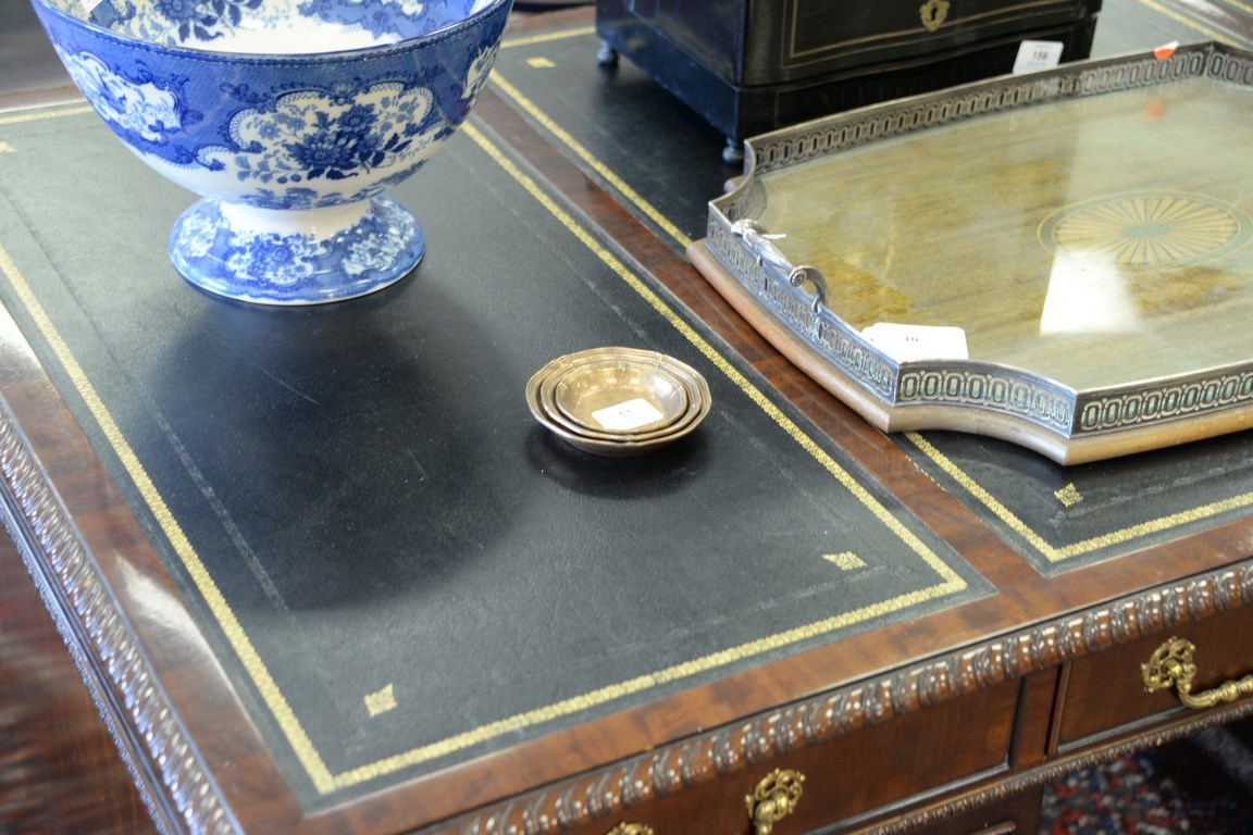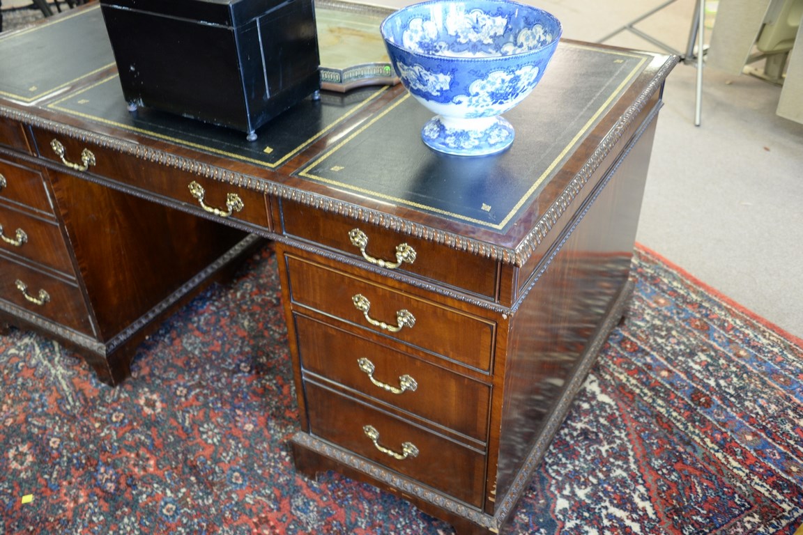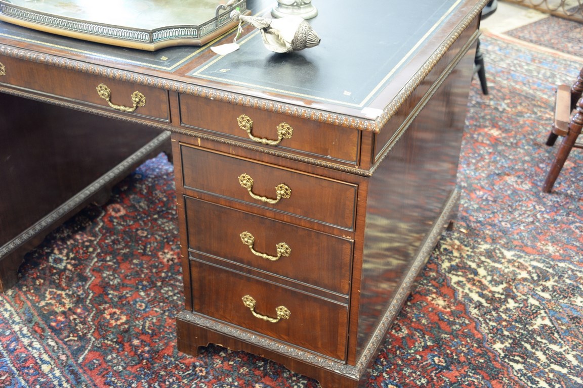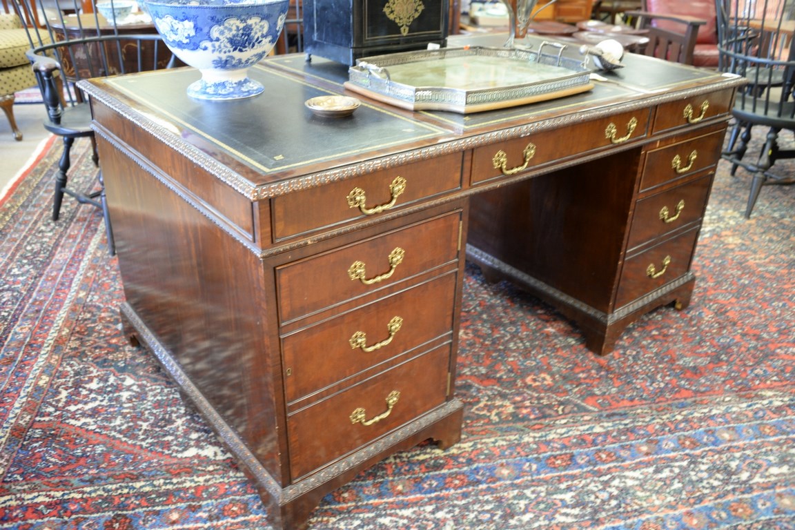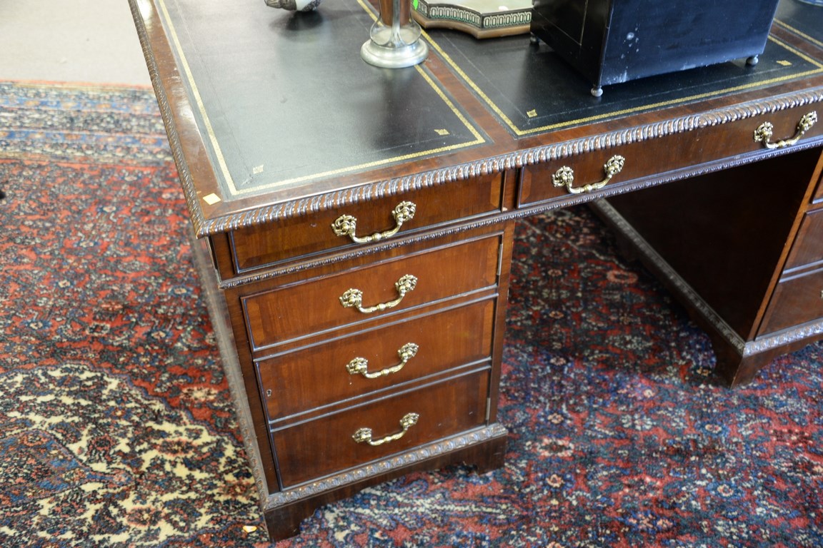 Maitland Smith mahogany partner’s desk with leather top. ht. 30 in. top: 36 x 62
