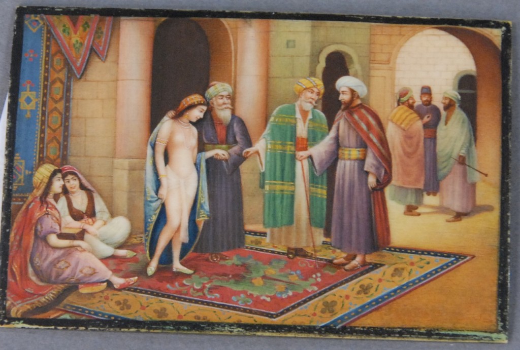 Miniature painting on ivory, Arab interior scene with nude woman. 2 1/2 x 3 1/2