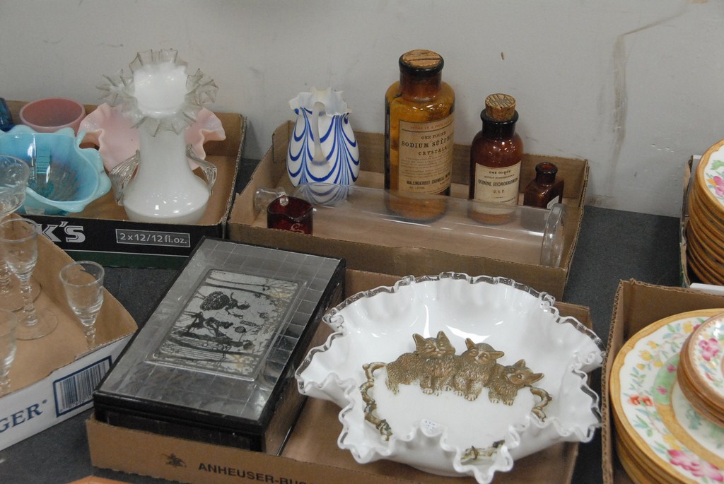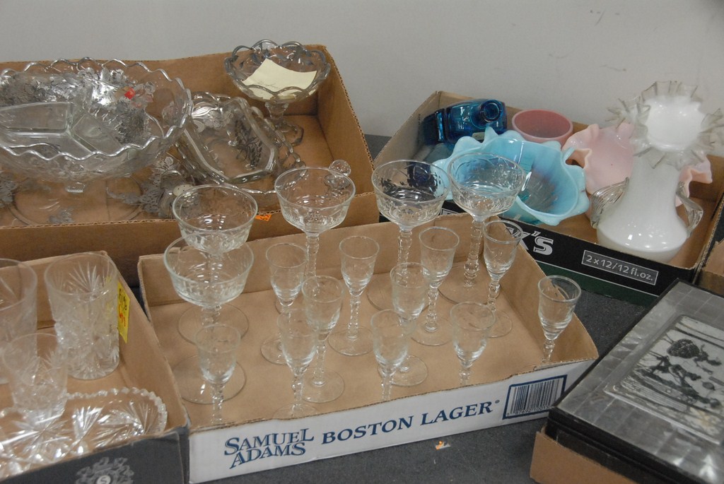 Nine box lots of clear glass, cut glass, art glass and pharmaceutical bottles.