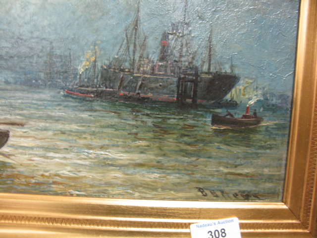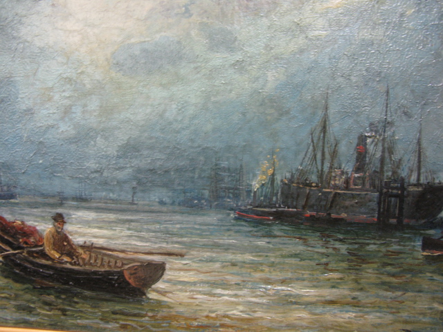 Oil on canvas signed B.E. Agny, of a ship at port and a man in a rowboat.