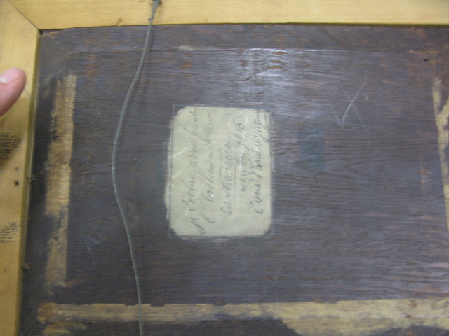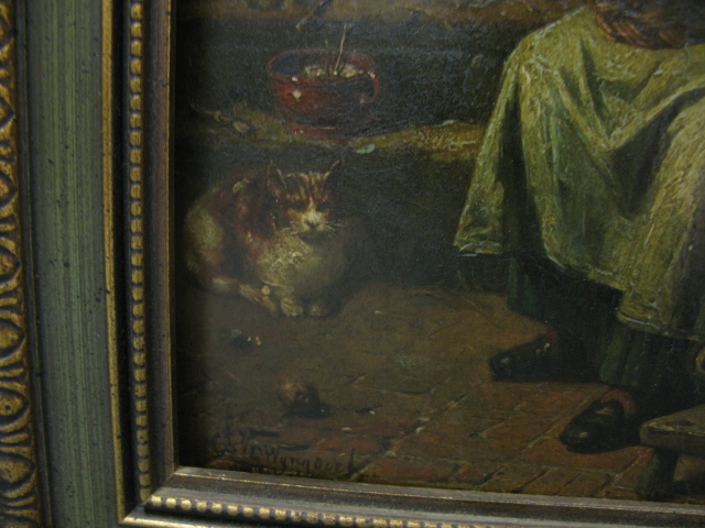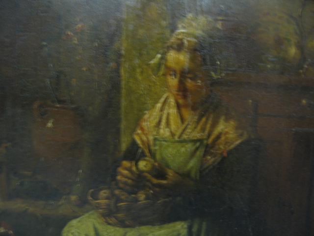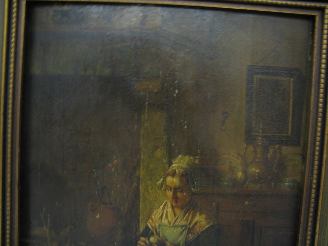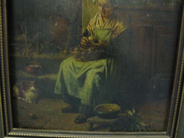 Oil on wood panel, interior scene with seated young woman peeling vegetables with fireplace and cat by her side, signed lower right indistinctly, probably Dutch School, writing on reverse.