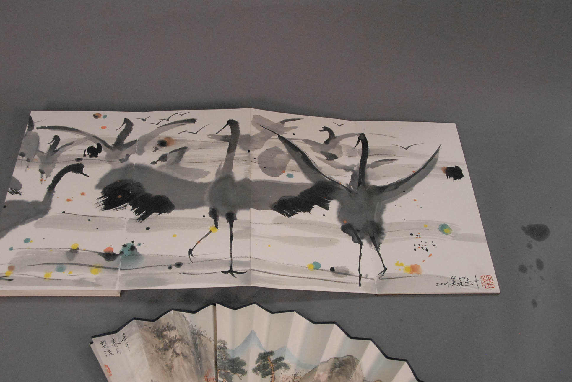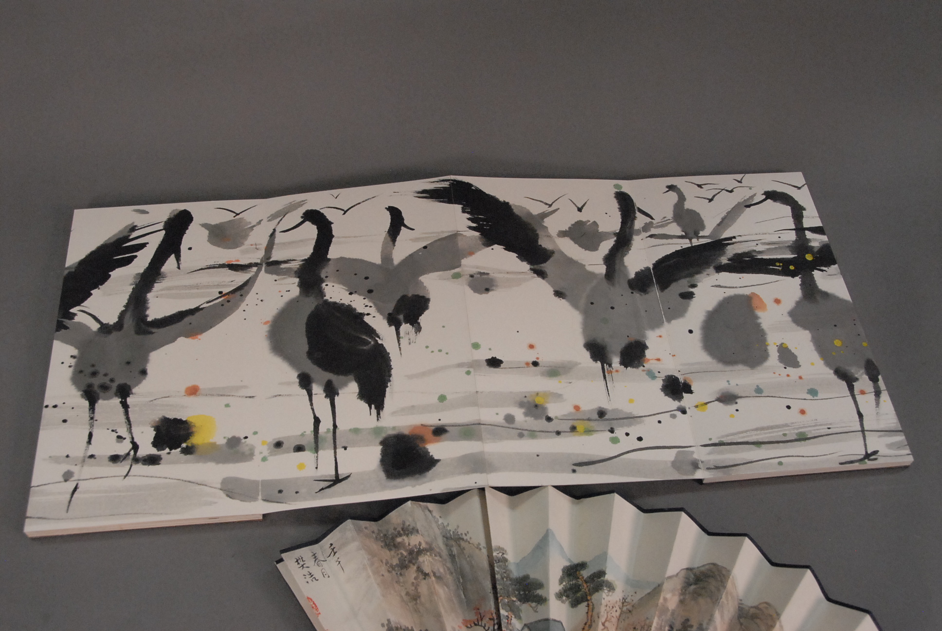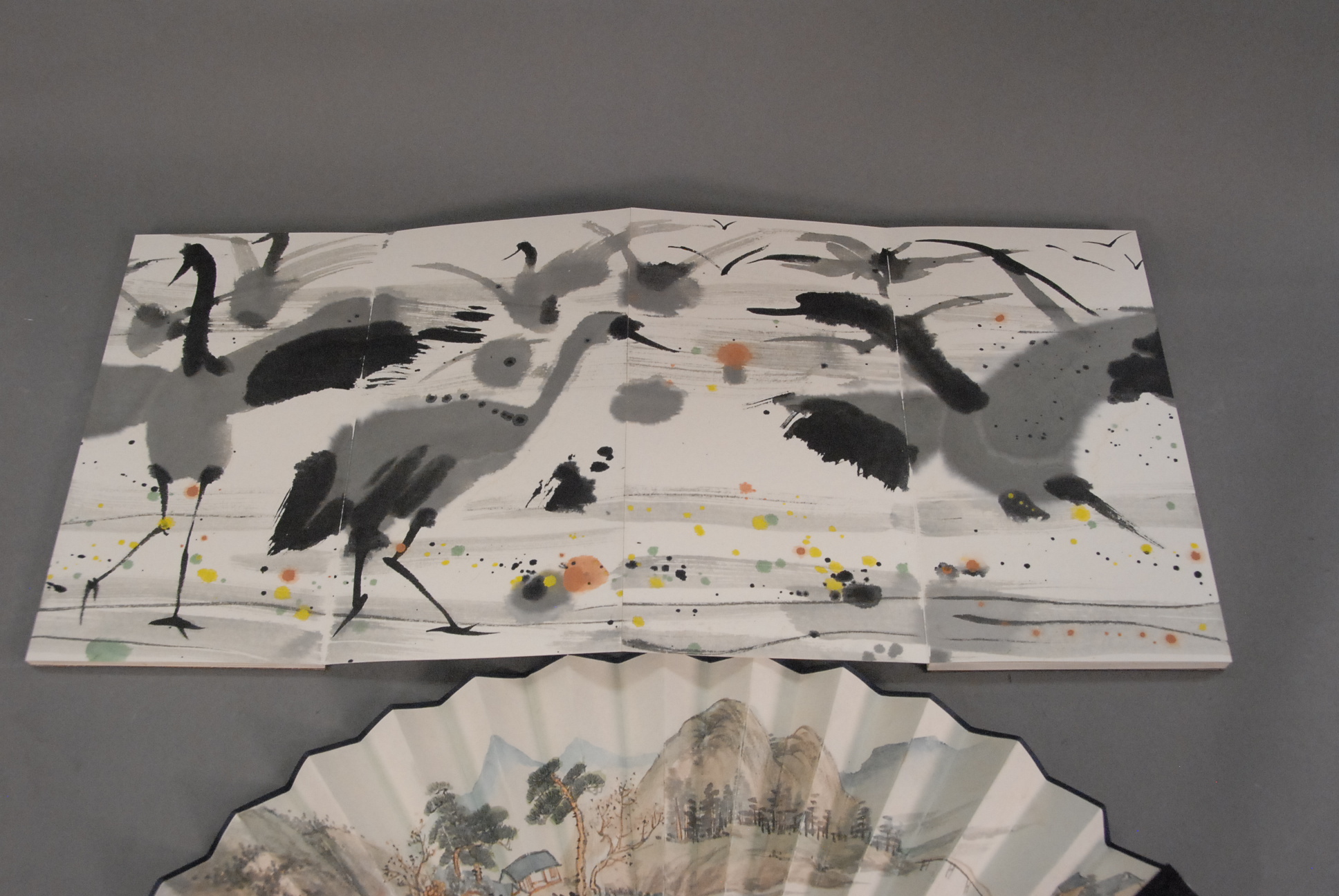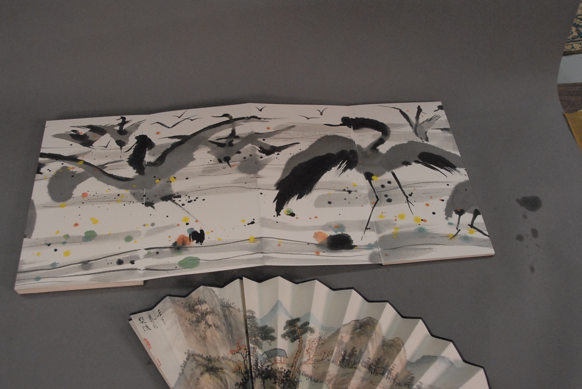 Oriental book of paintings of birds and hand painted fan with landscape scene.