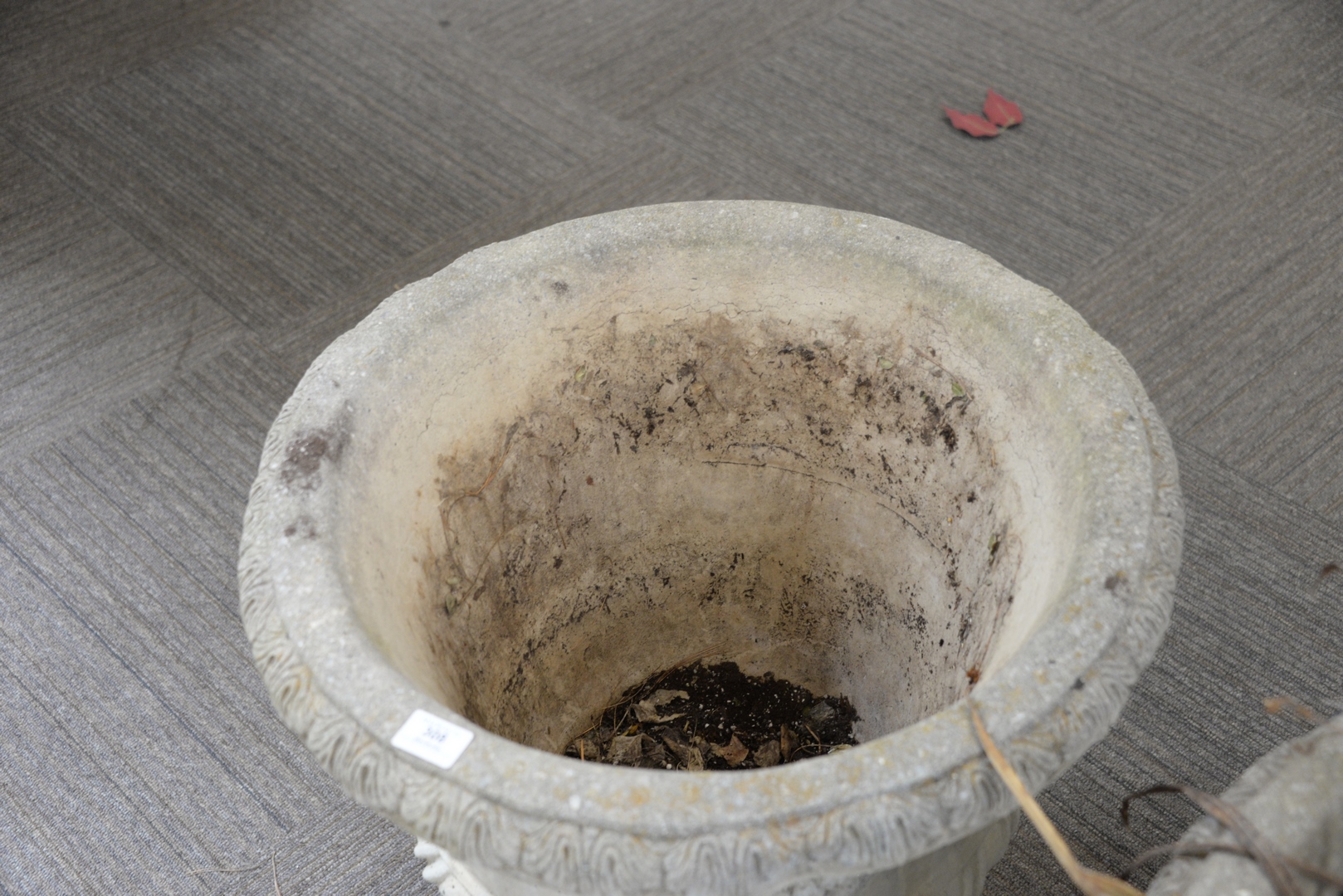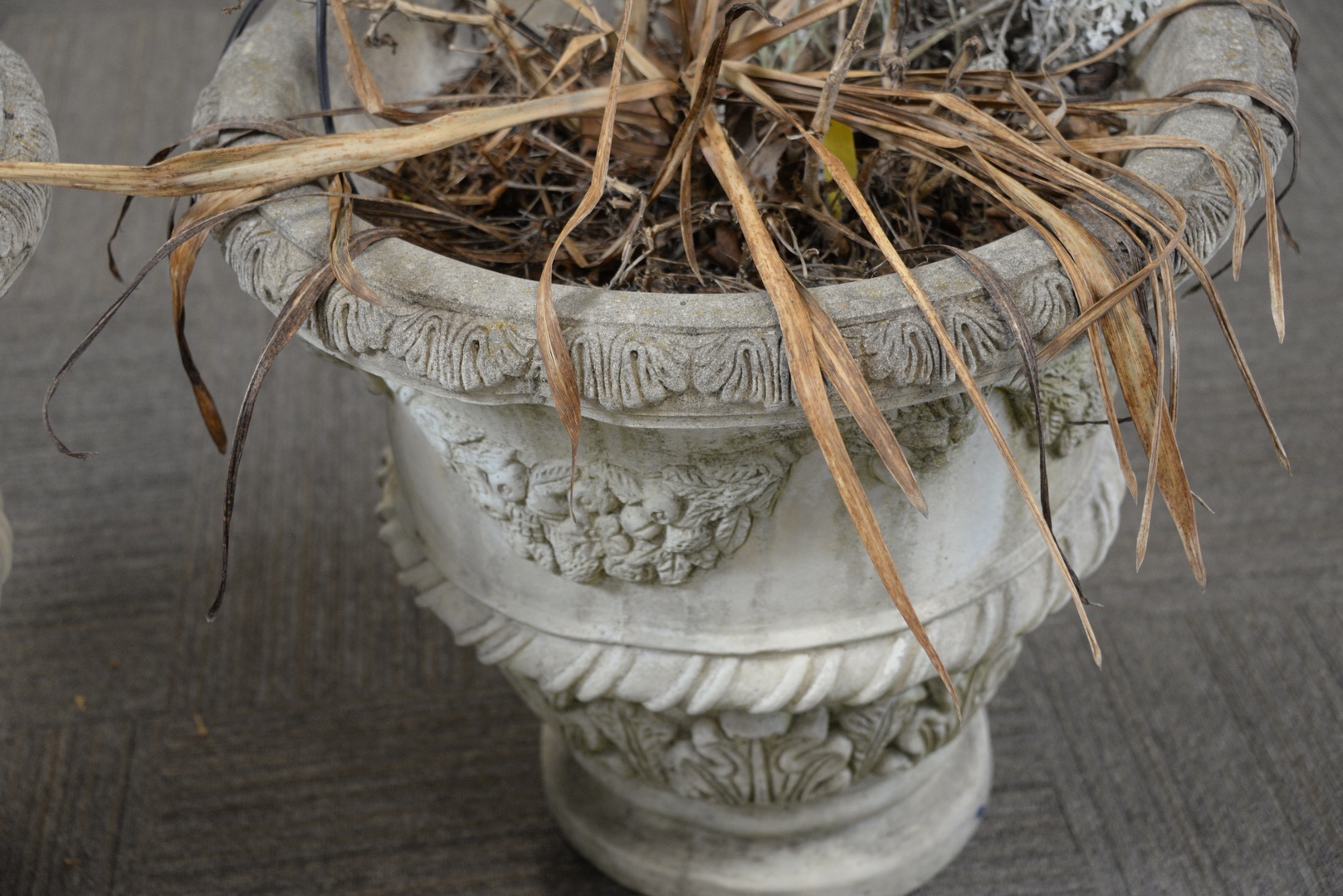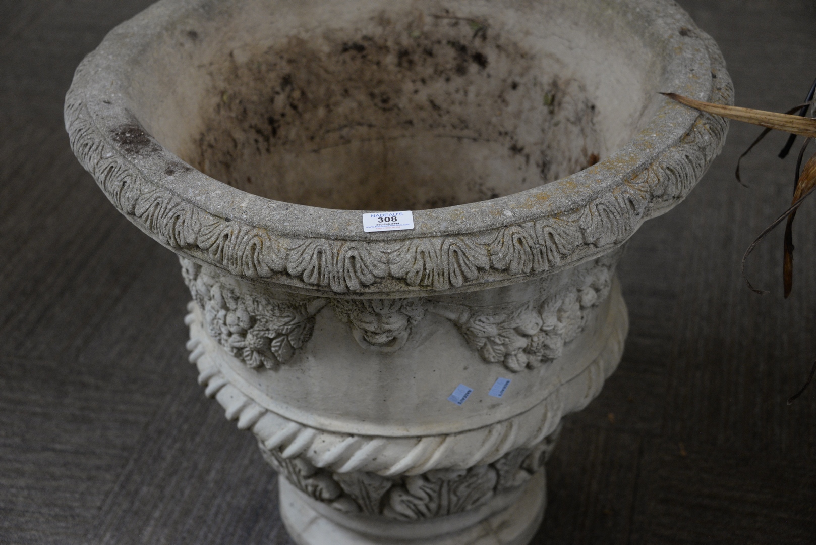 Lot 308: Pair of Concrete Urns having faces and wreaths, signed Nina Studio P249, height 22 inches, diameter 28 inches.