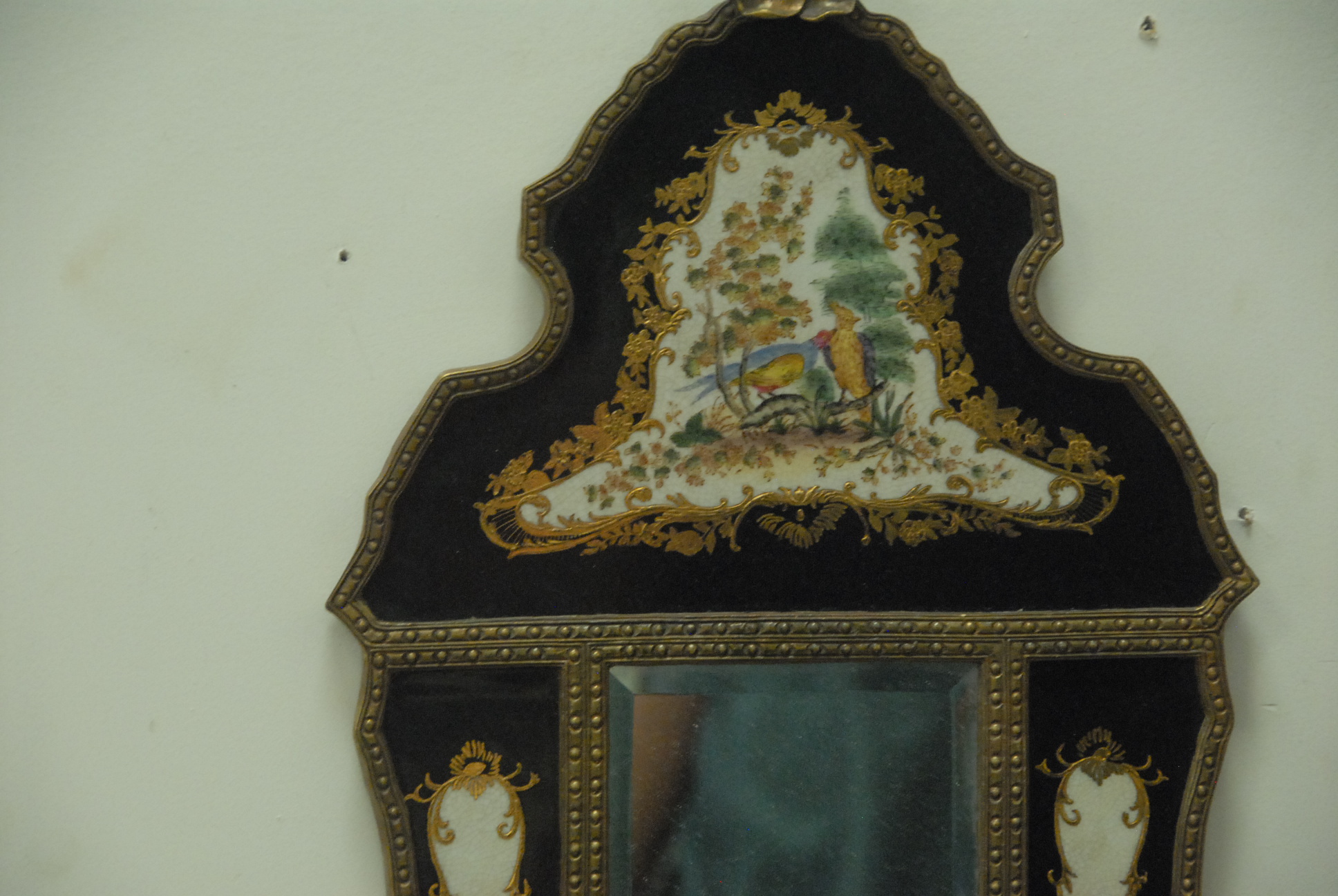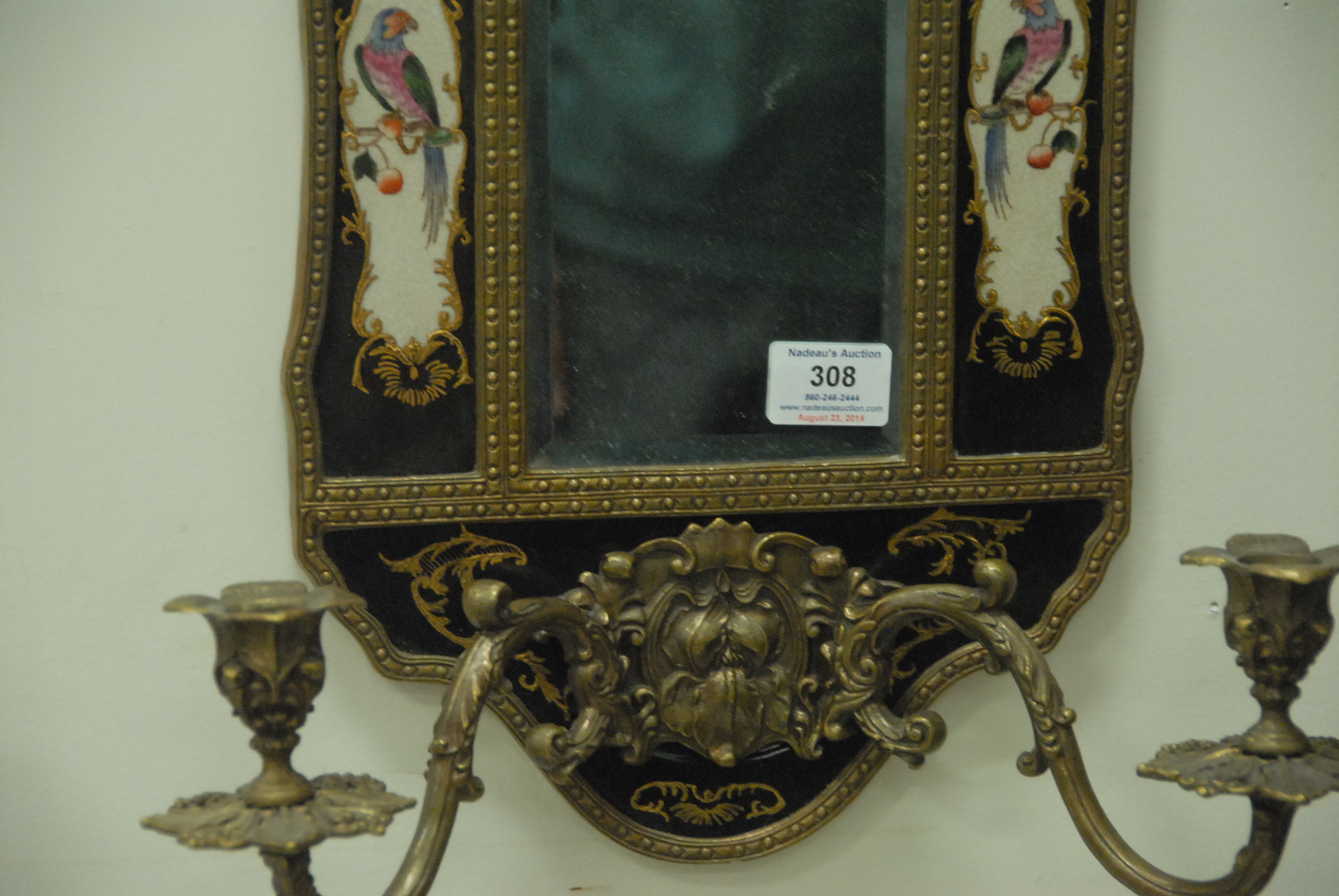 Pair of French style mirrored candle sconces with porcelain plaques, ht. 24 in.