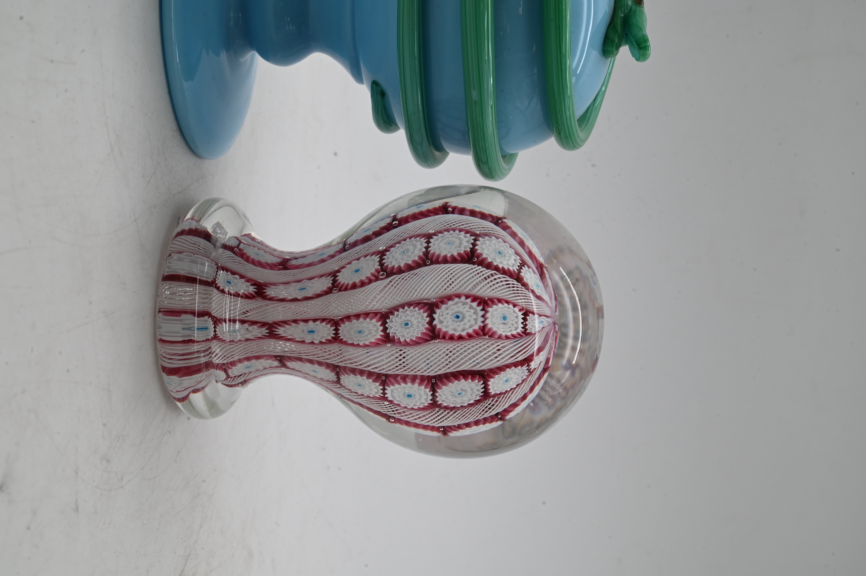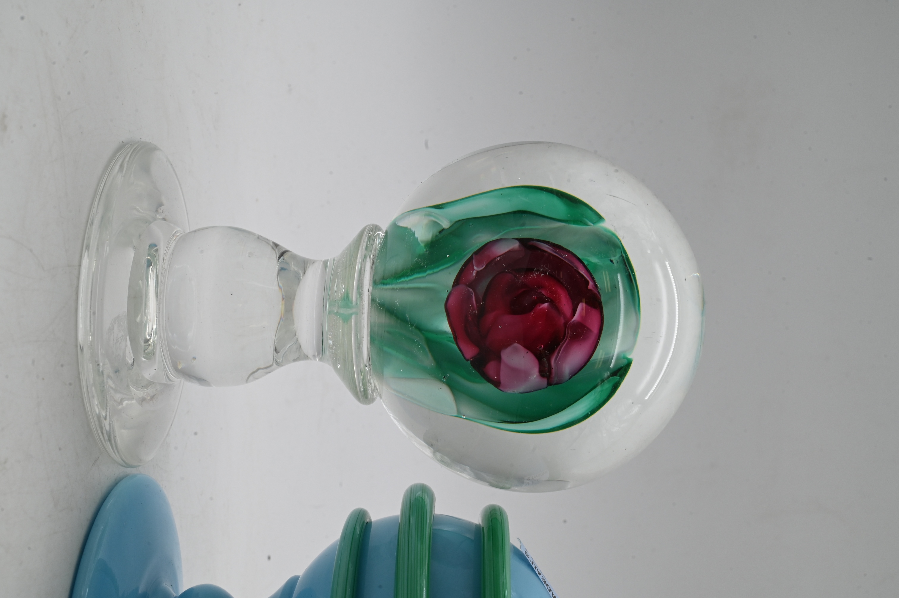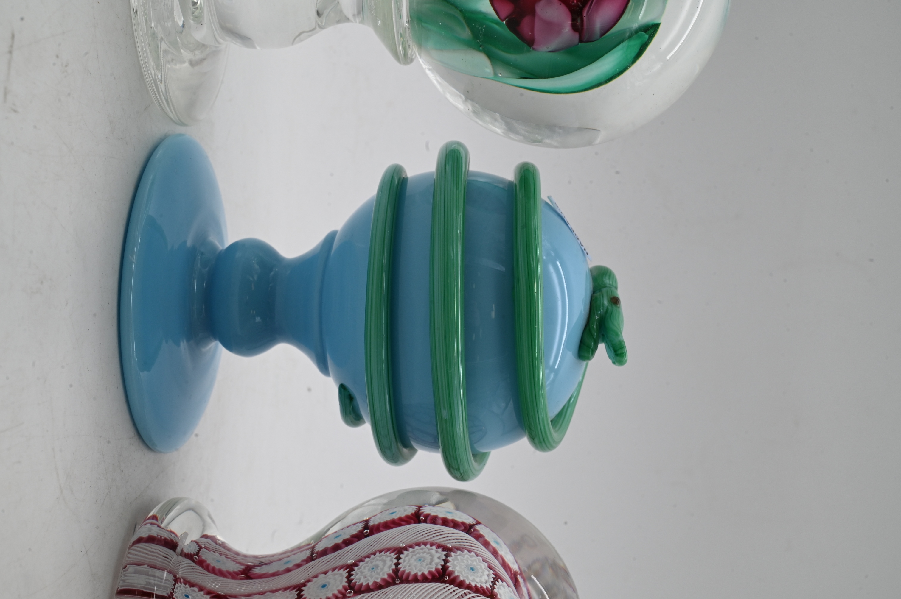 Pairpoint coiled green snake around blue opaque ball, height 5 inches, attributed to M.Larsen Milleville crimp rose pedestal paperweight, along with Murano pink millefiori lattice footed paperweight.