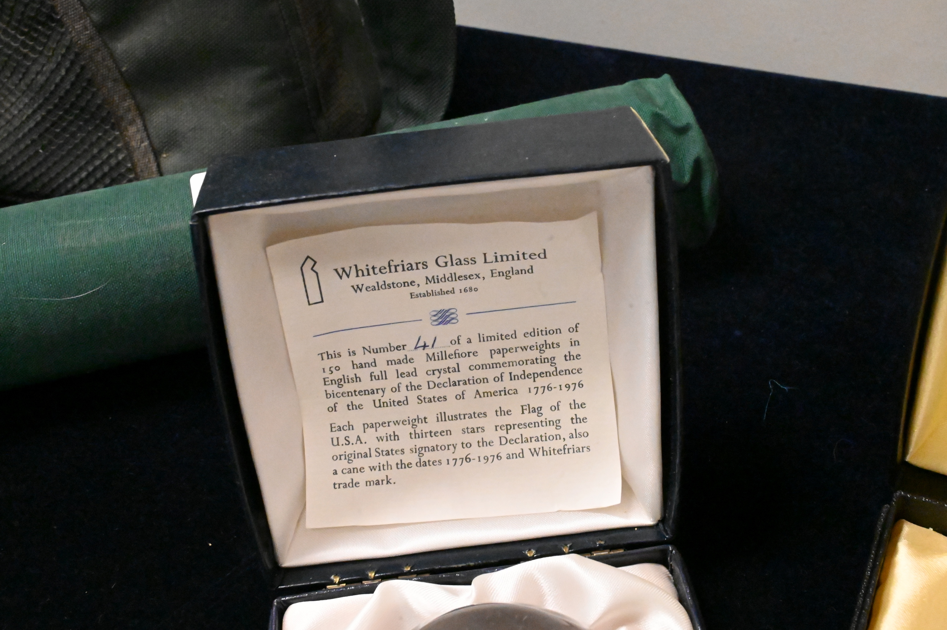 Perthshire millefiori paperweight, edition 254/250, Whitefriars glass American Bi-Centenary 1776-1976 flag paperweight, edition 41/150, Baccarat gridle horse paperweight, dated 1973, edition number 96, diameter 3 3/8 inches, each having original box