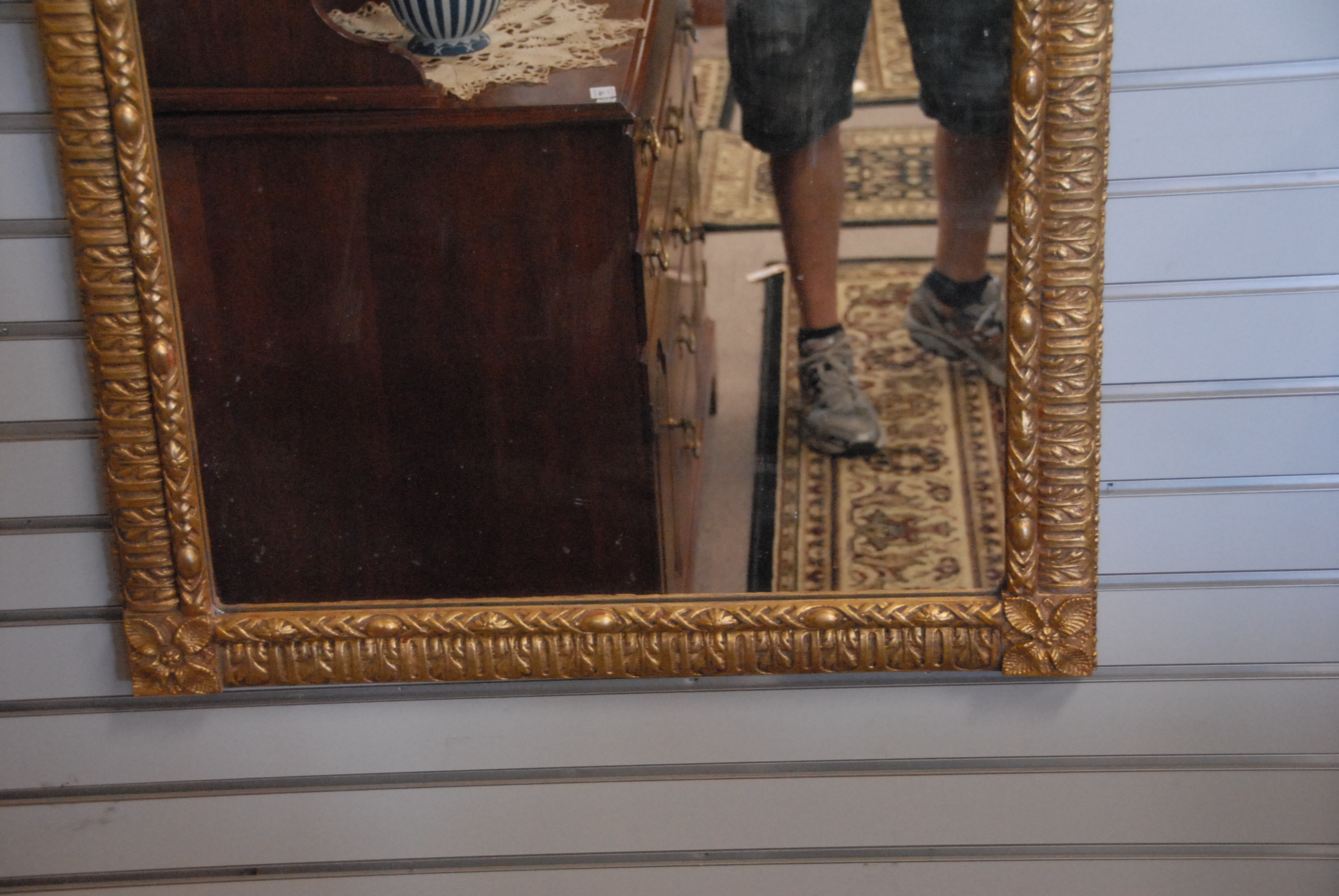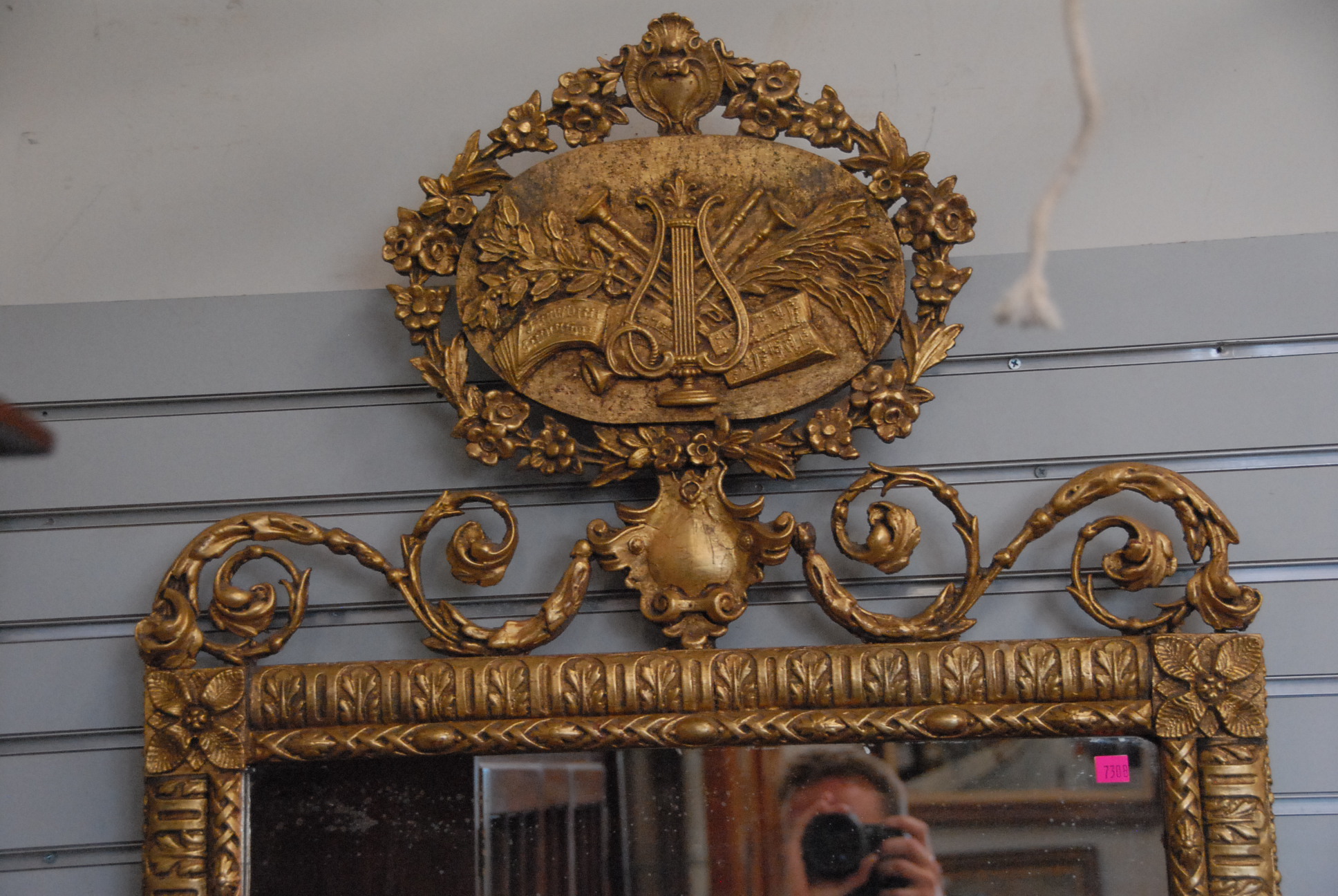 Lot 308A: Large French style gilt rectangular mirror with scrolling top and plaque with wreath and musical instruments, ht. 62 1/2in. wd. 29in.