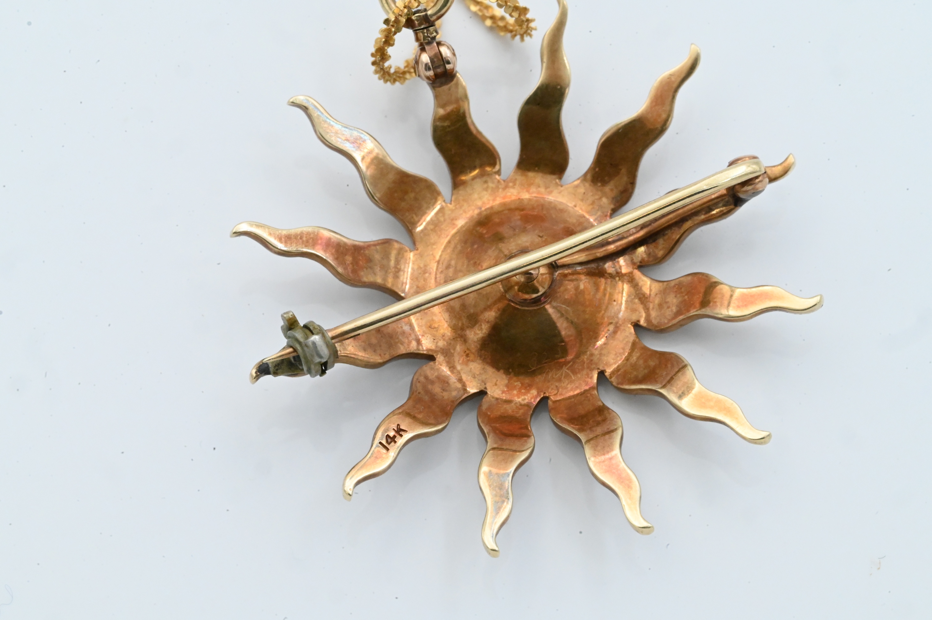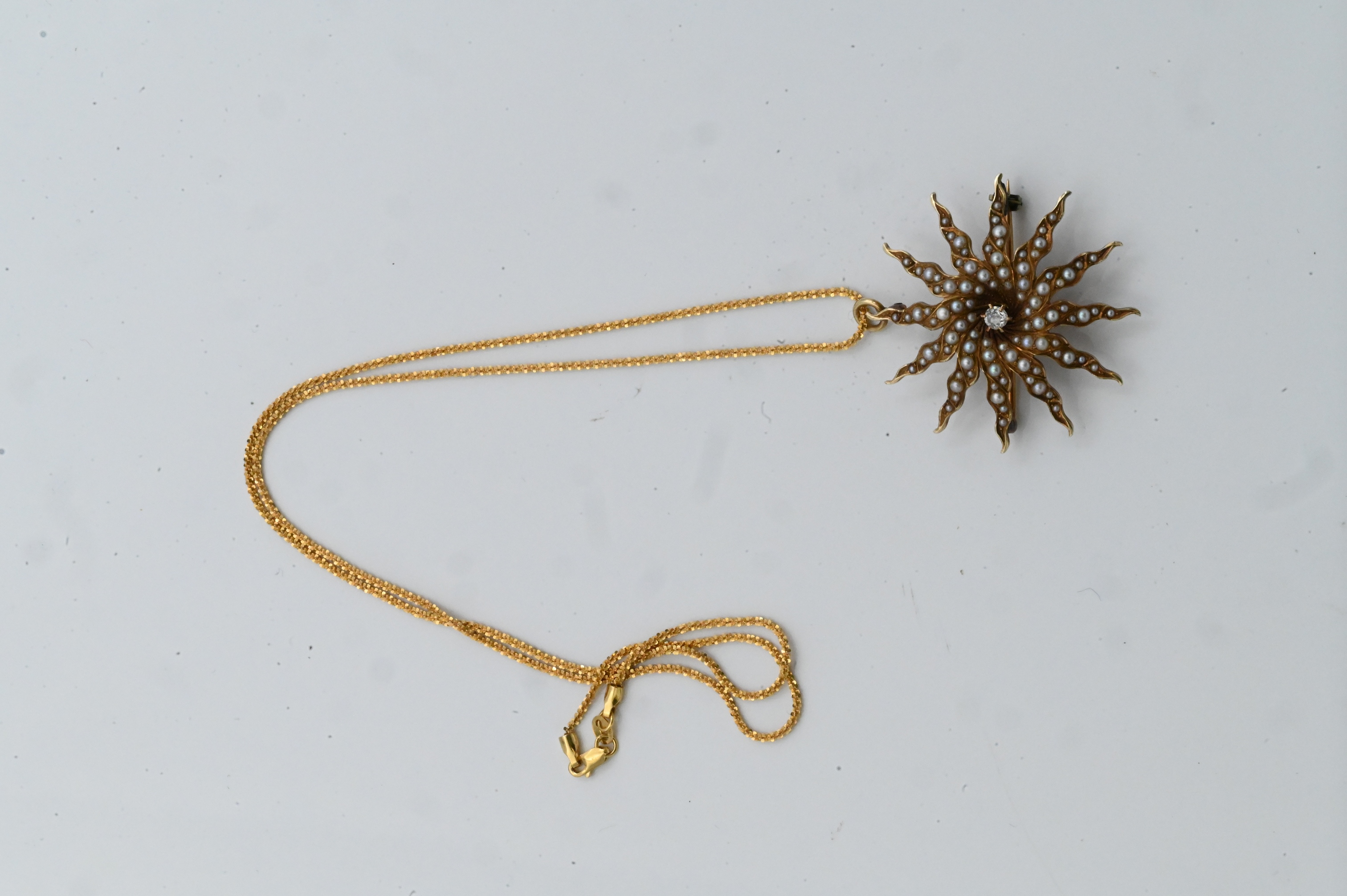 14K yellow gold starburst pendant set with seed pearls and a central diamond, suspended from a 14K Italian gold chain.