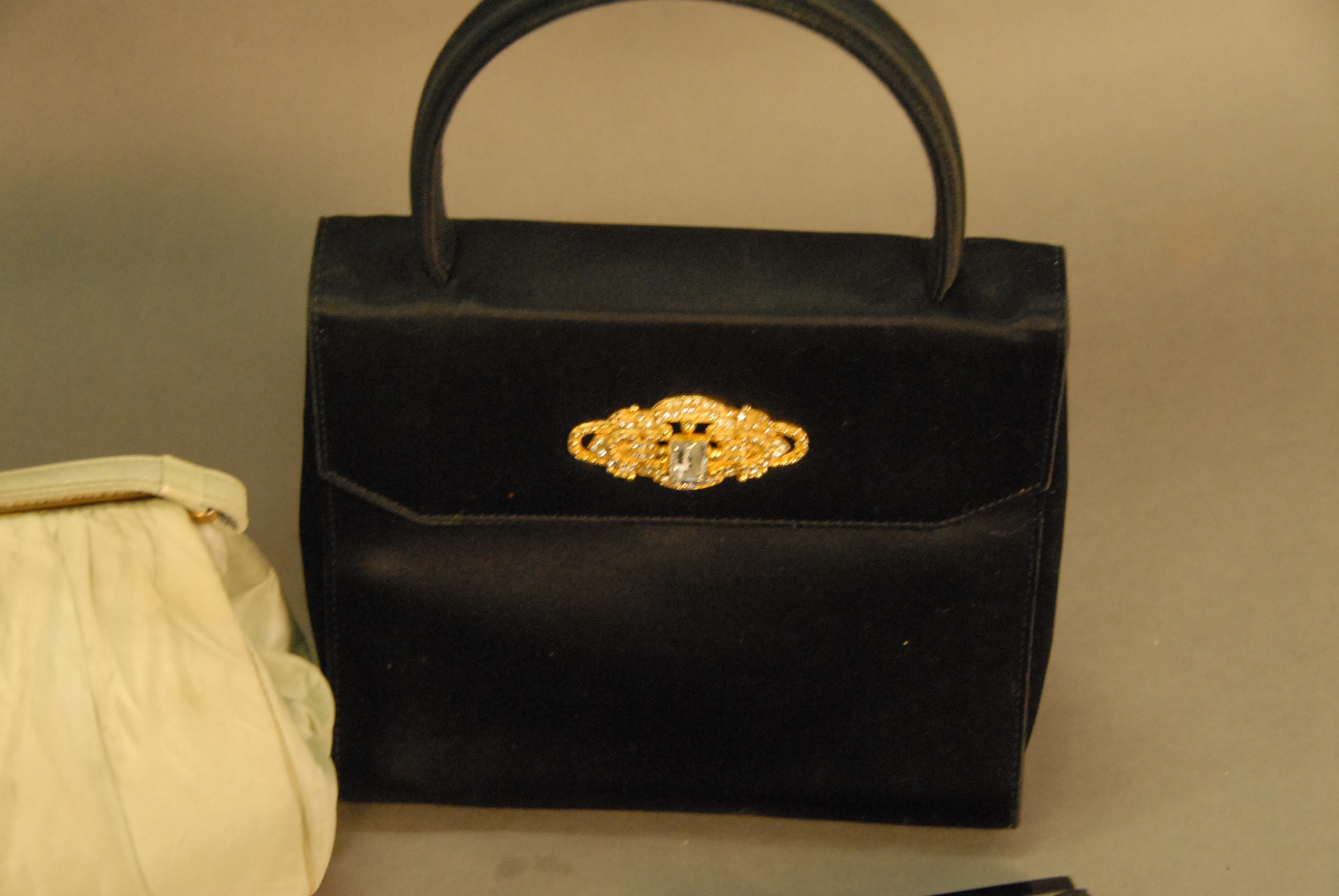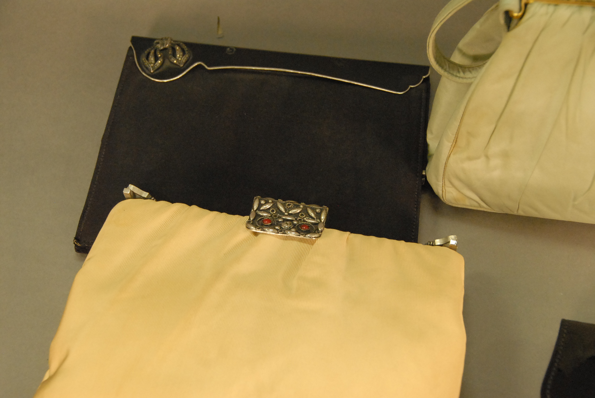 Box lot of six evening bags including some with enameling and some mounted with stones.