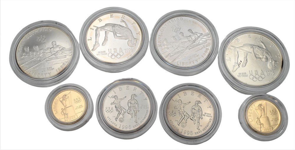 Eight Piece Coin Lot, to include one proof 5 dollar gold, and one uncirculated 5 dollar gold; along with 1996 Olympics to include 2 copper/nickel half dollars, 2 uncirculated silver dollars, and 2 proof silver dollars.