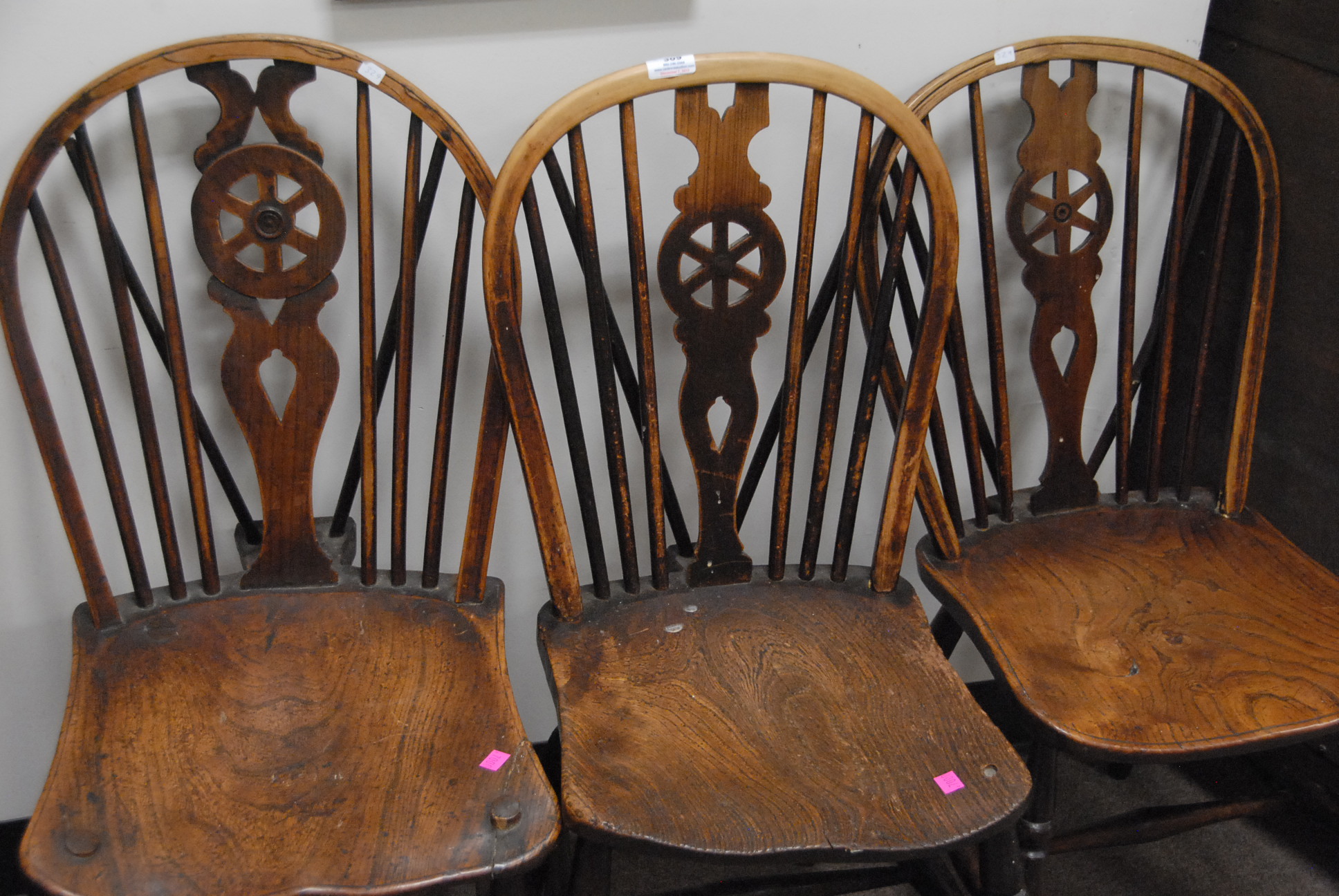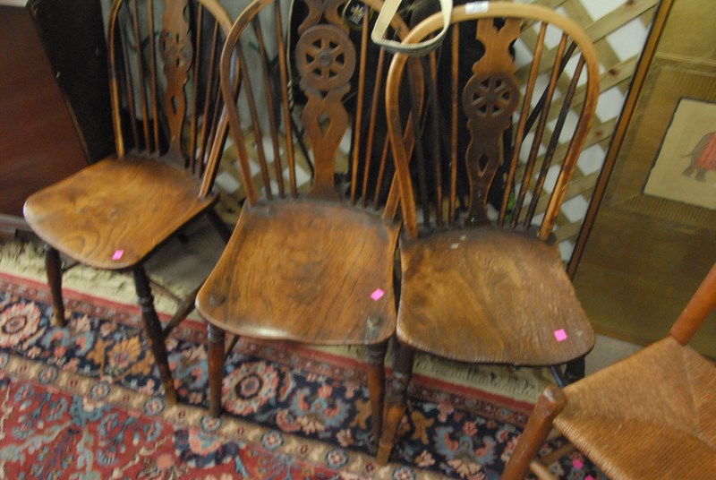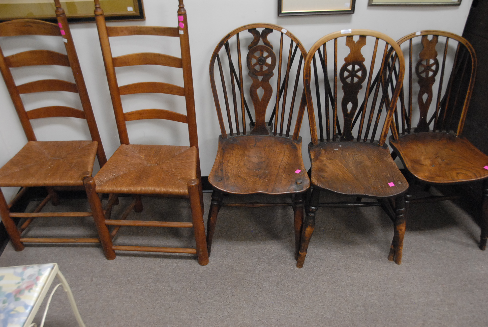 Lot 309: Five chairs to include a set of three English yew wood Windsor side chairs 18th century and a pair of ladderback chairs.