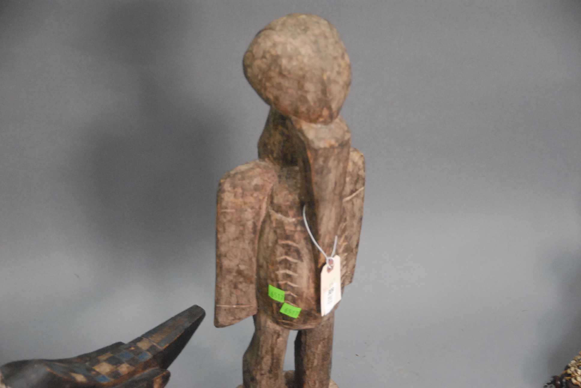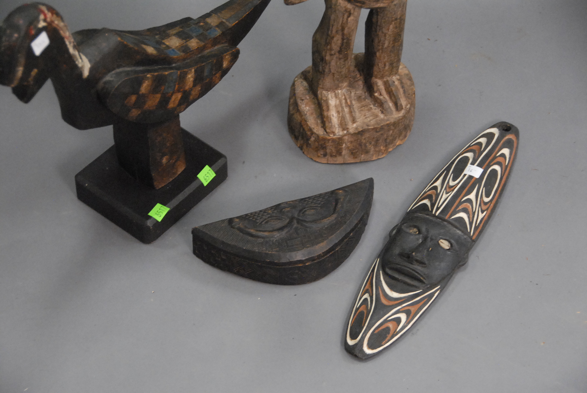 Lot 309: Four carved pieces two West African style birds and a box from the Kuba Tribe and a mask from New Guinea