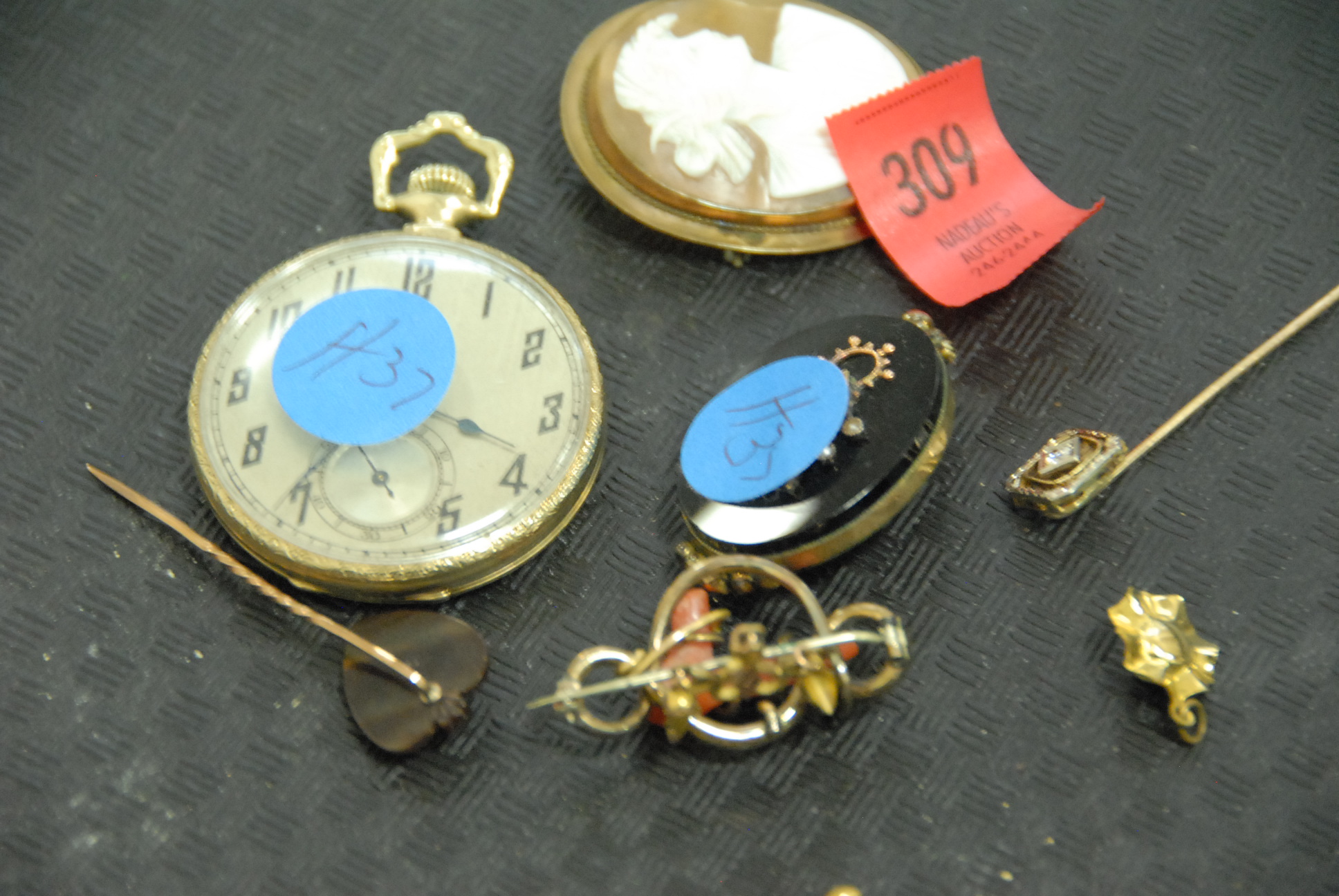 Group lot of Victorian jewelry and a pocket watch to include two hat pins, a cameo, coral pin, etc