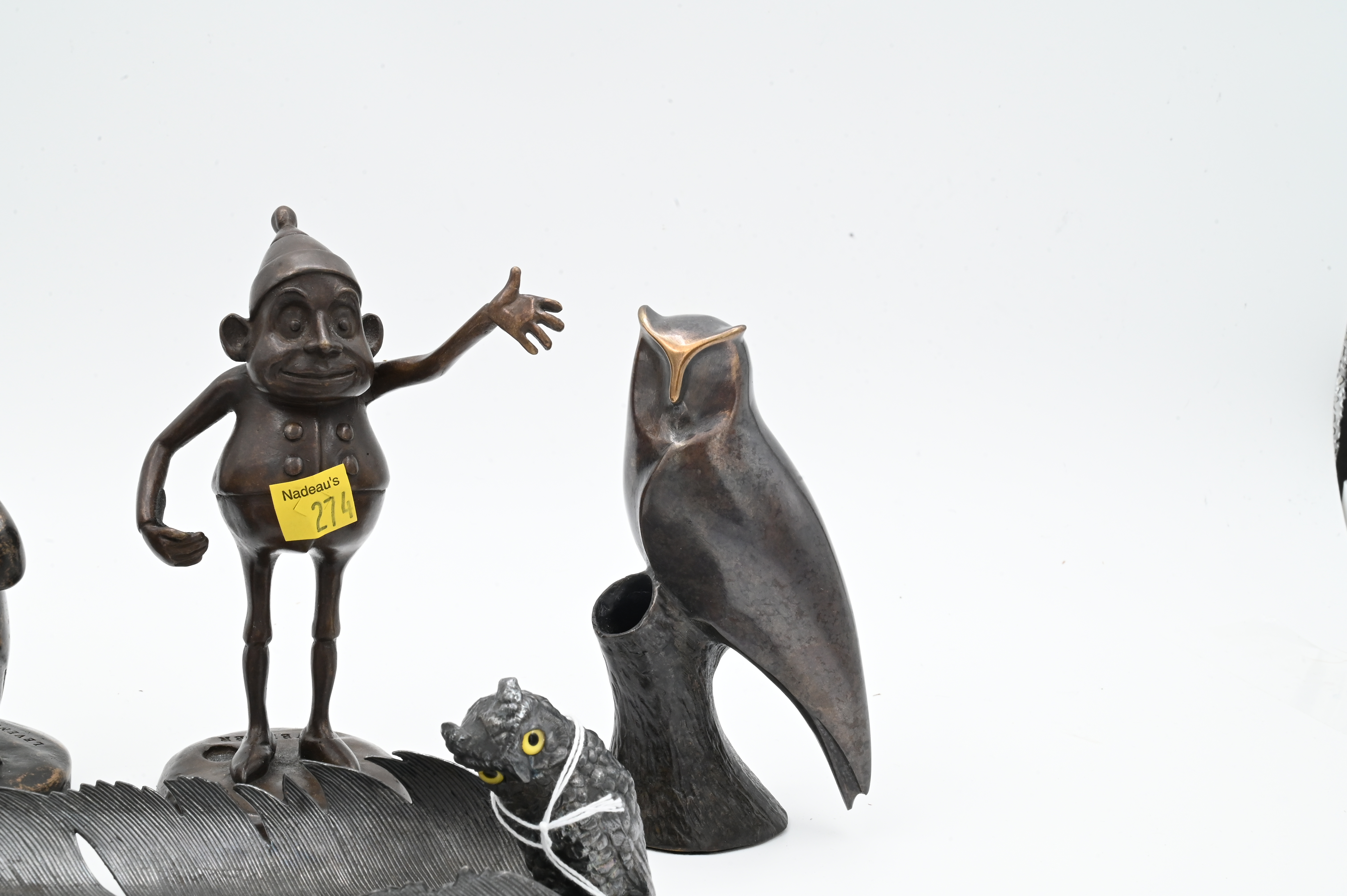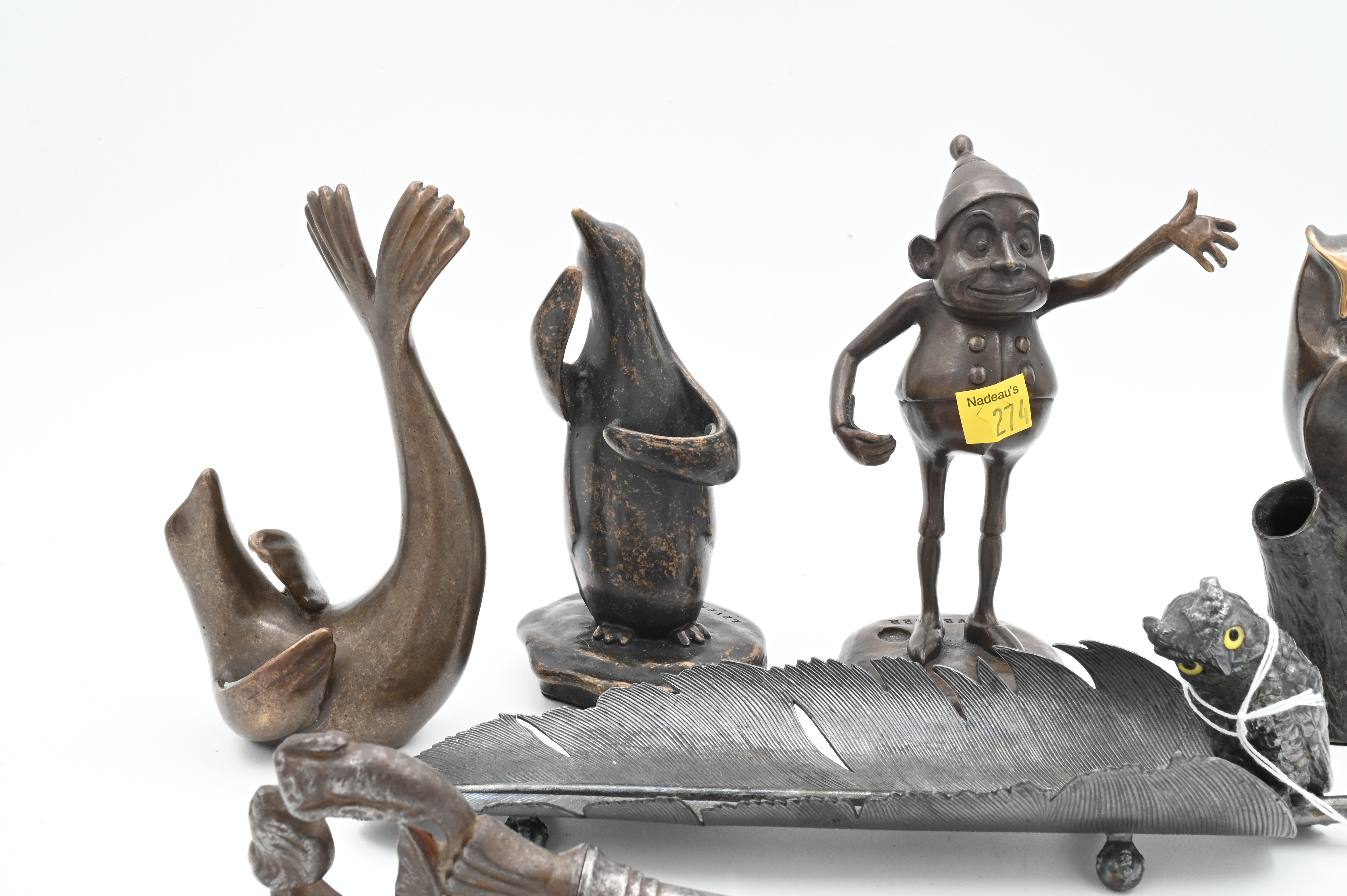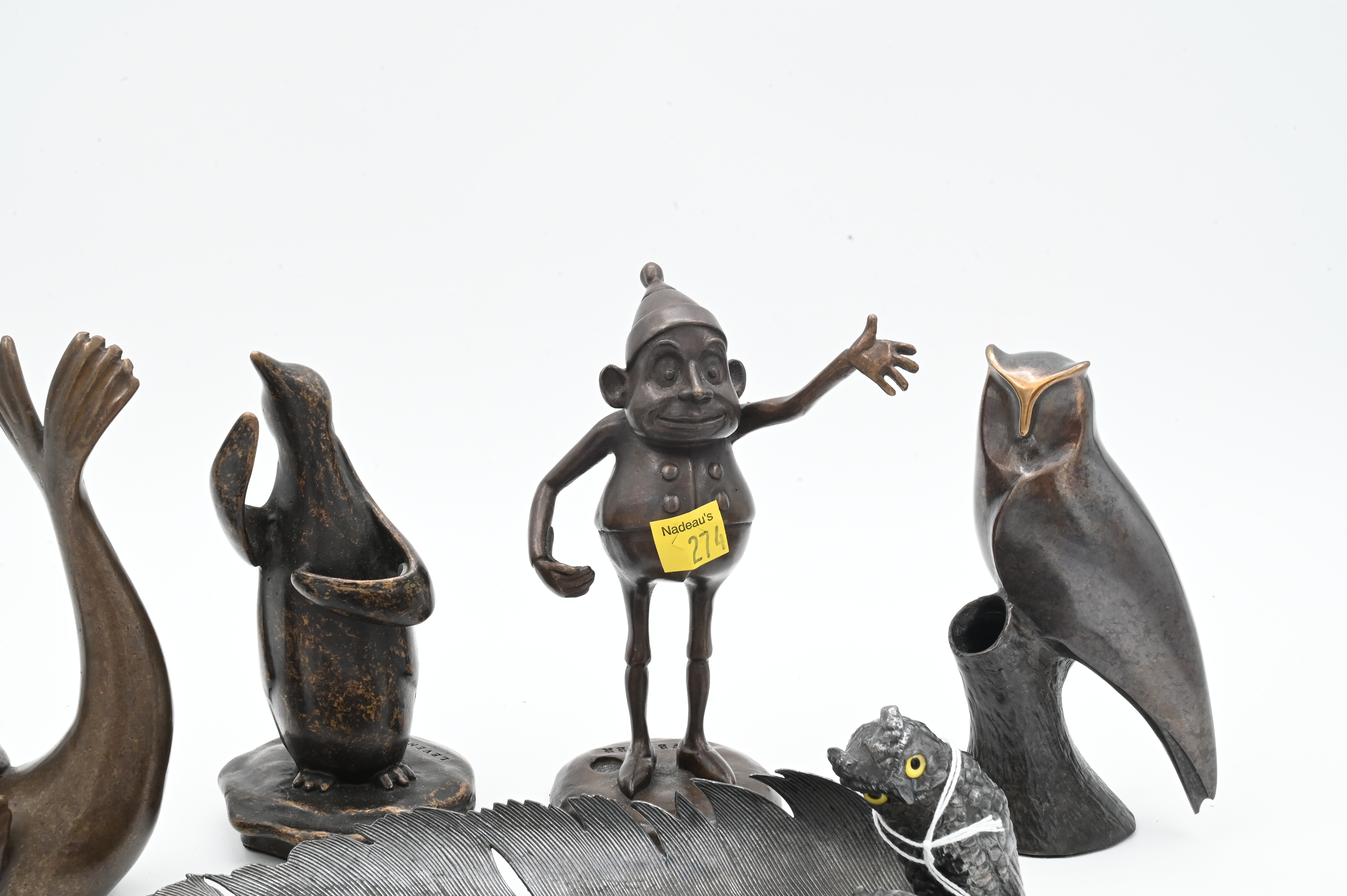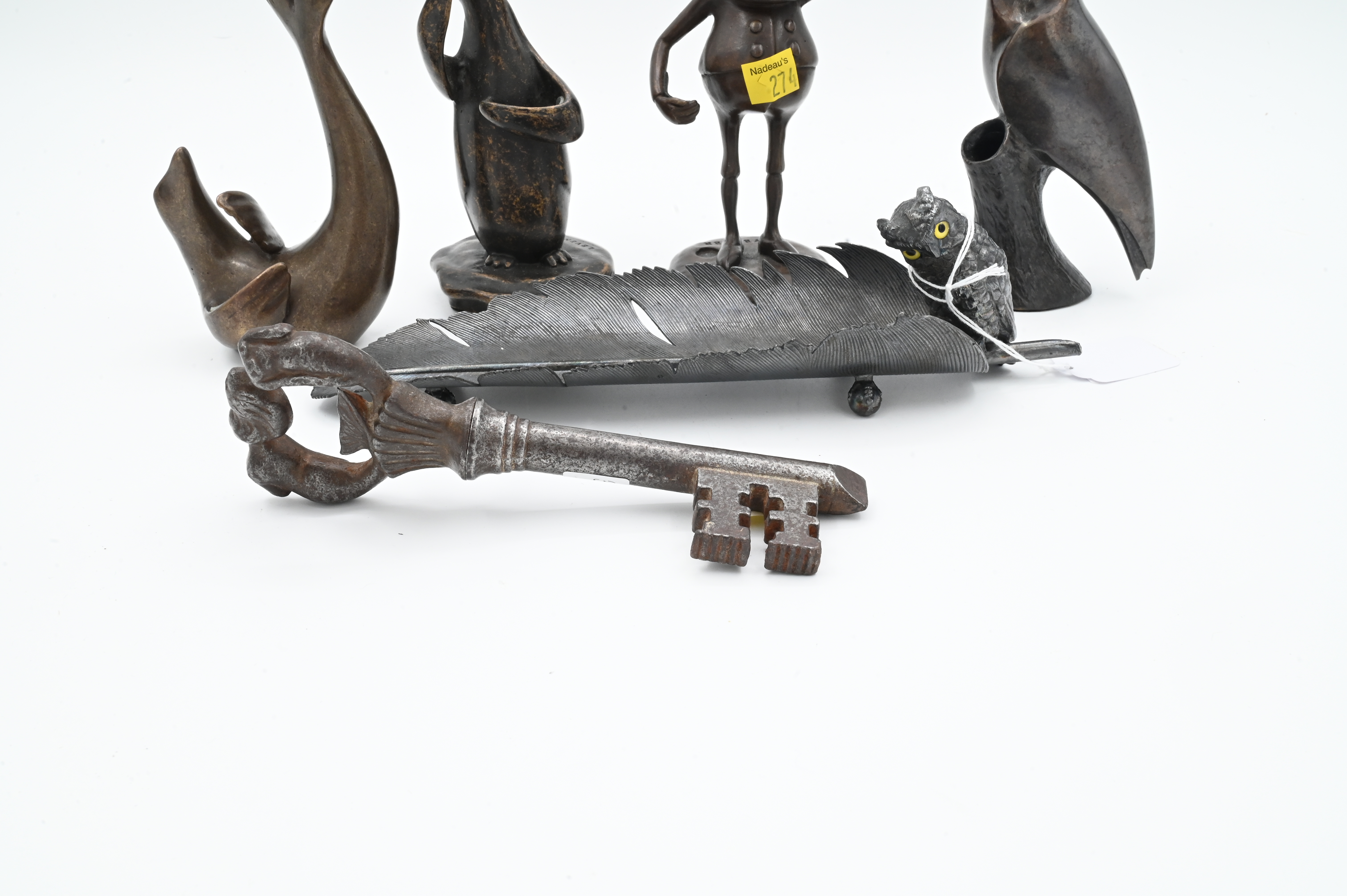 to include Levenger penguin pen stand, Lavenger elf/gnome, bronze owl on branch, Levenger seal, metal owl and feather pen rest marked 1921 on underside, metal mermaid skeleton key