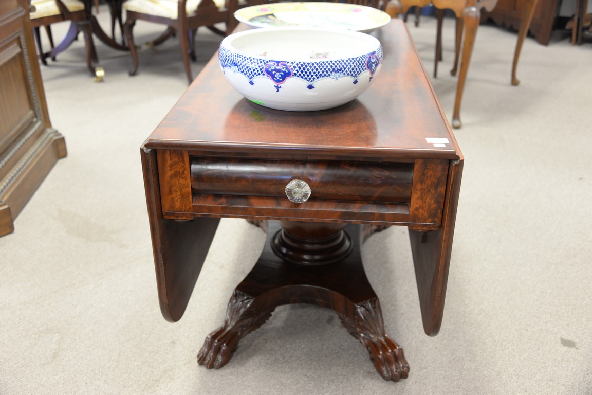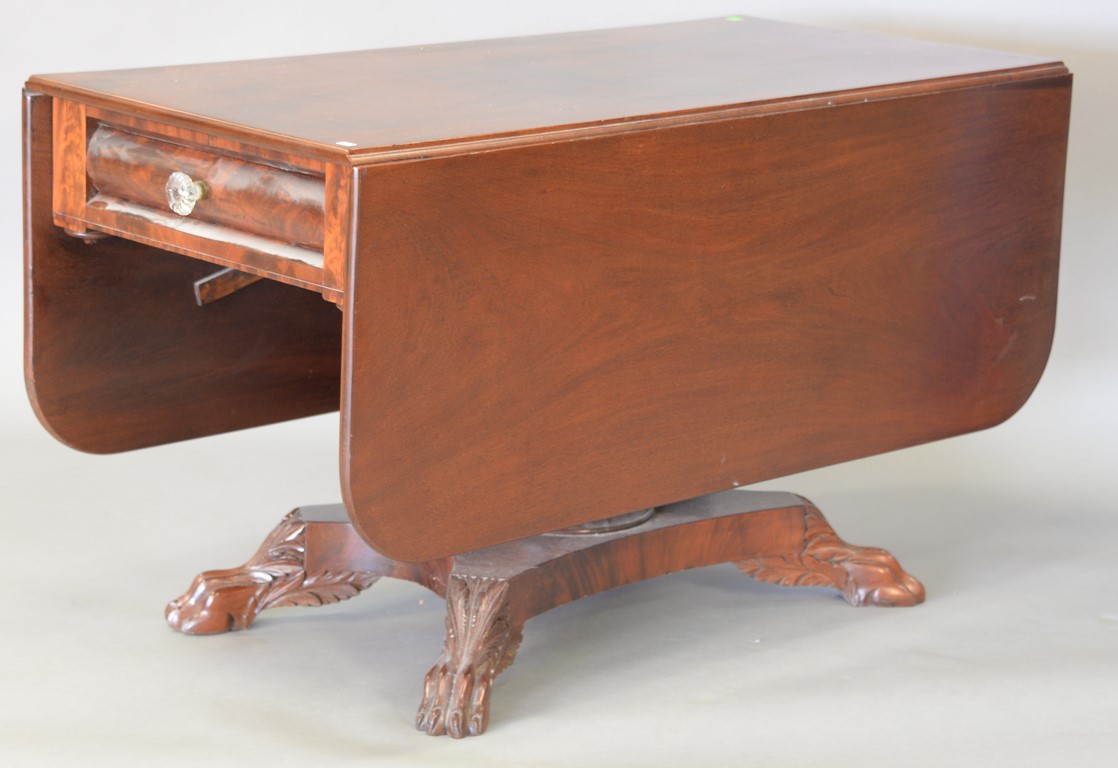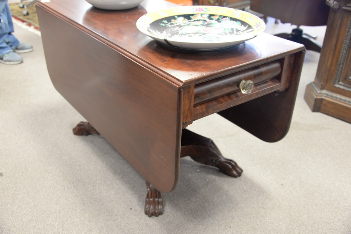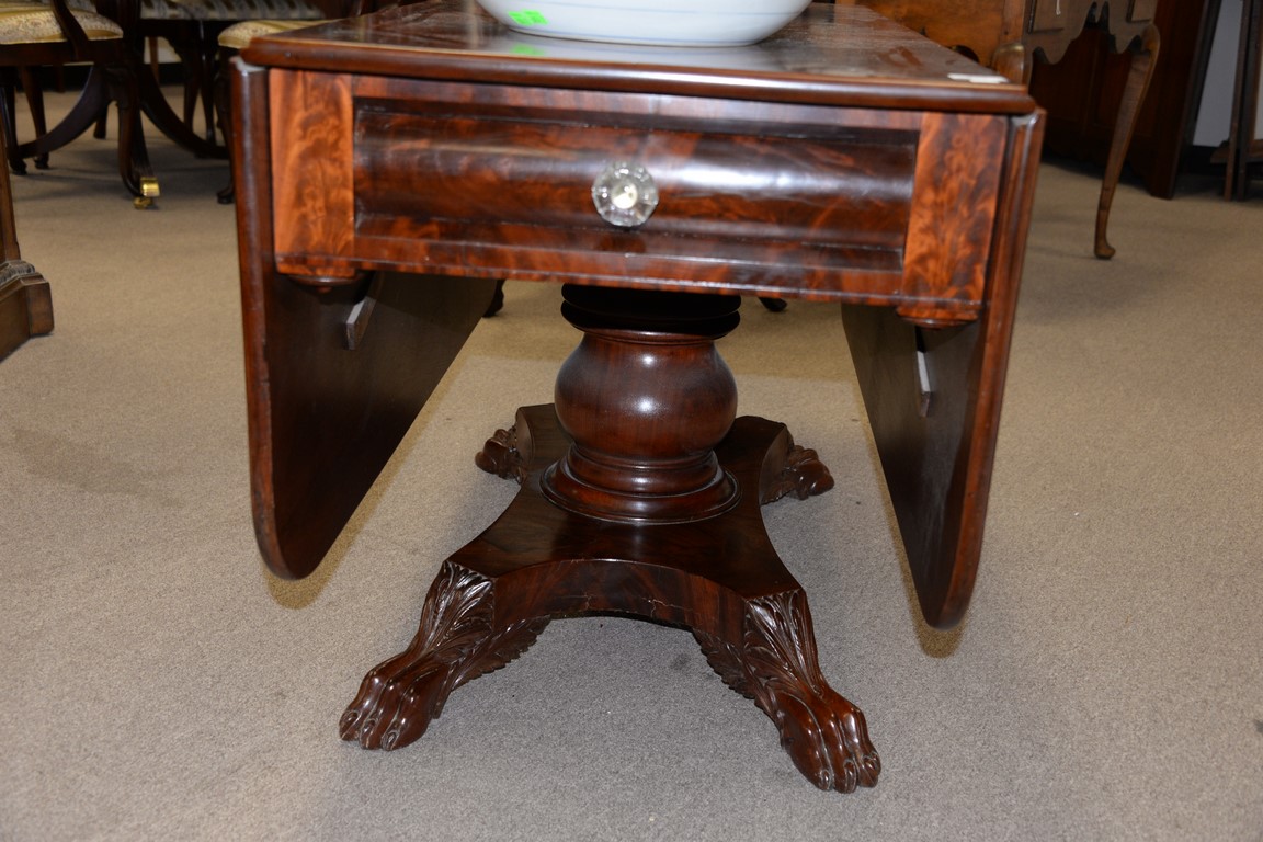 Lot 309: Large Victorian mahogany drop leaf table having one drawer on pedestal base with carved claw feet. ht. 28in., top: 23 x 48