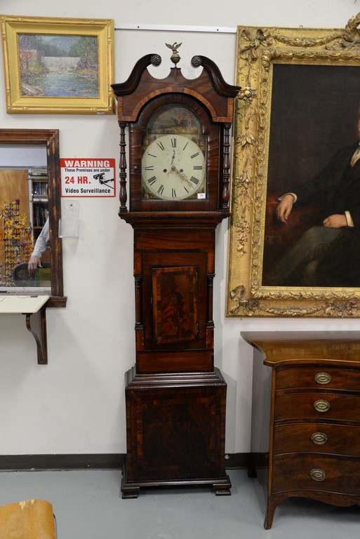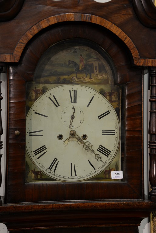 Lot 309: Mahogany tall case clock with painted metal dial and brass works, England, early 19th century