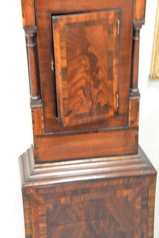 Mahogany tall case clock with painted metal dial and brass works, England, early 19th century. ht. 91in. wd. 9 1/2in.