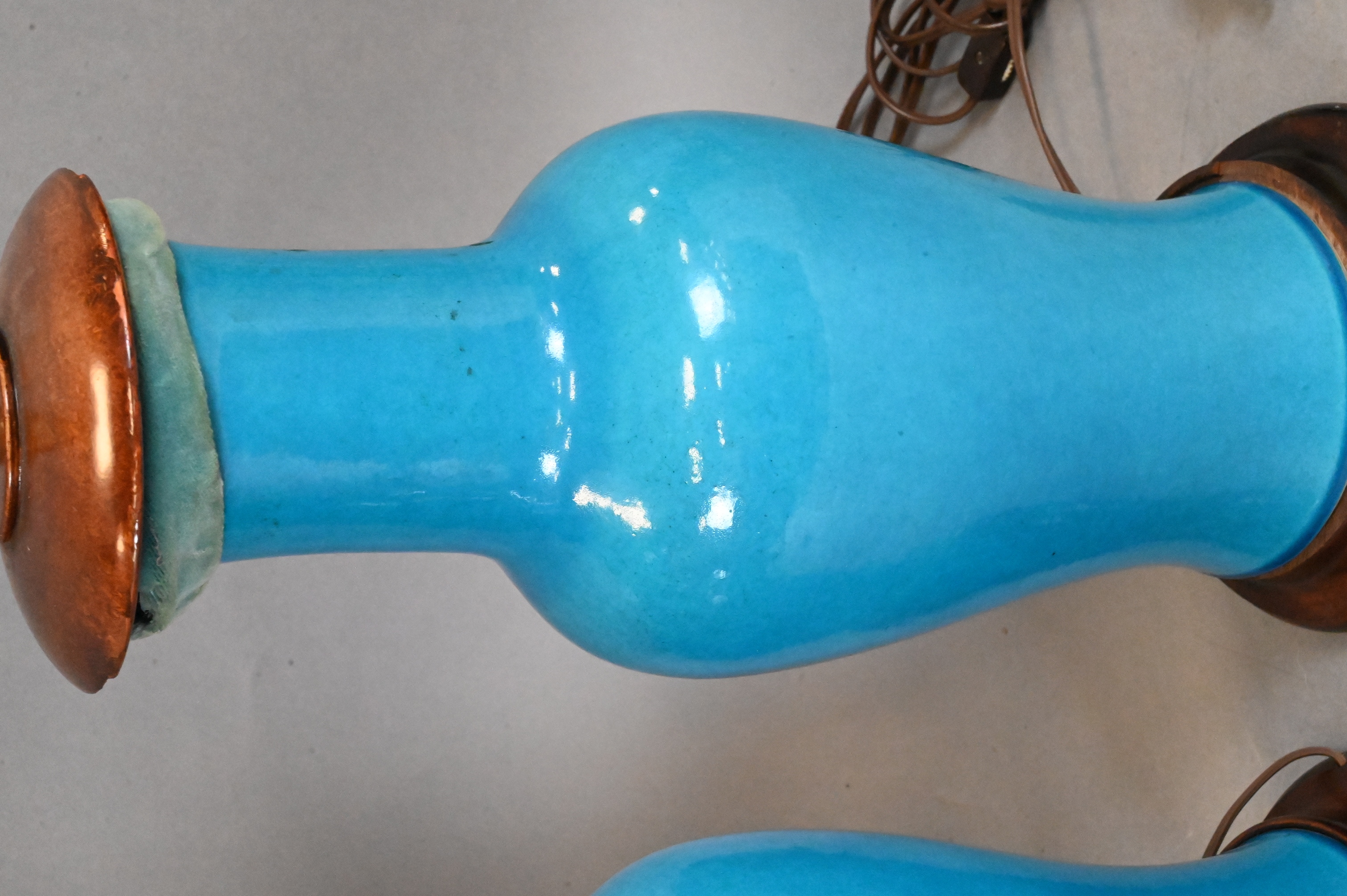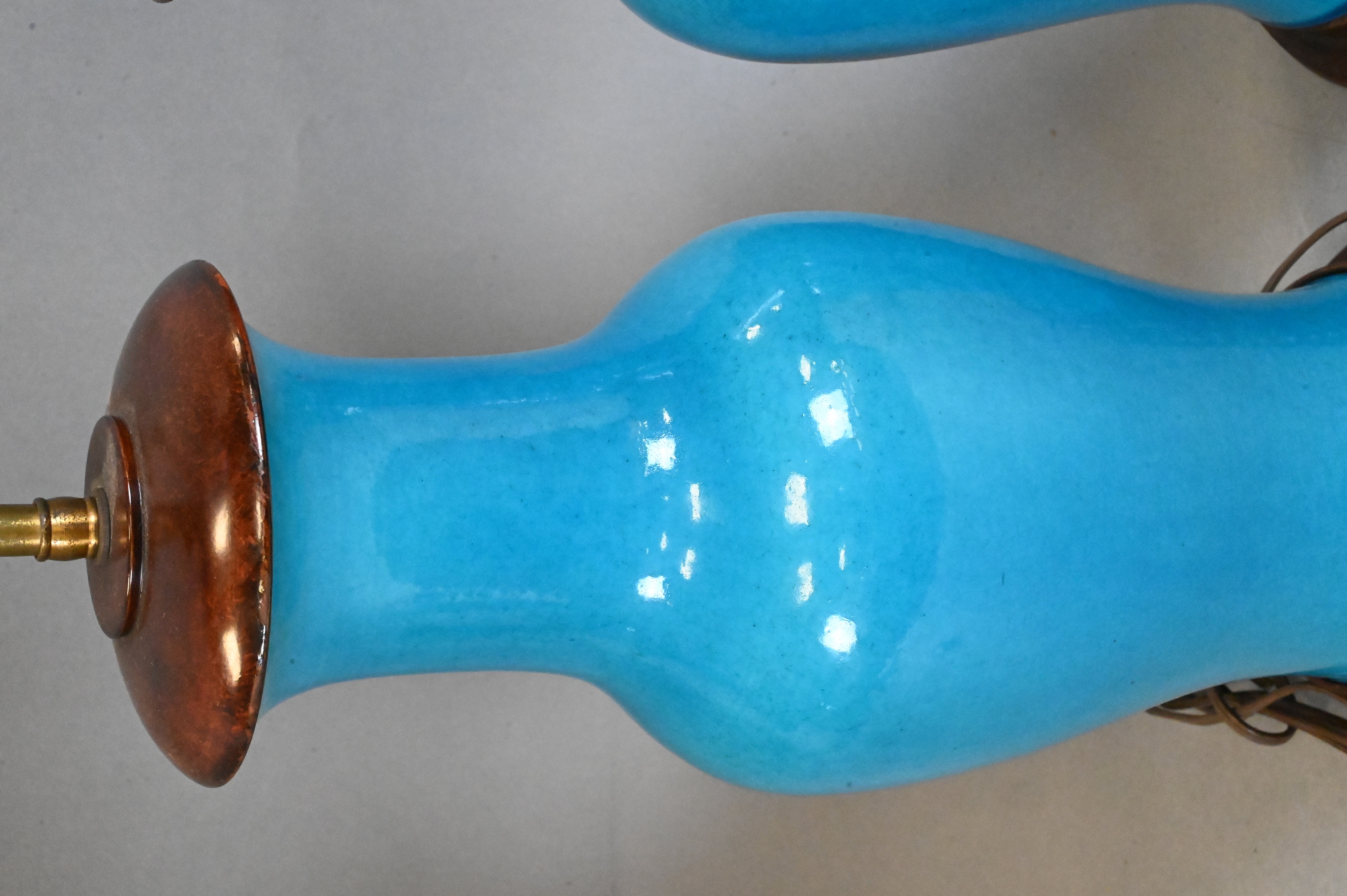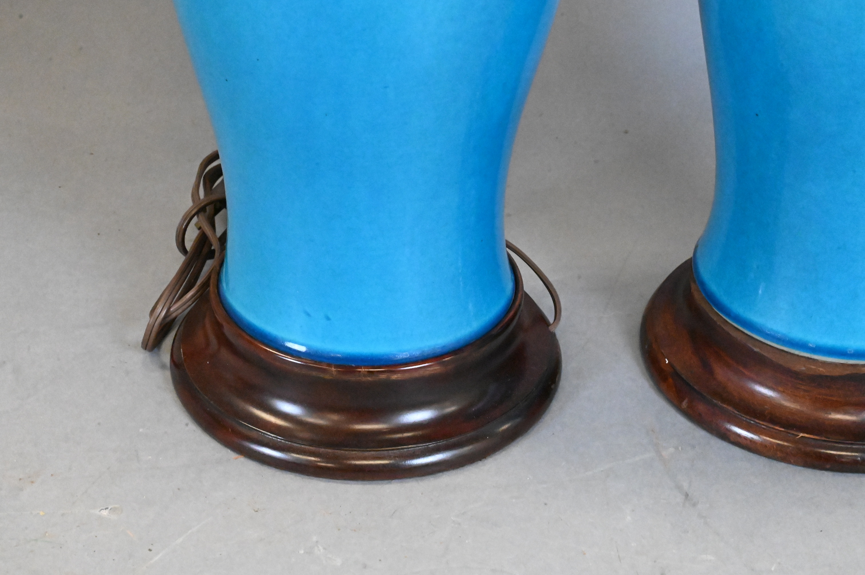 Baluster form, covered overall in a turquoise-blue glaze with fine crackle, drilled and fitted as a lamp with wood mounts