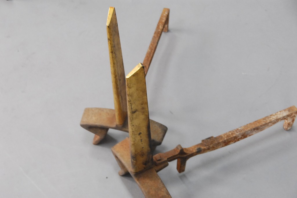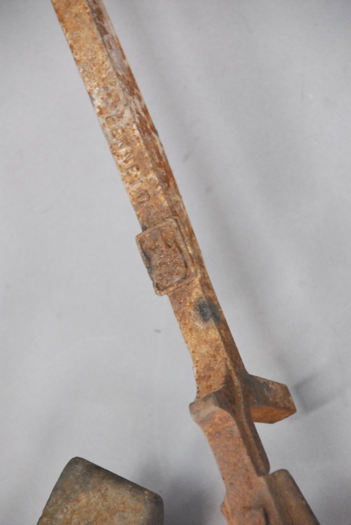 Lot 309: Pair of iron and brass andirons signed Bennett, ht. 19.