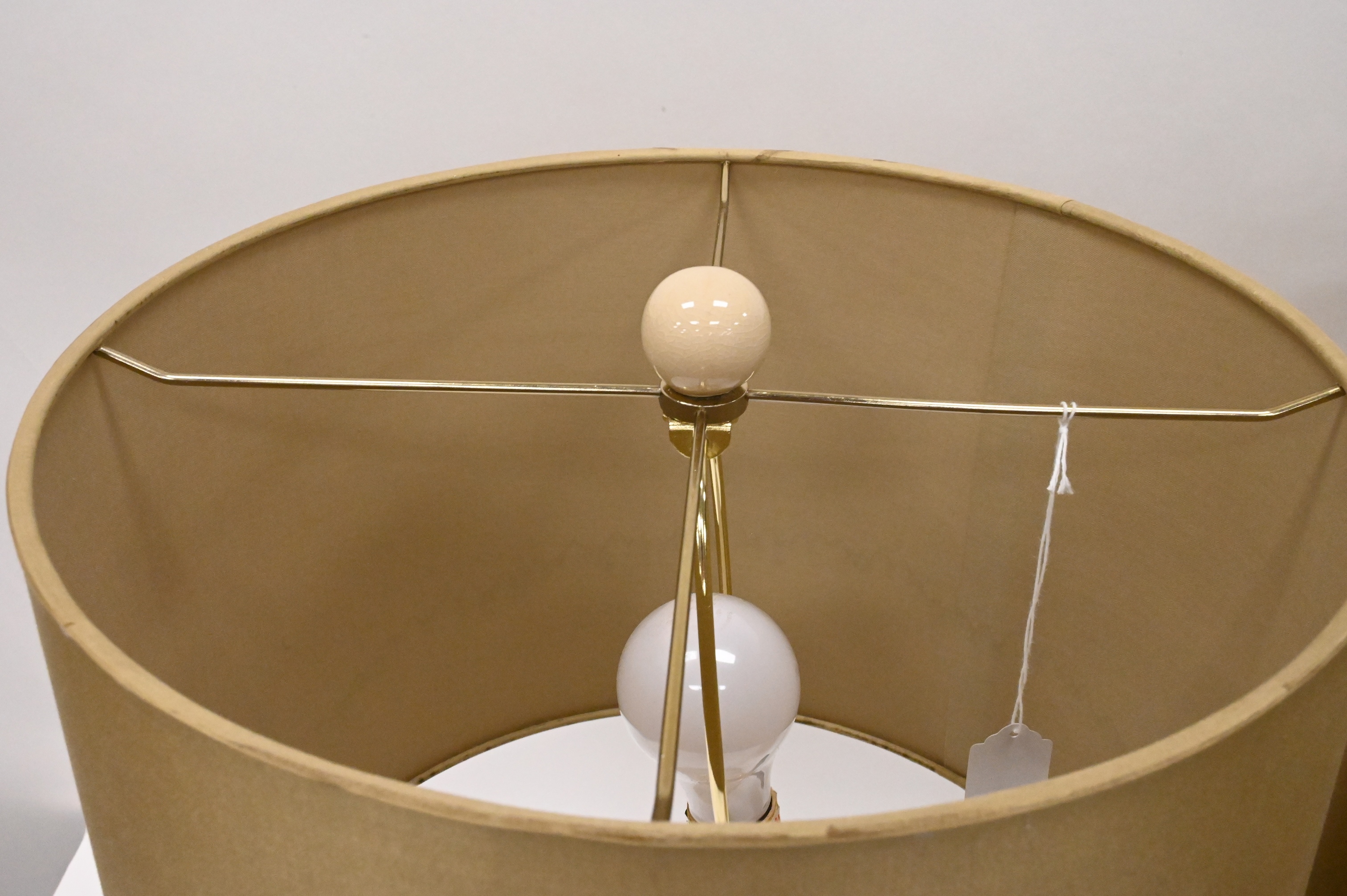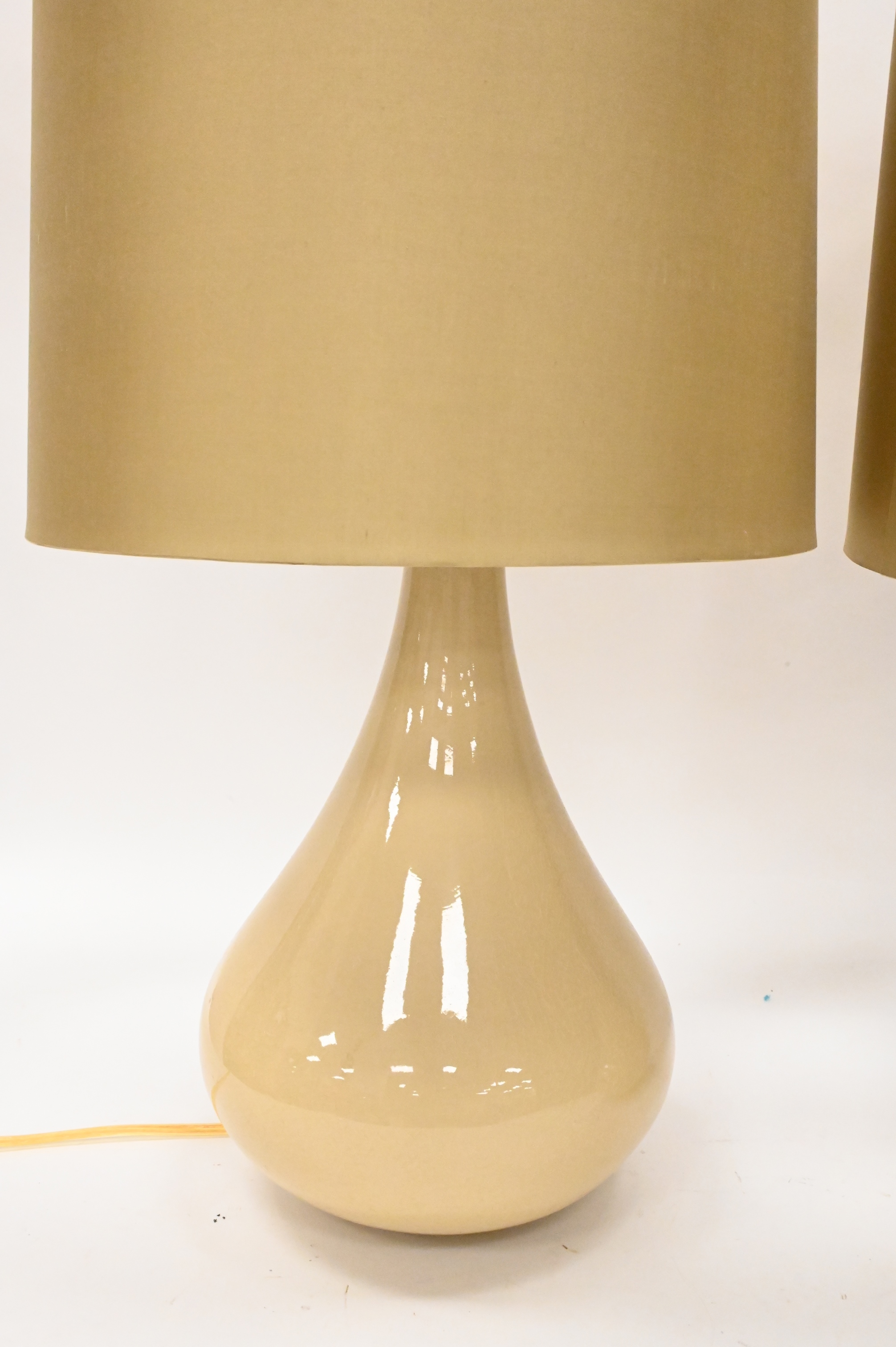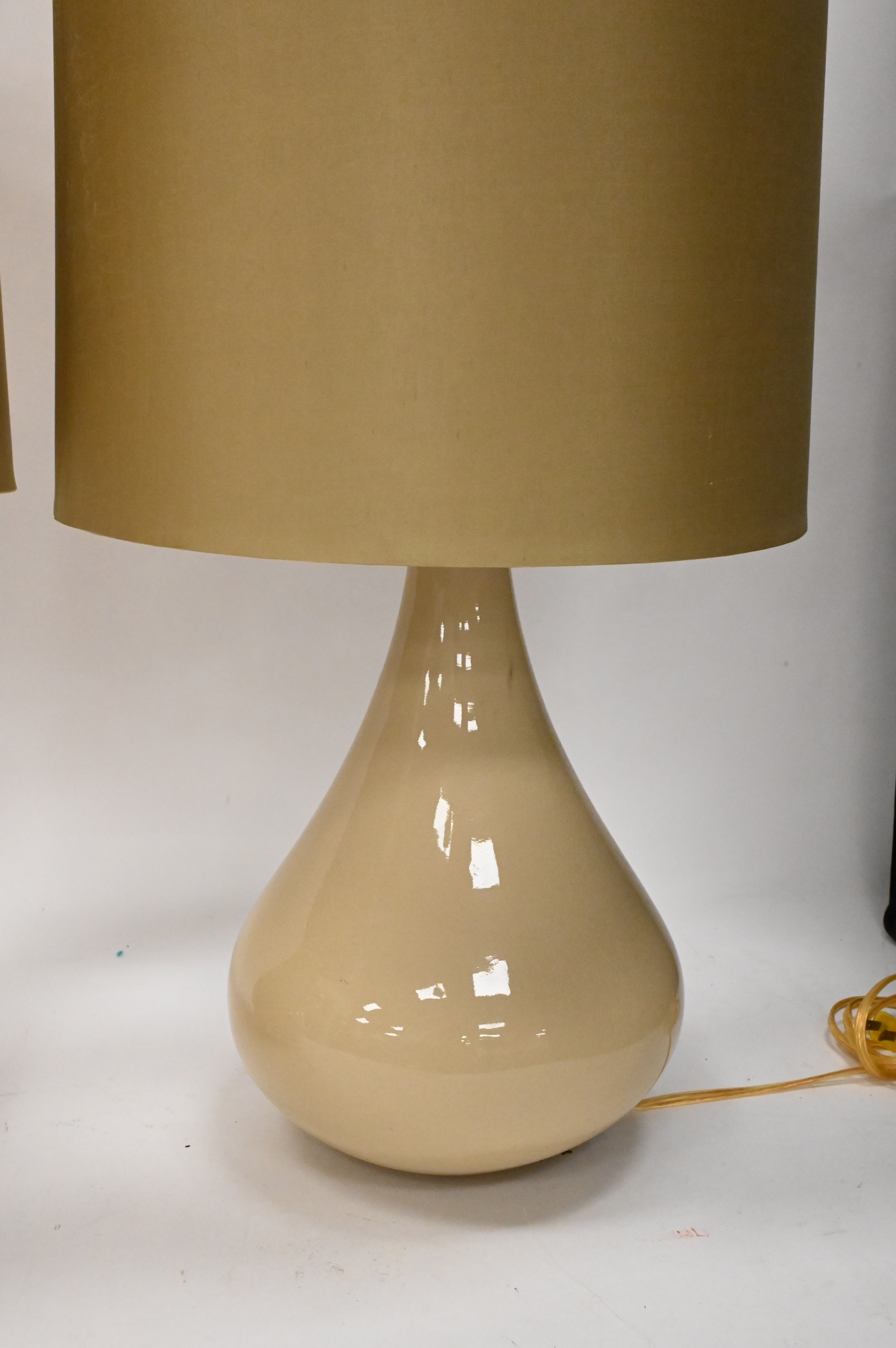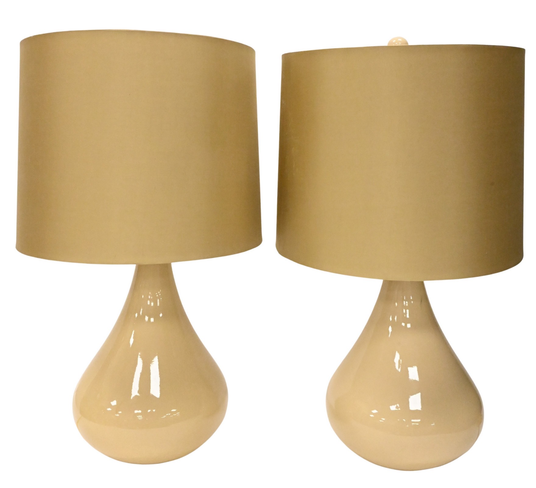 Pair of Tan Crackle Glazed Pear Shaped Ceramic Vases, made into table lamps with silk shades, height 26 inches, length 9 1/2 inches, width 9 1/2 inches.
