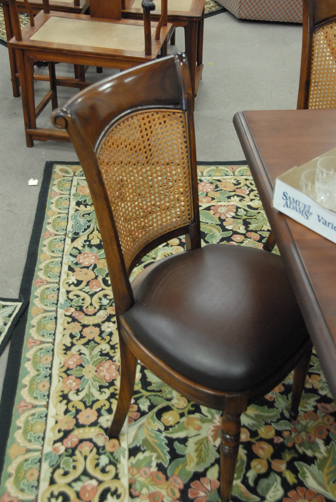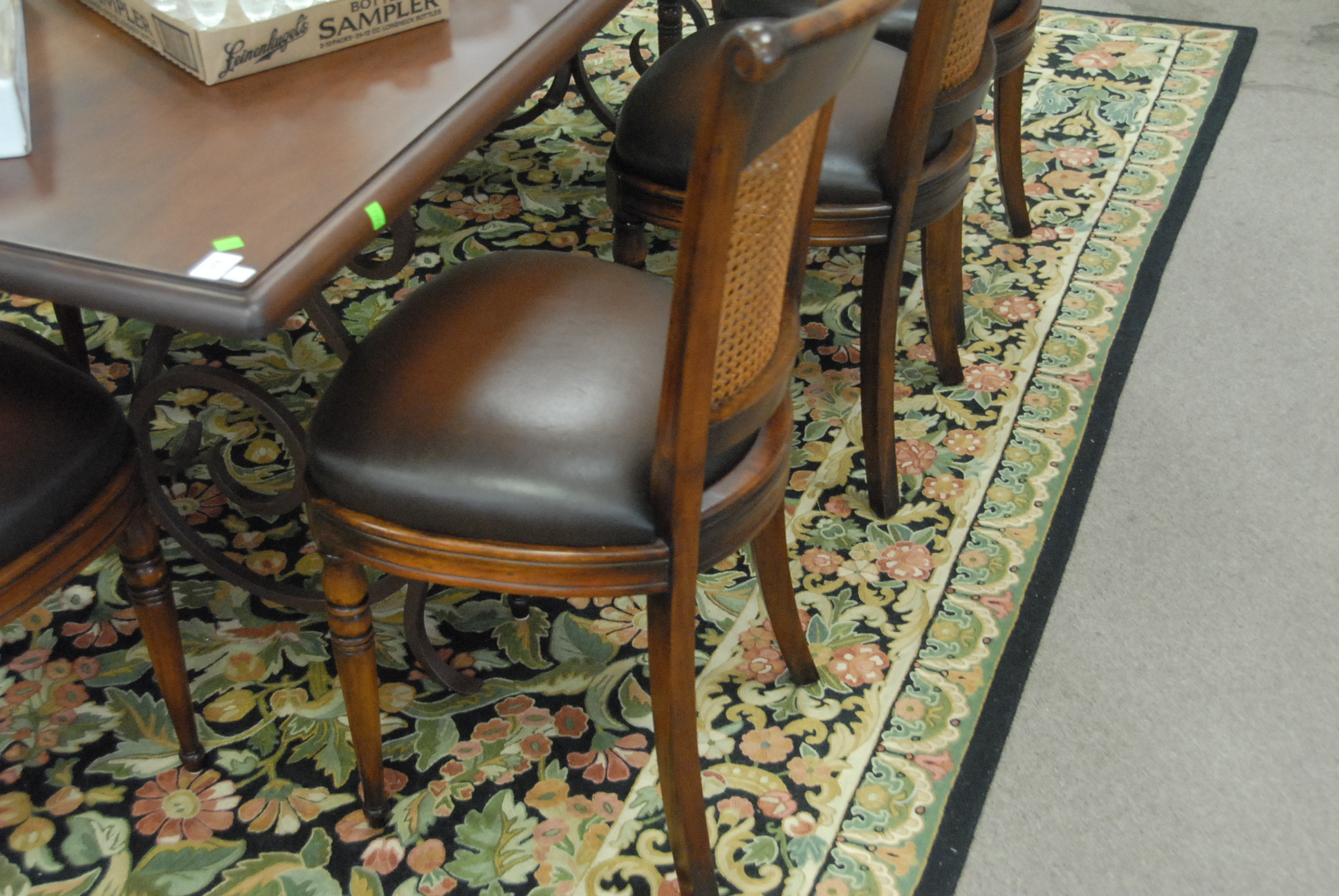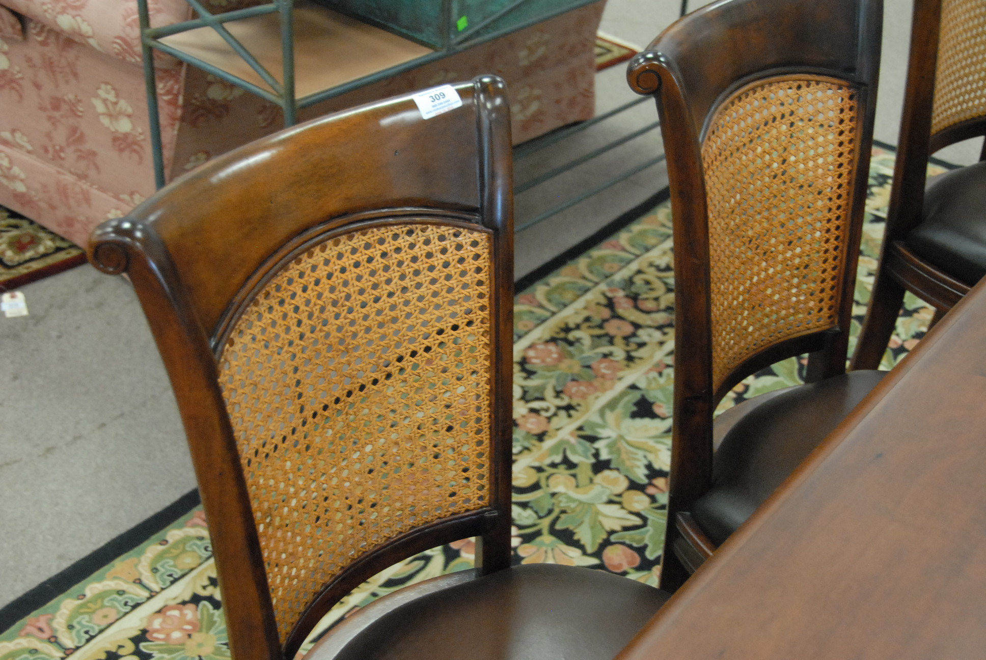 Lot 309: Set of eight Theodore Alexander side chairs with leather seats and cane backs all in excellent condition.