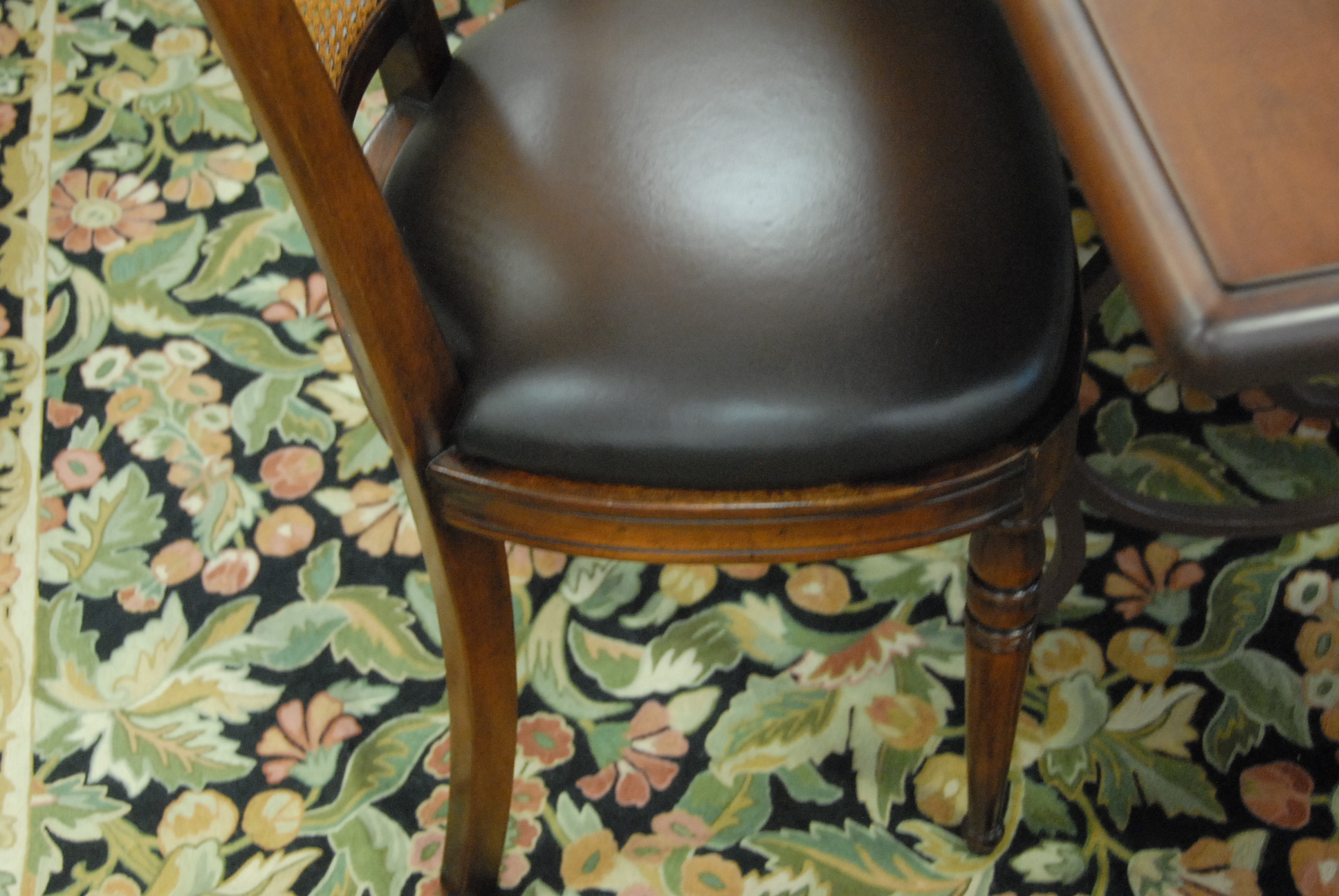 Set of eight Theodore Alexander side chairs with leather seats and cane backs all in excellent condition.