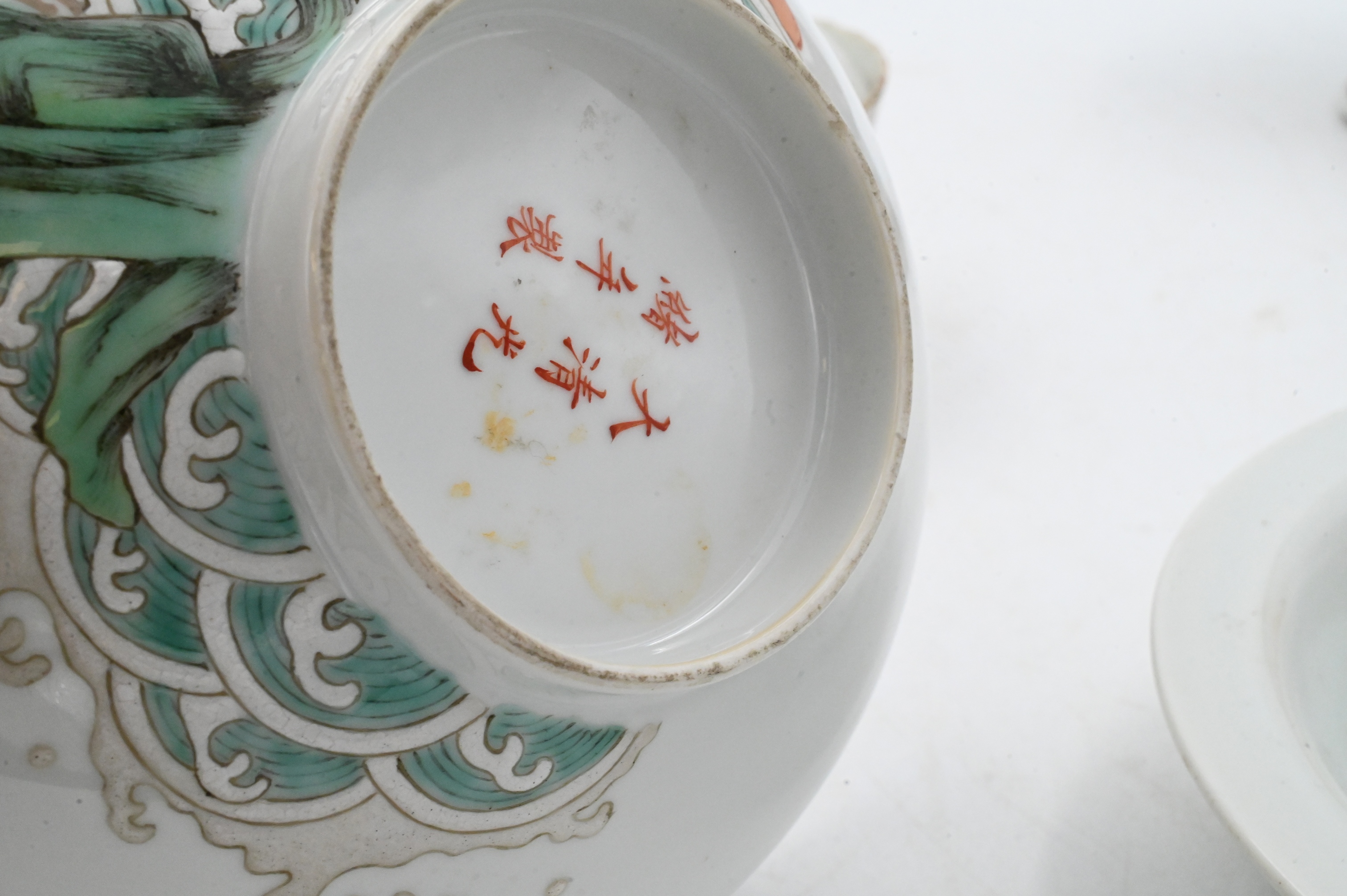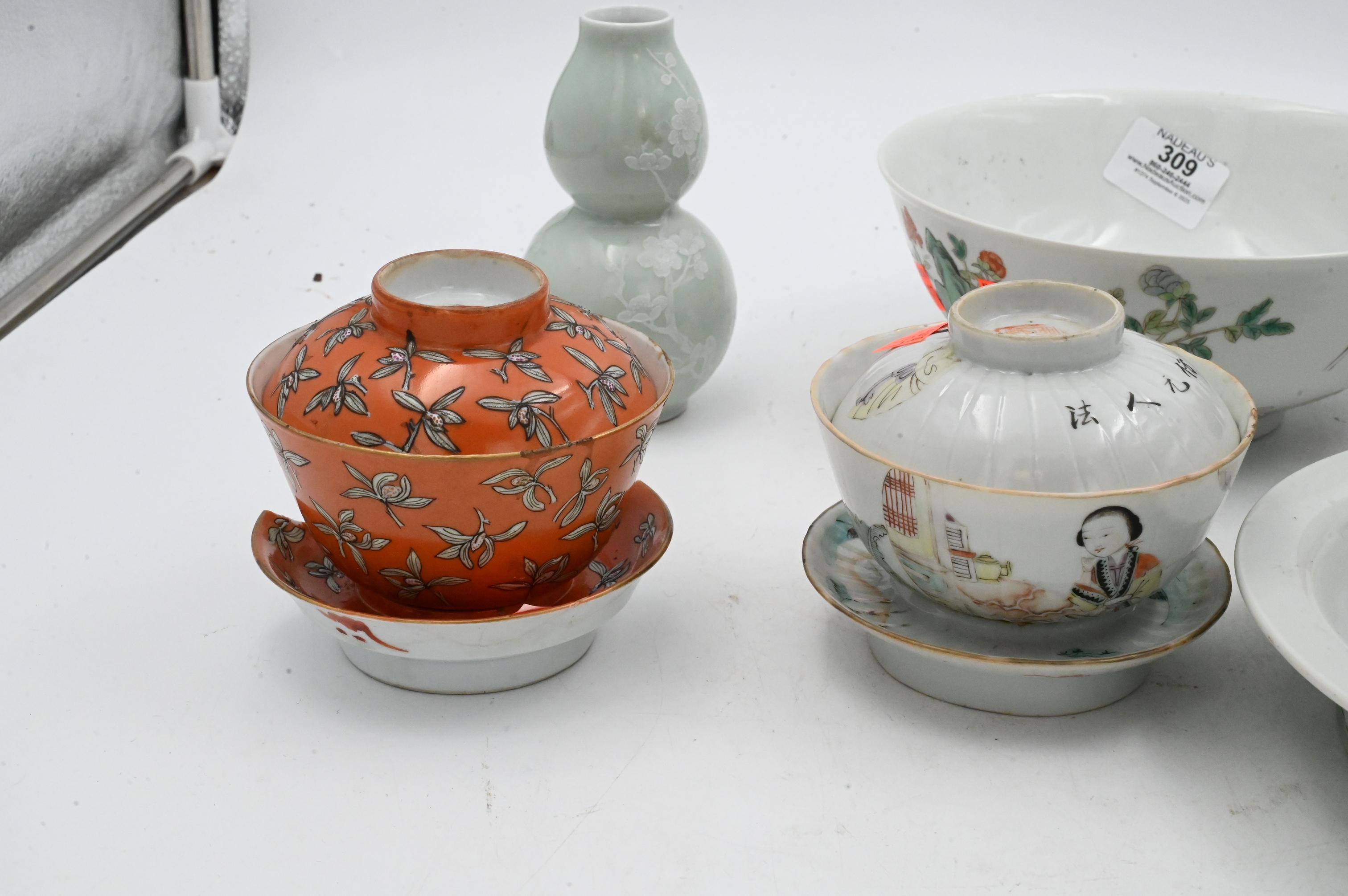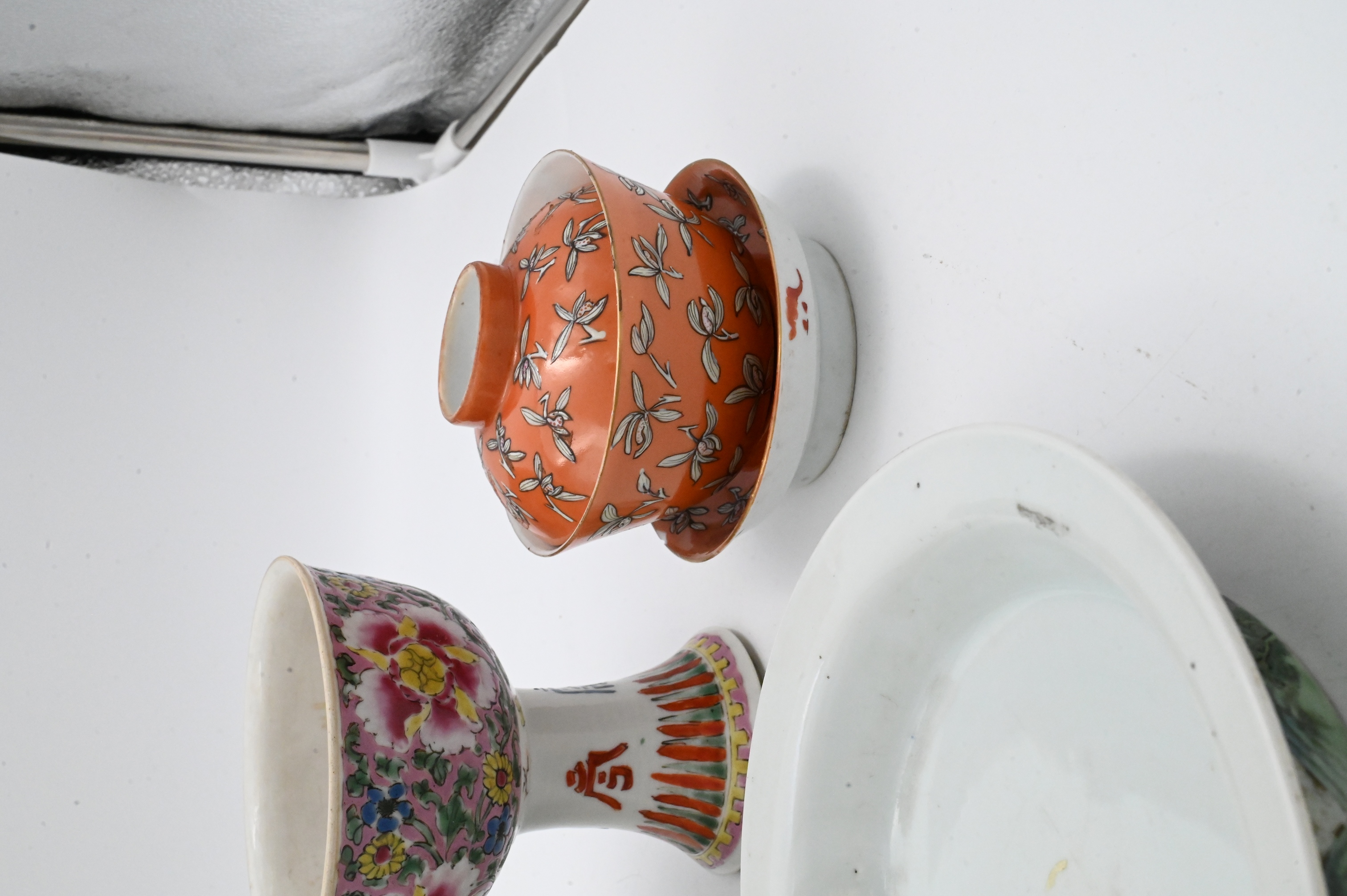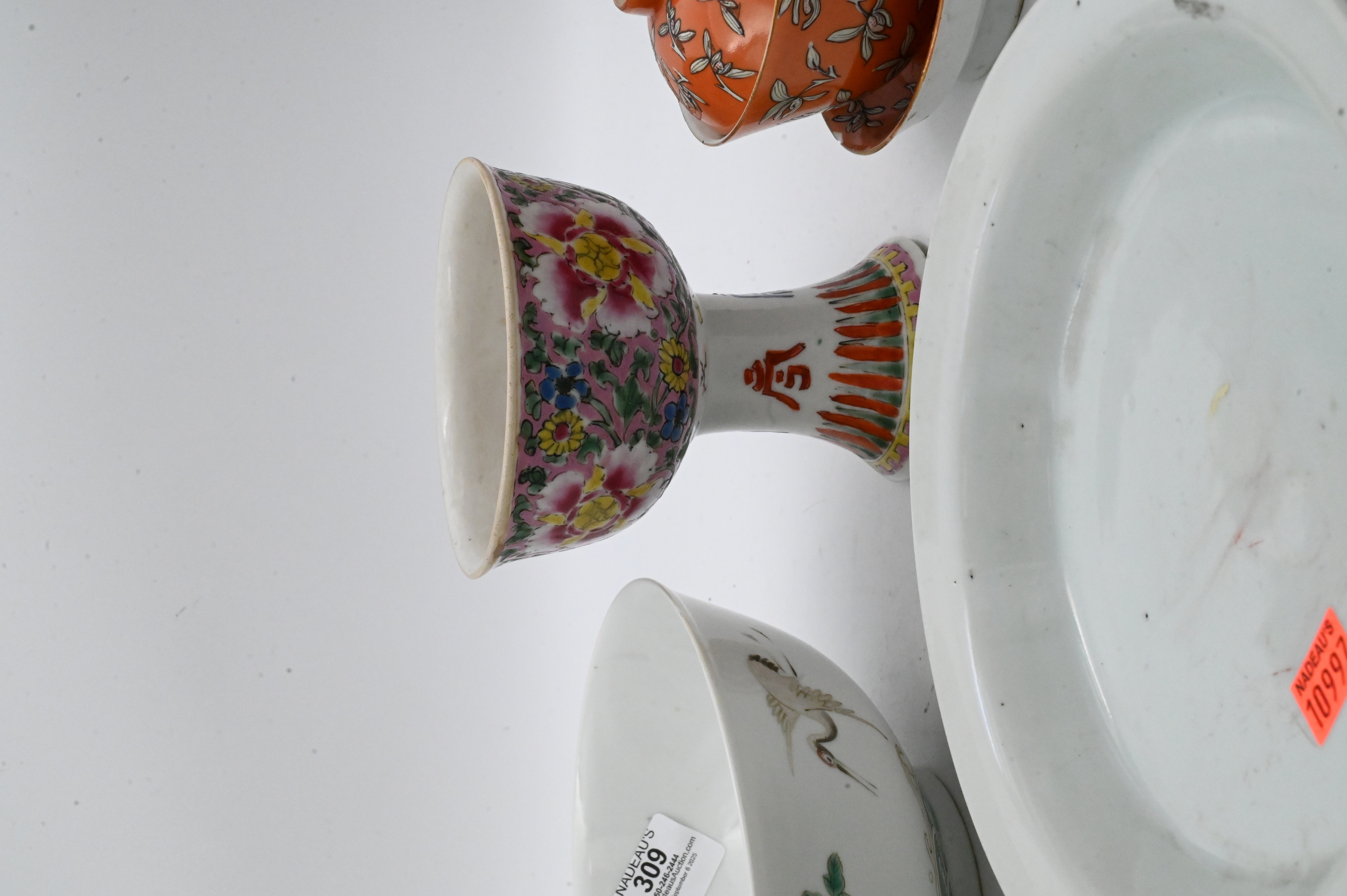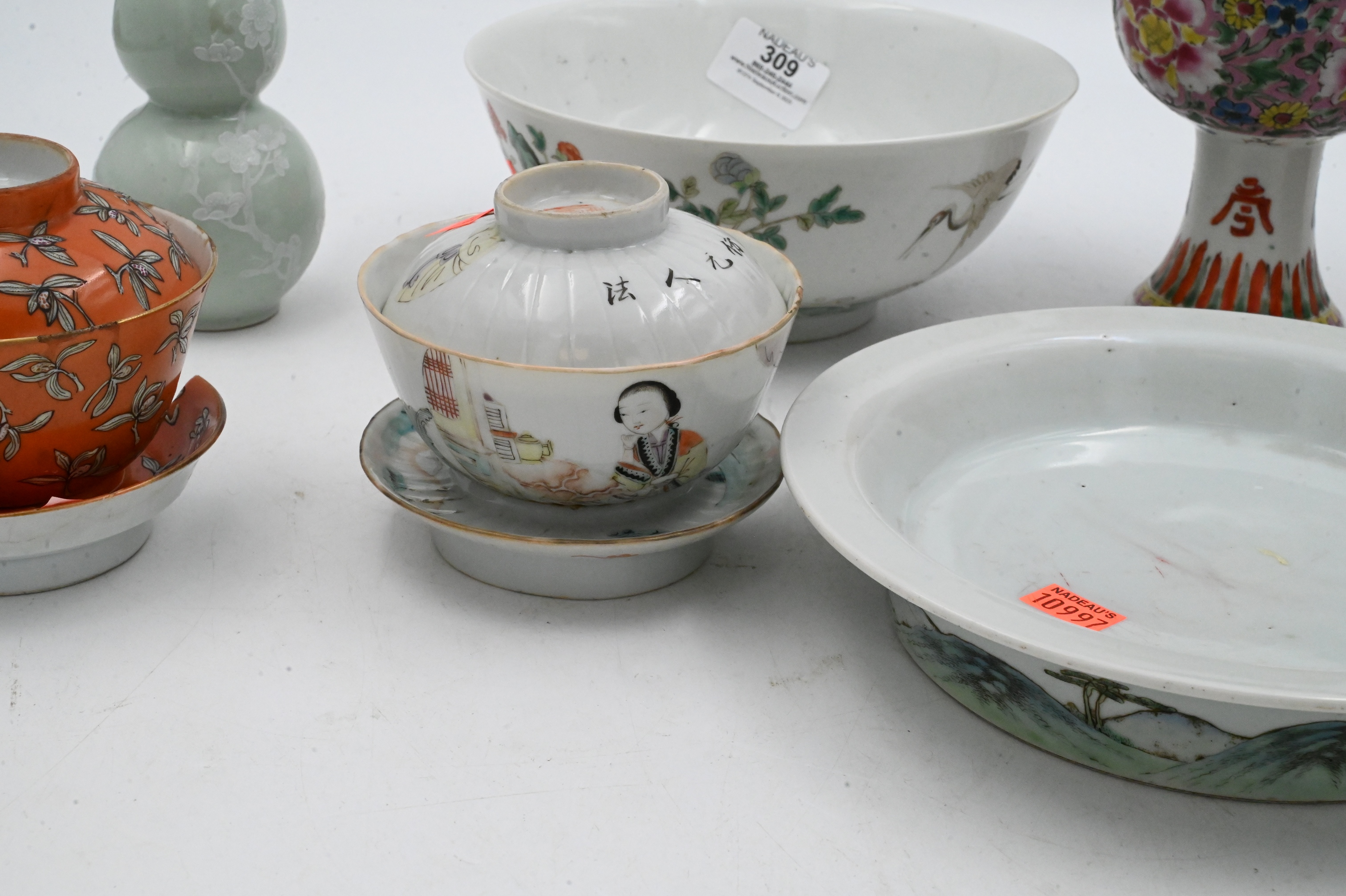 celadon double gourd vase, pair of orange teacups with stand and lid, famille rose pedestal cup, crane and waves bowl etc…
