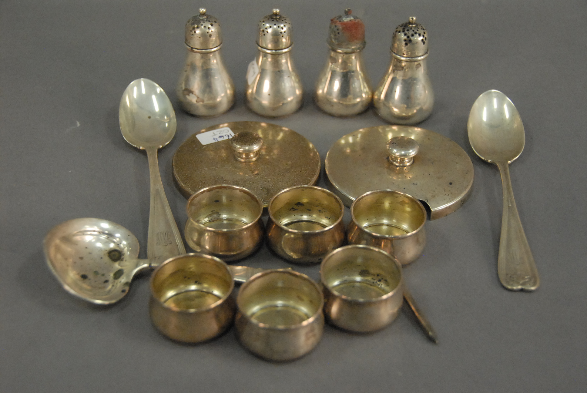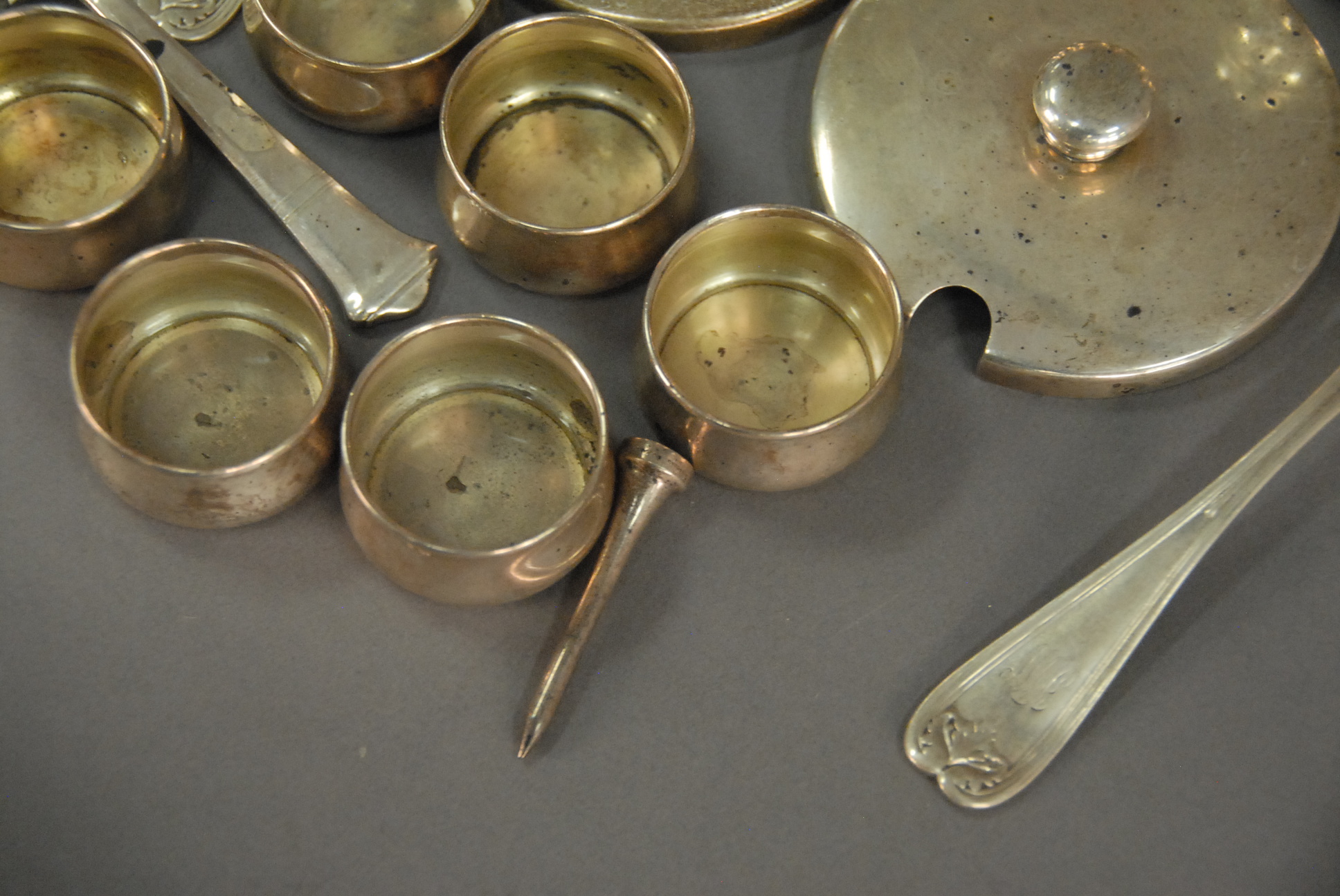 Lot 309: Tray lot of Tiffany sterling to include salts, peppers, spoons, two covers, and golf tee. 16.4 t oz.
