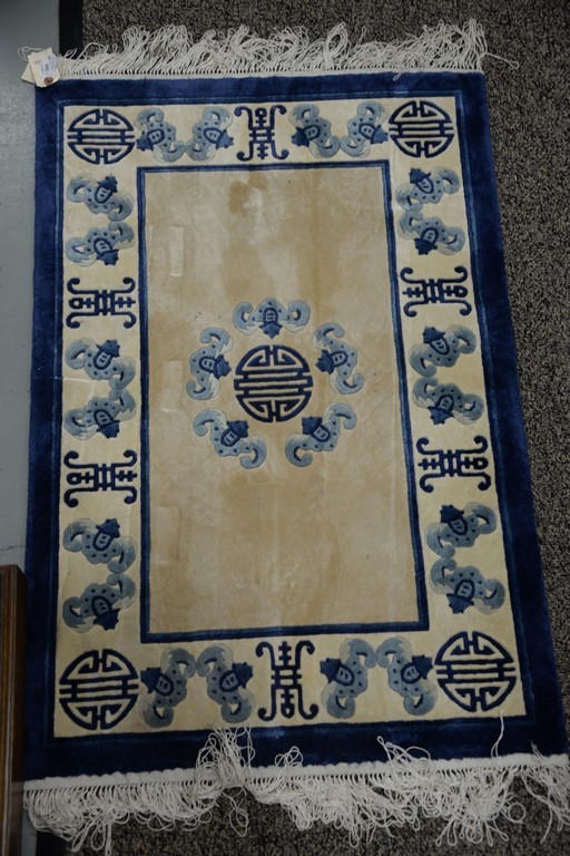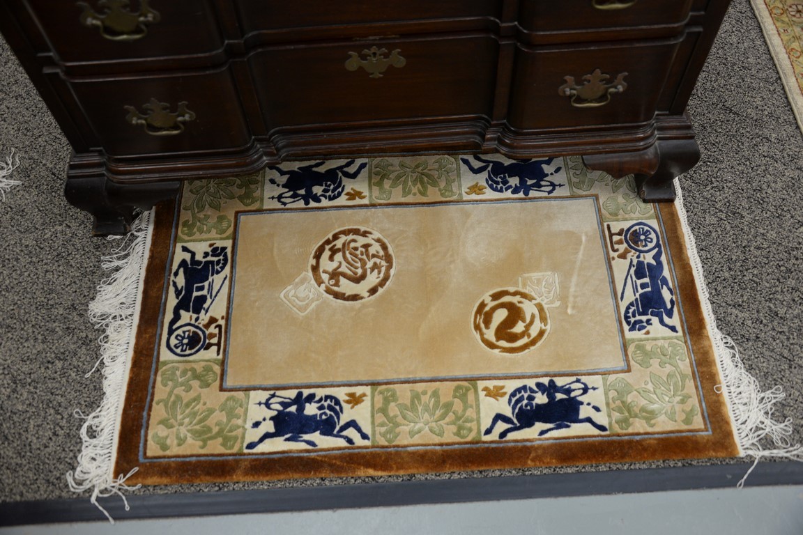 Two Chinese silk Oriental throw rugs. each 2′ x 3′ Provenance: Estate of Arthur C. Pinto, MD