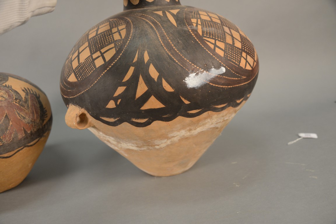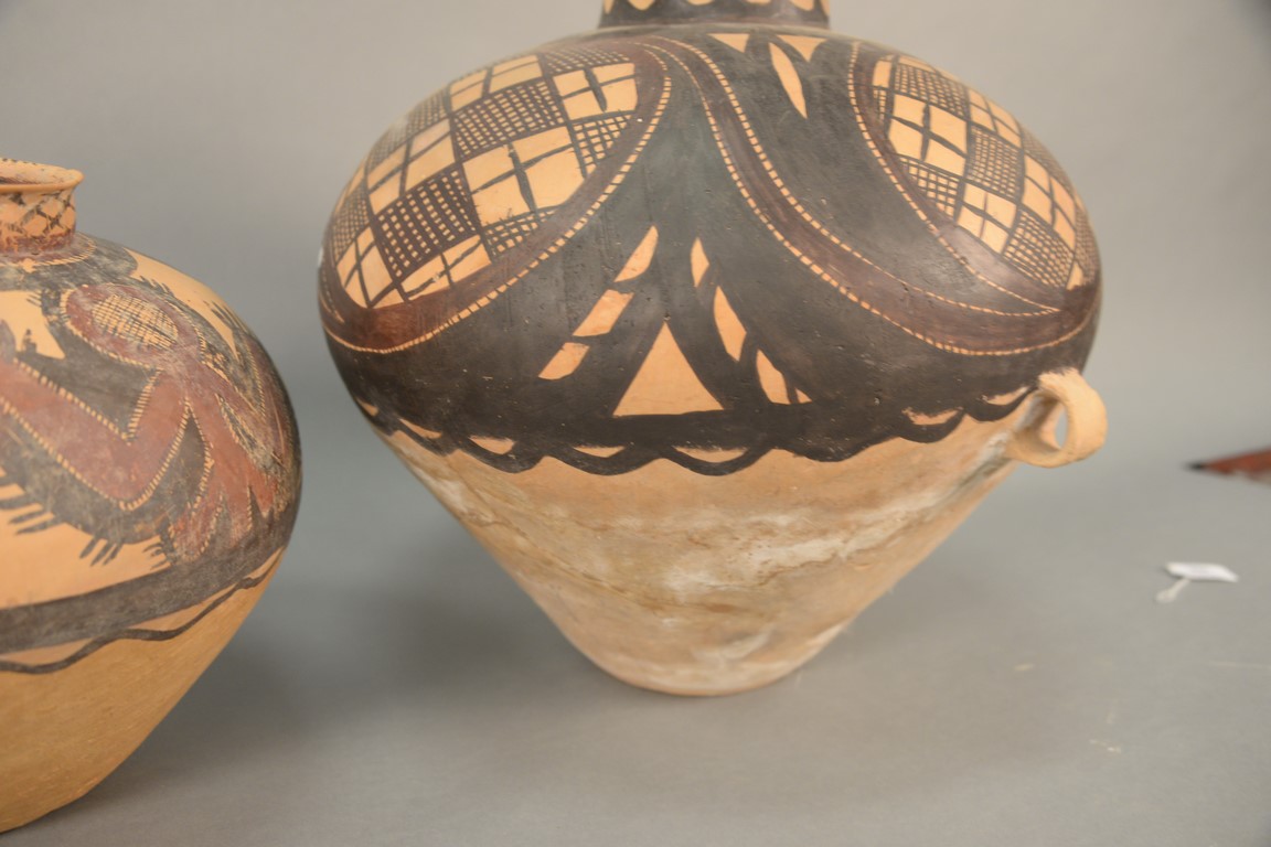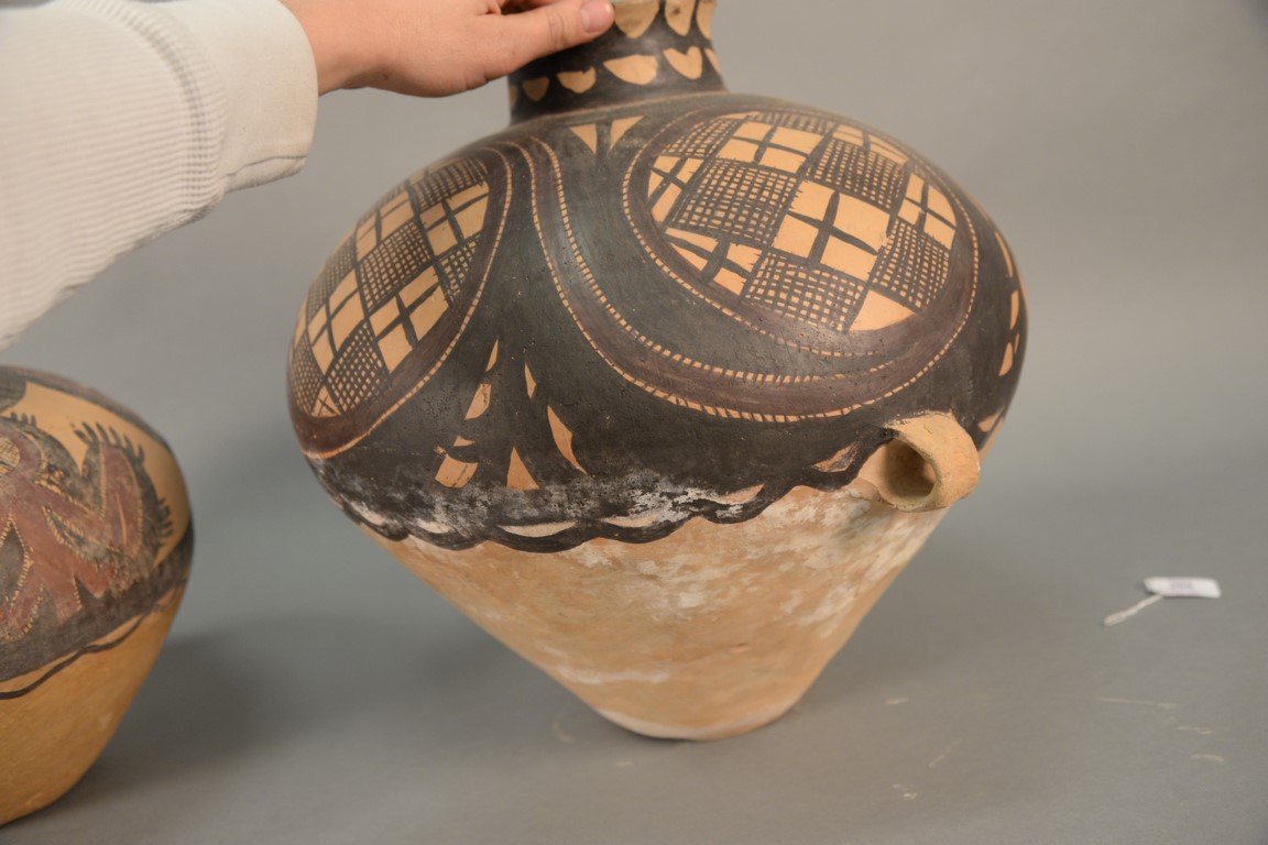 Two painted red pottery jars, Majiayao culture, Machang type, painted in red and black with anthropomorphic figural designs and abstract patterns, formally appraised as 3rd century B.C. heights 11 1/2 inches and 16 inches