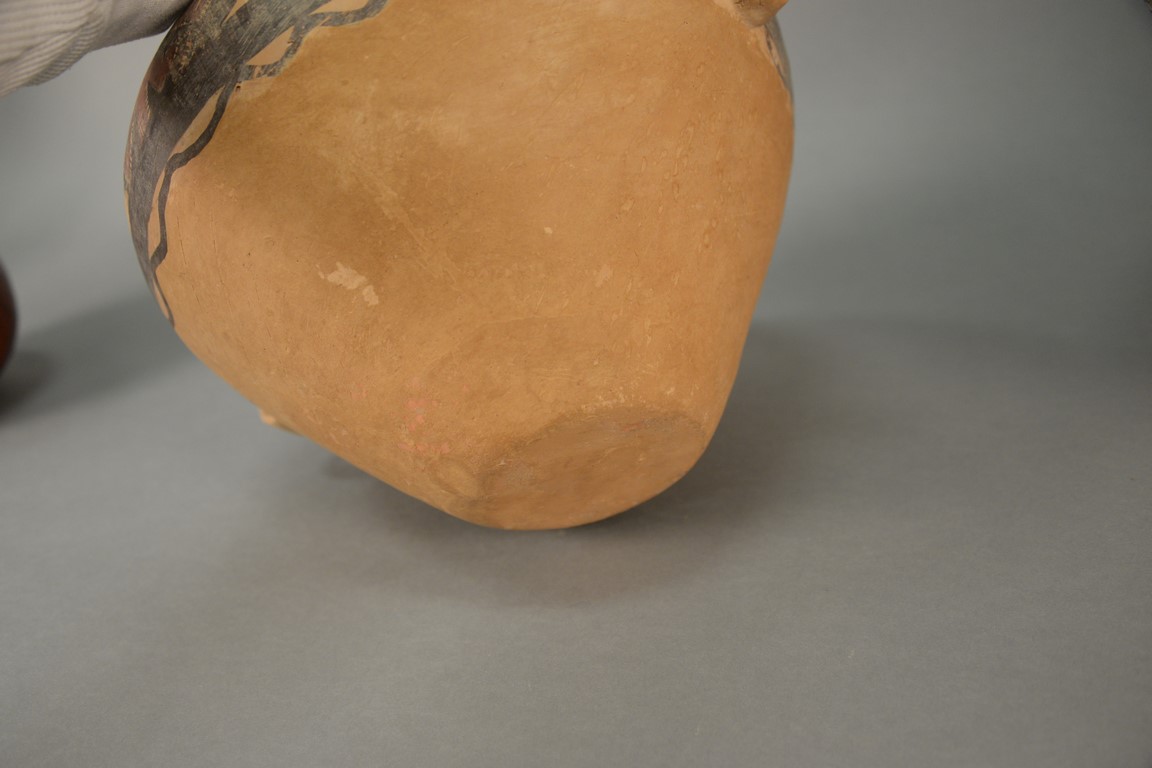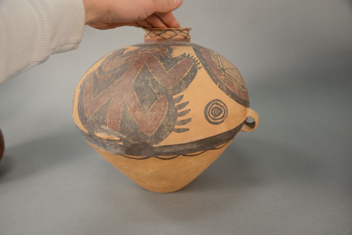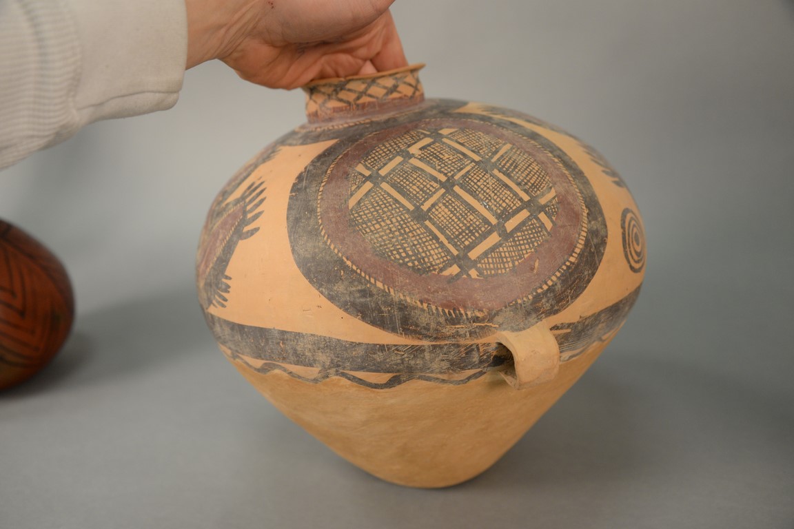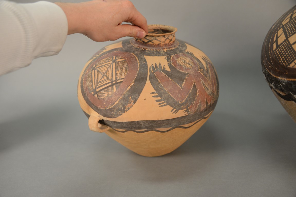 Lot 309: Two painted red pottery jars, Majiayao culture, Machang type, painted in red and black with anthropomorphic figural designs and abst…