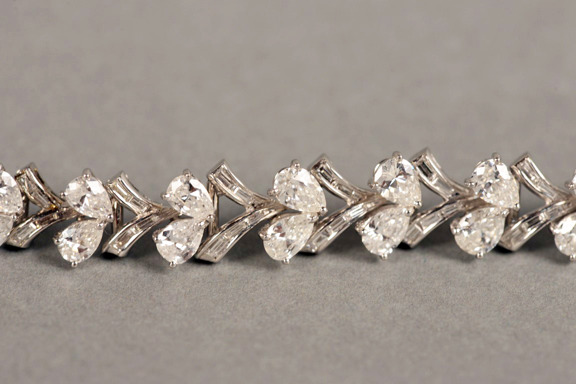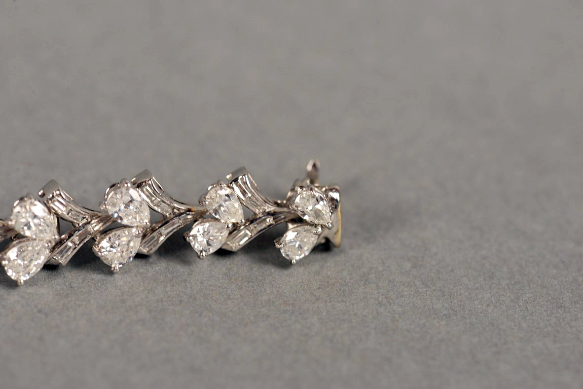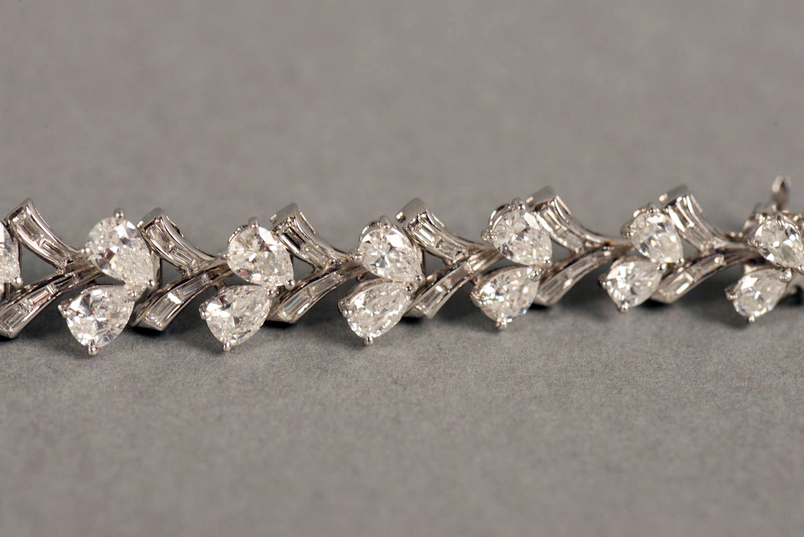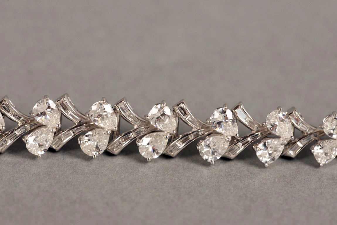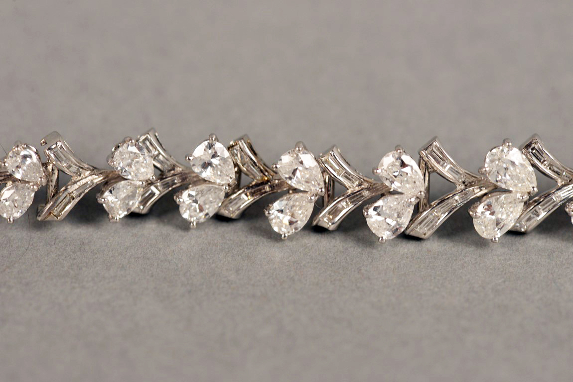 Lady’s platinum diamond bracelet. This bracelet is set with 16 V shaped links. The links alternate with two pear shaped diamonds and baguette cut diamonds in each link, alternating. Ten links each have four baguette cut diamonds and center six links each have five baguette cut diamonds. The pear shape diamonds range in size from approximately .25 carats to approximately .45 carats with an approximate total carat weight of 11 carats by formula. There are thirty-two 32 pear shaped diamonds. The diamonds average G-H color and average SI1-SI2 clarity. There are seventy 70 baguette cut diamonds with an approximate carat weight of 2 carats by formula. The baguettes average G-H Color and VS2 clarity. The pear shape diamonds are set in three prong heads. The baguette cut diamonds are channel set. The bracelet has a hidden fold over catch marked 5582. The bracelet tests platinum. 13cts. total
