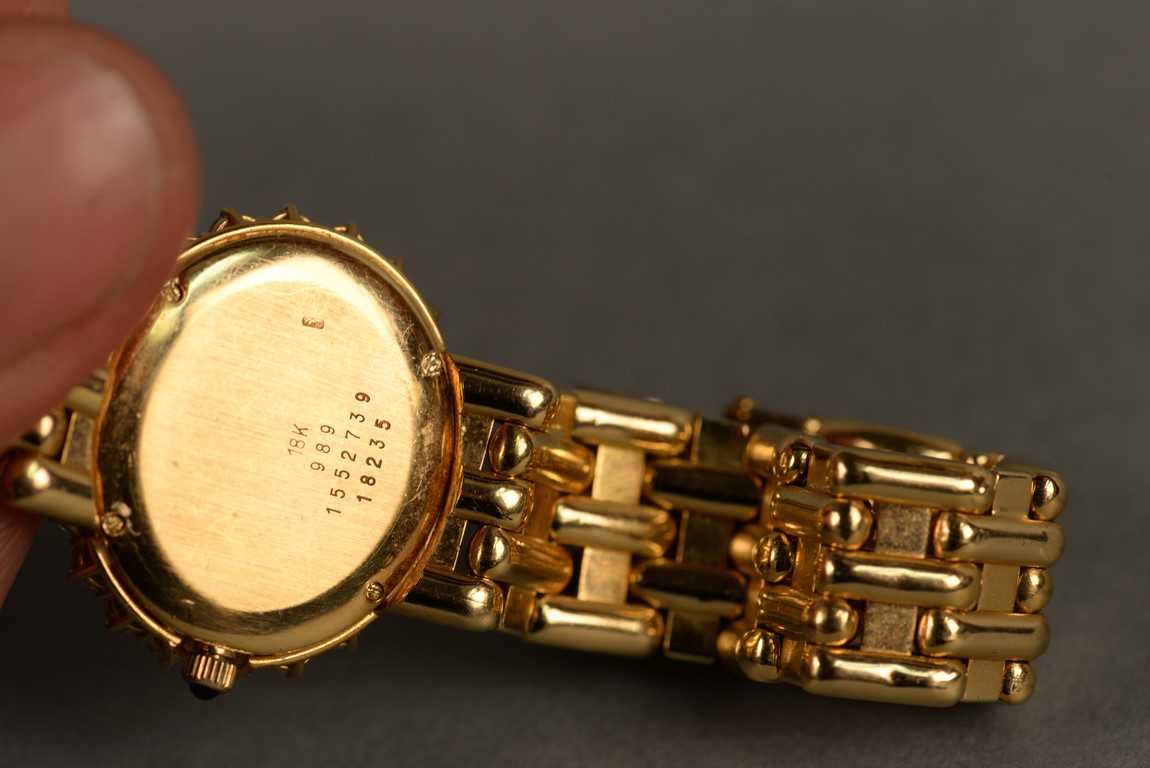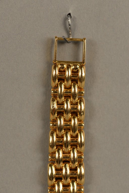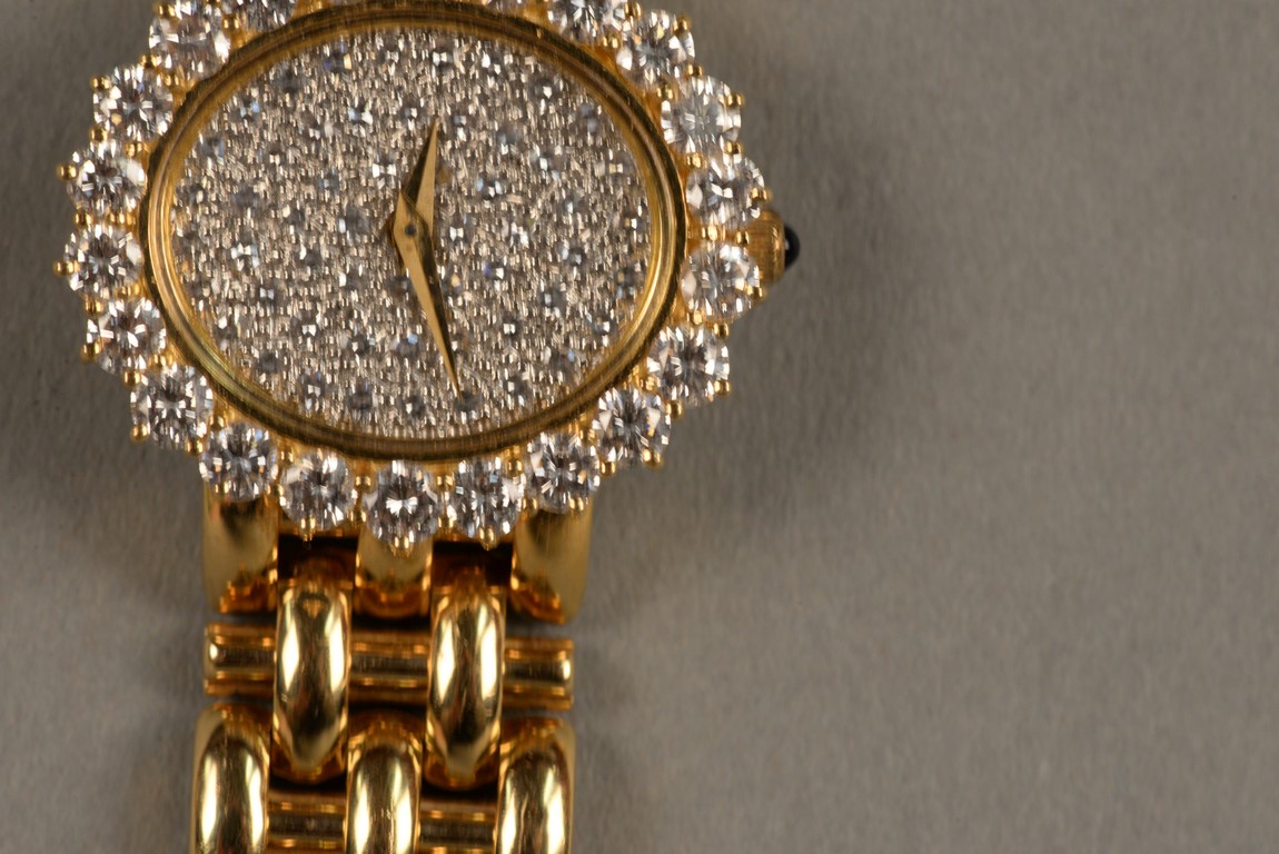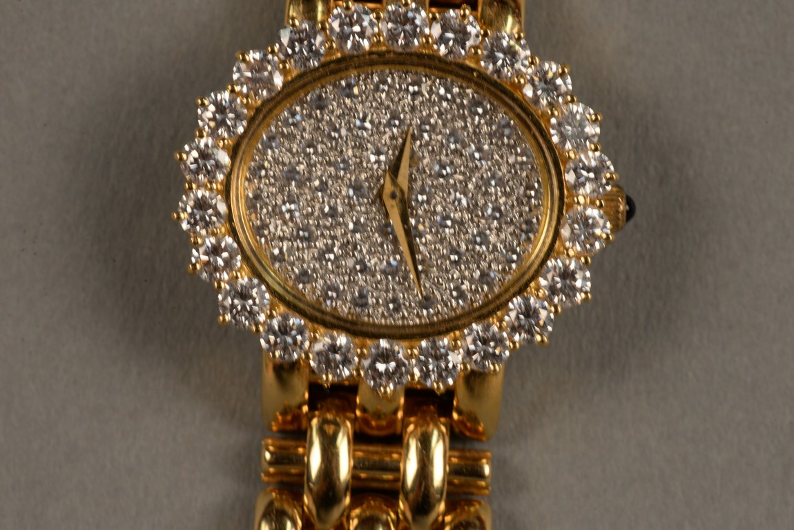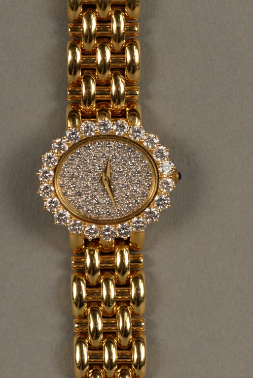 Lot 30E: Baume & Mercier 18K yellow gold ladies diamond and gold wristwatch with oval diamond pave face surrounded by twenty-two 22 round s…