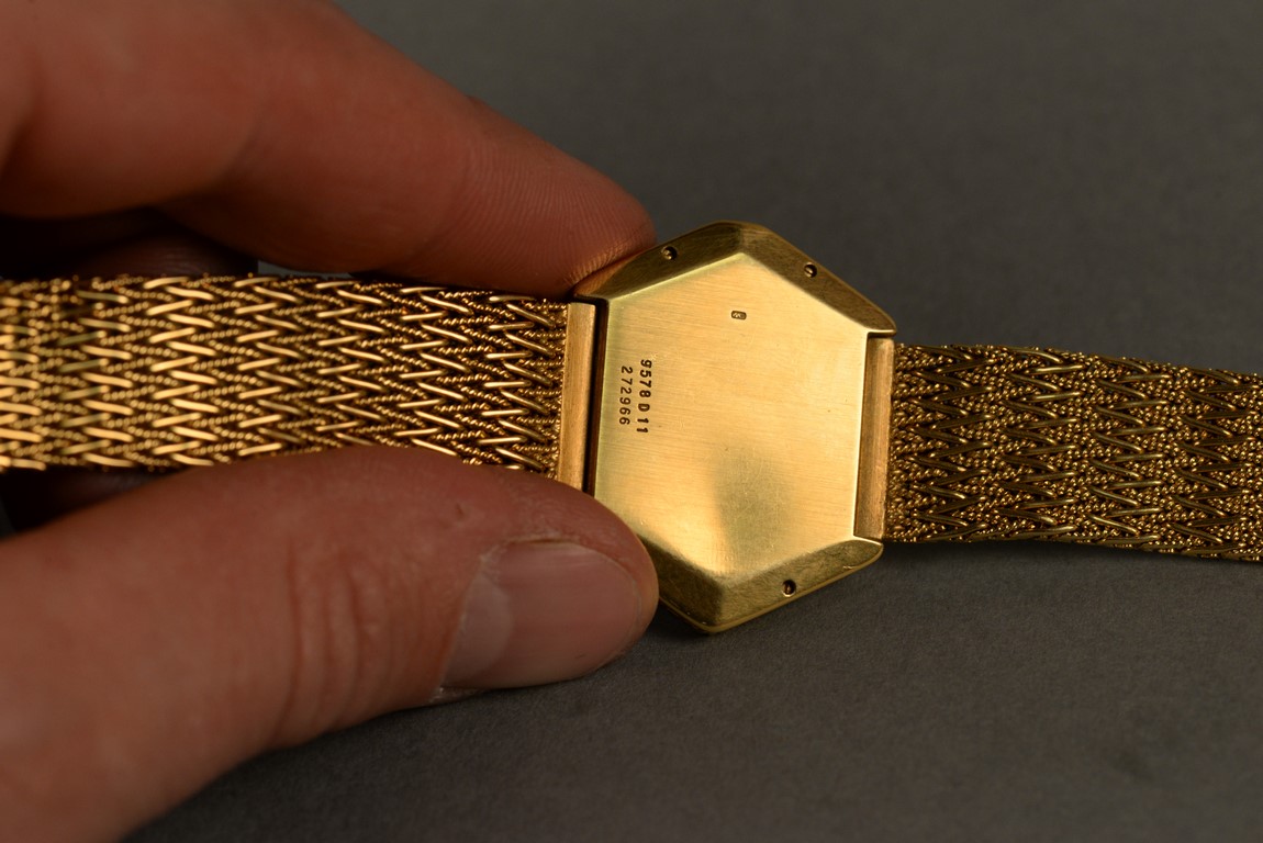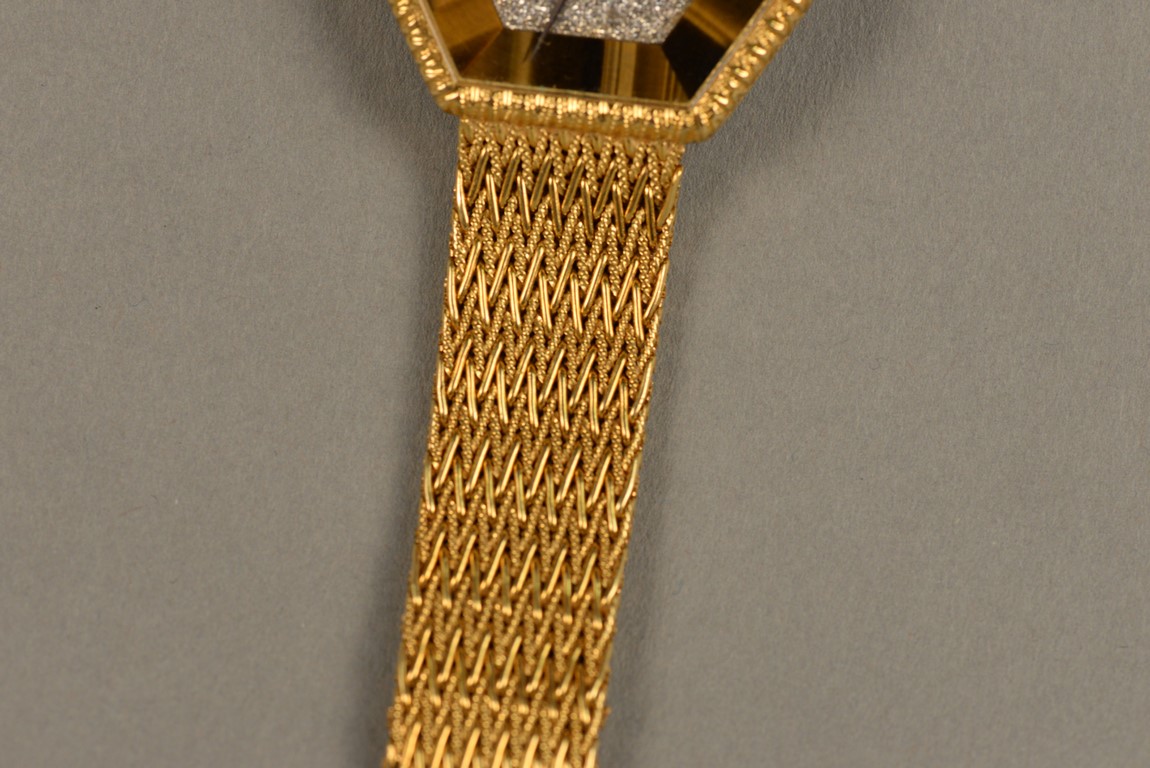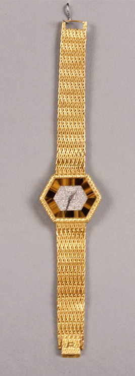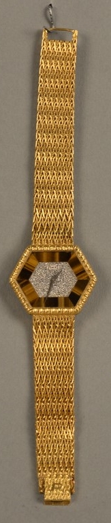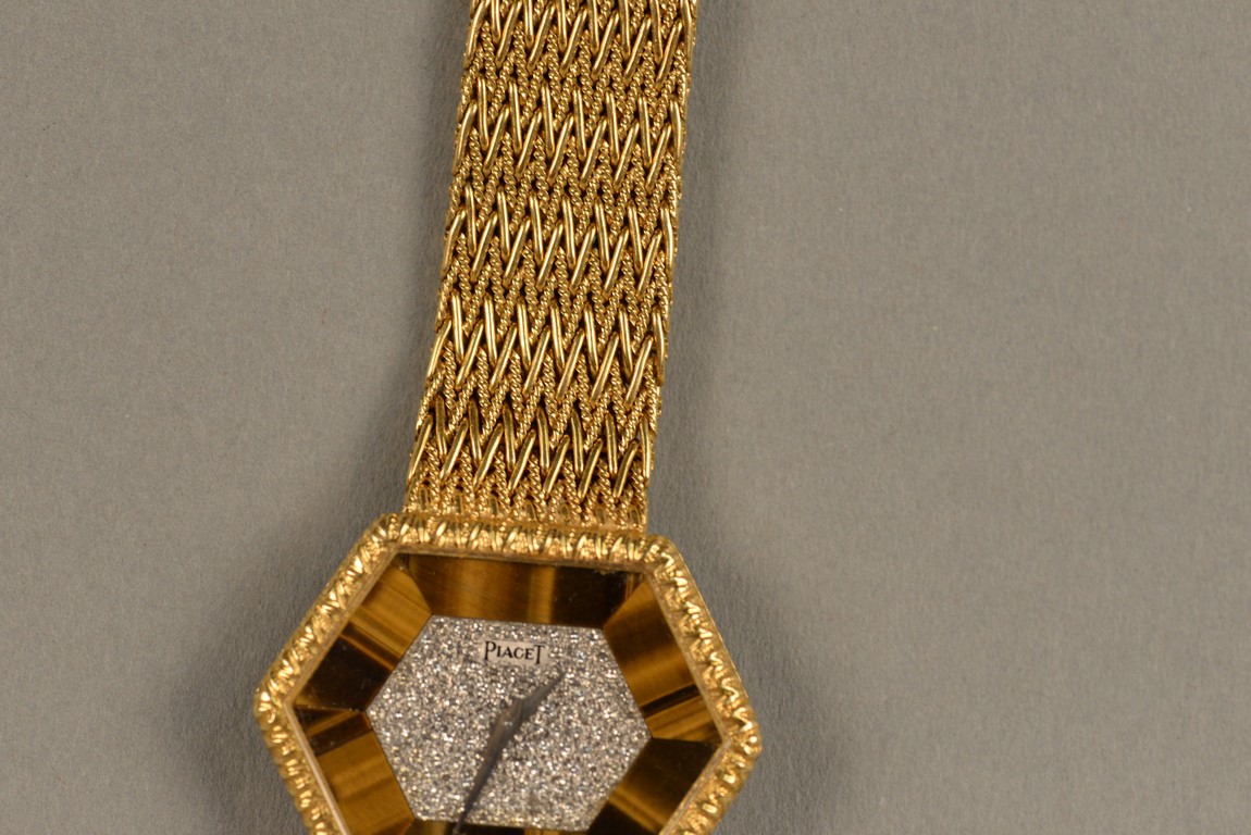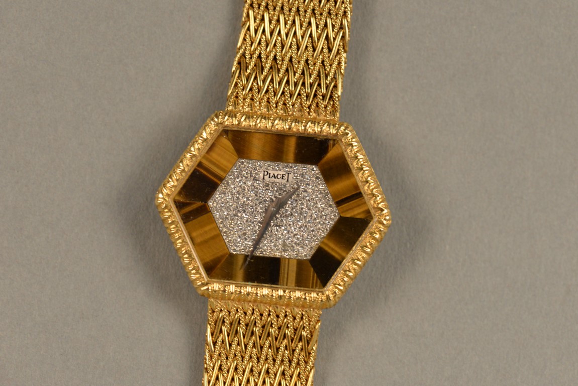 Lot 30F: Piaget hexagon gold, tiger eye, and diamond bracelet watch, having hexagon shaped dial set with tiger’s eye and pave diamond face ma…
