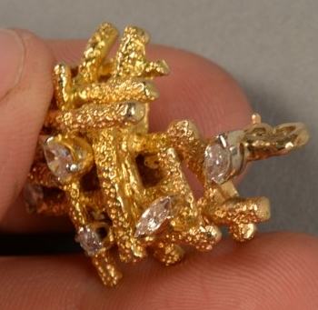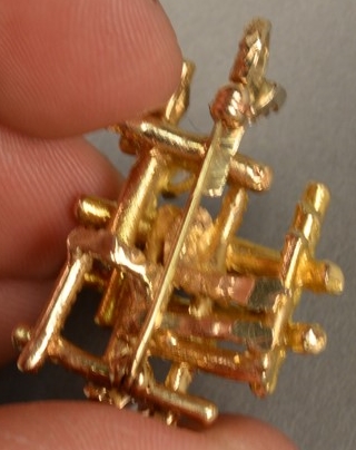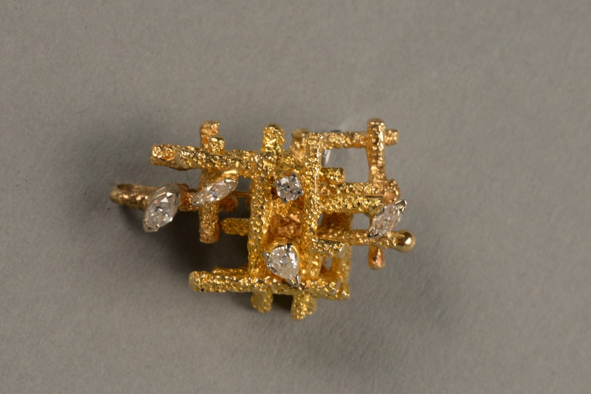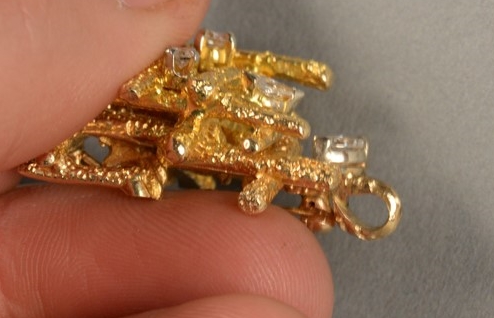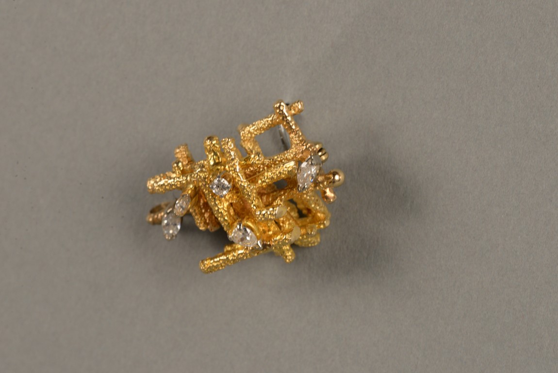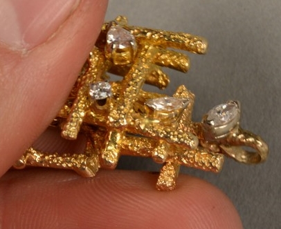 Lot 30H: 14K Yellow gold contemporary pendant/pin set with five diamonds, three marquis, one pear shape, and one round. 17.5 grams