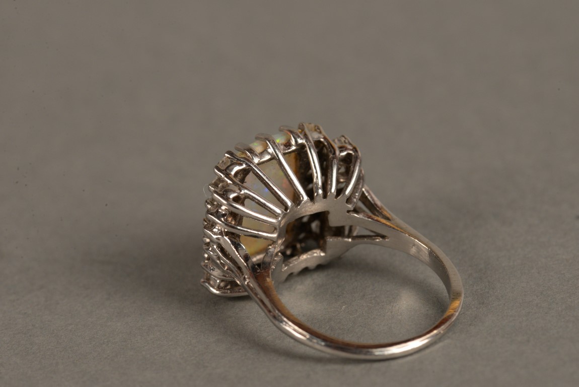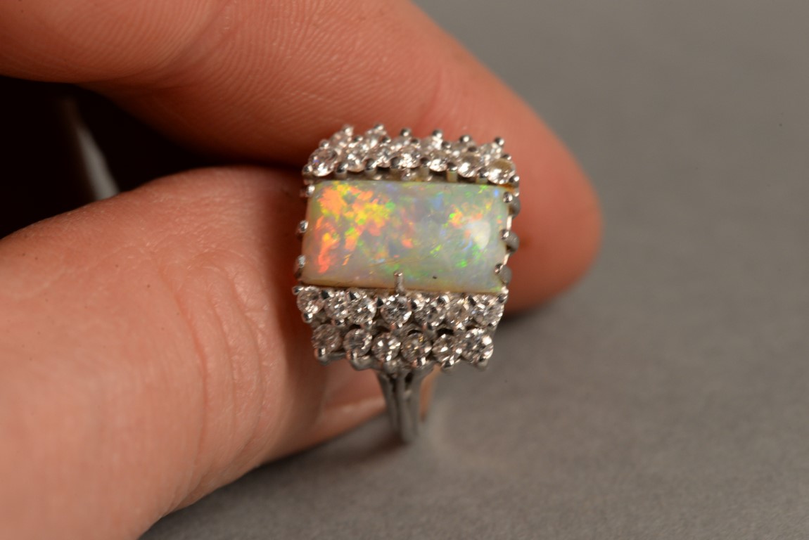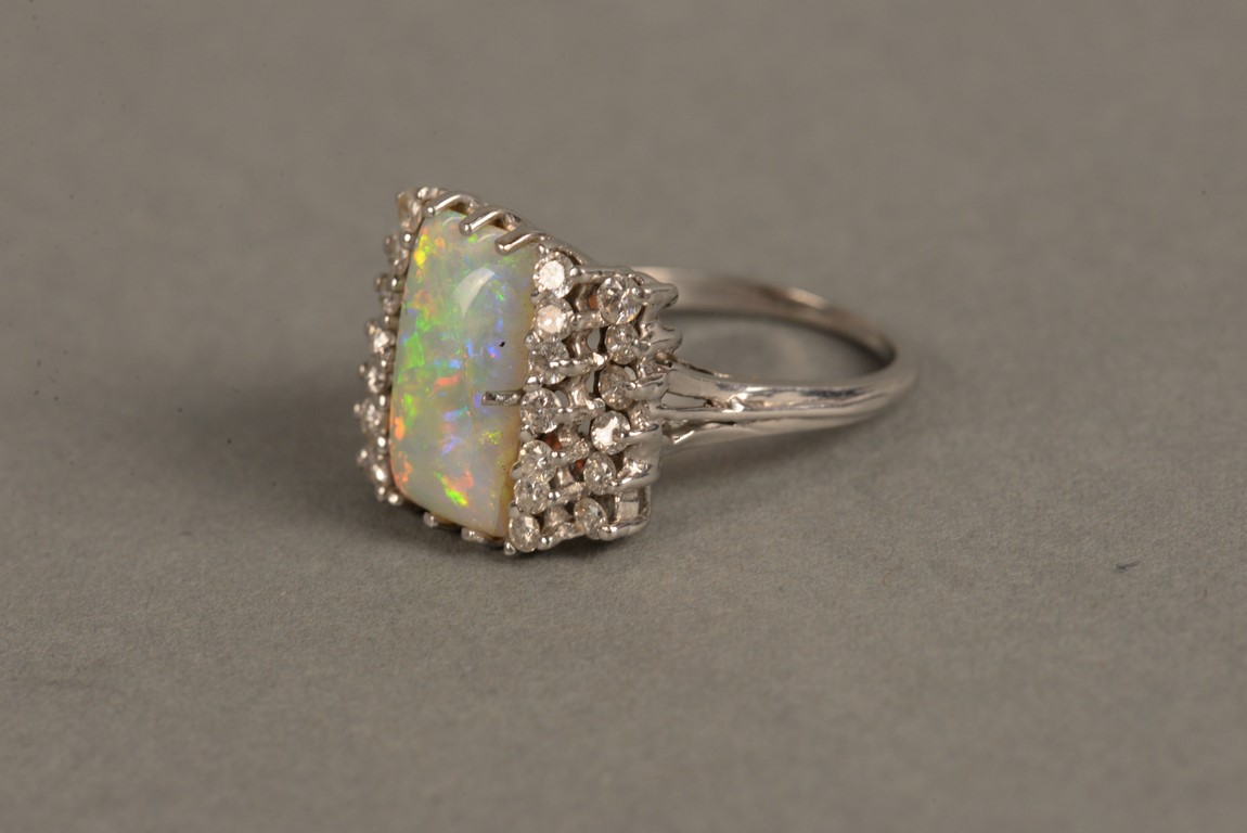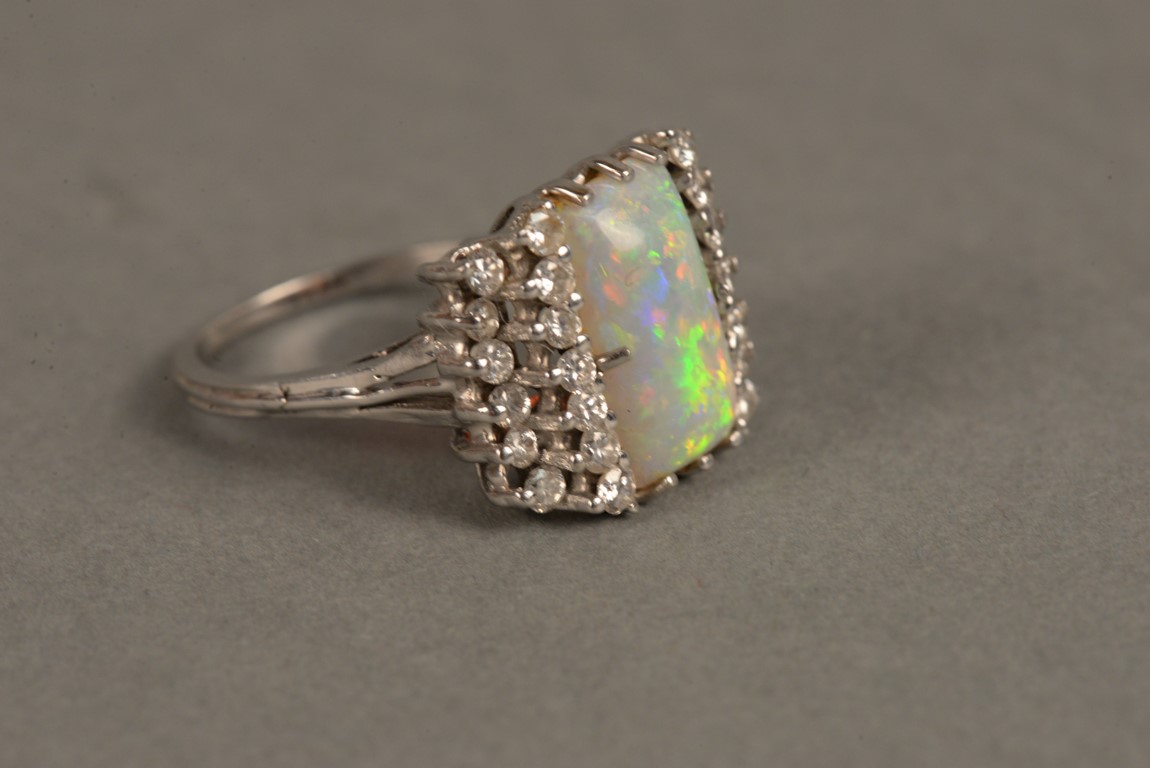 Lot 30J: 14K white gold ladies ring with large emerald cut fire opal flanked by thirteen 13 diamonds on either side. crack in corner