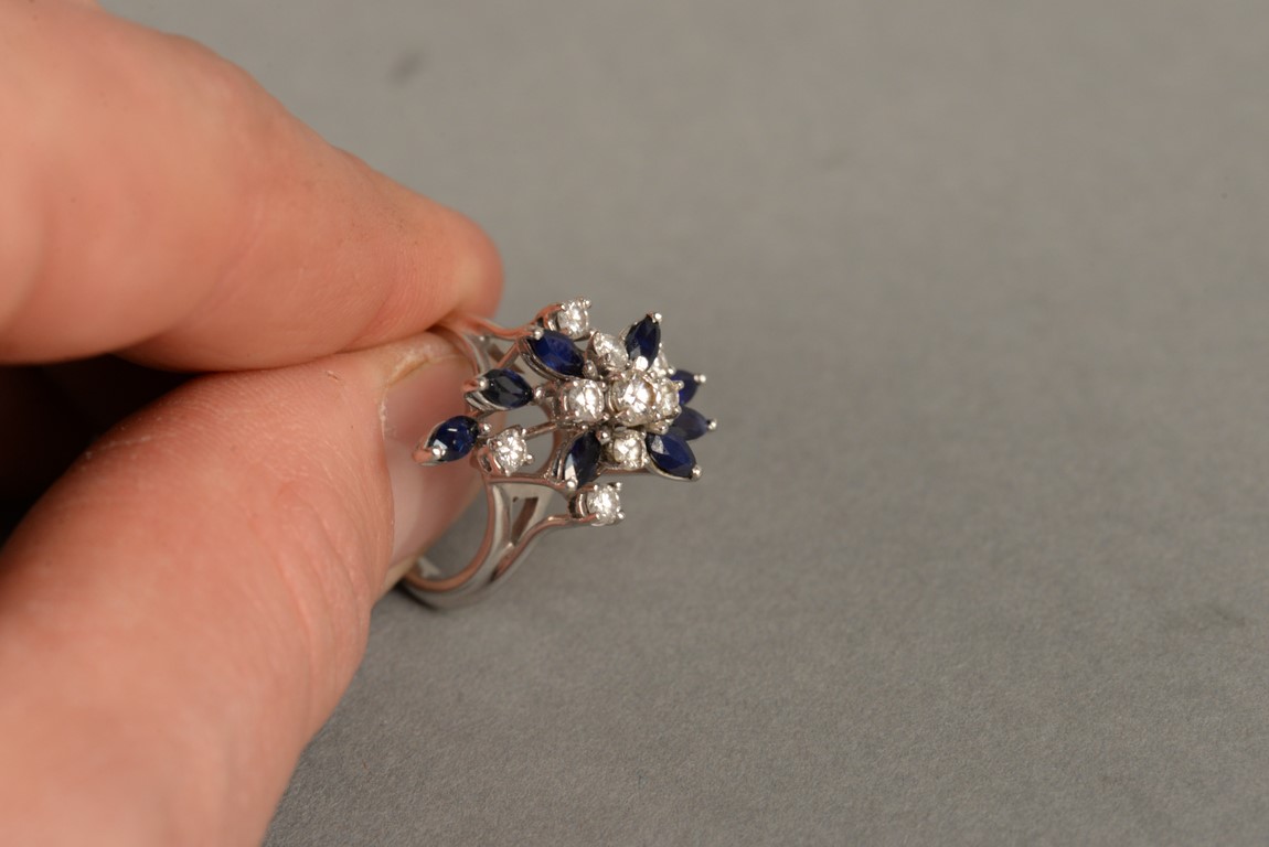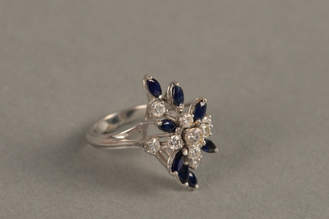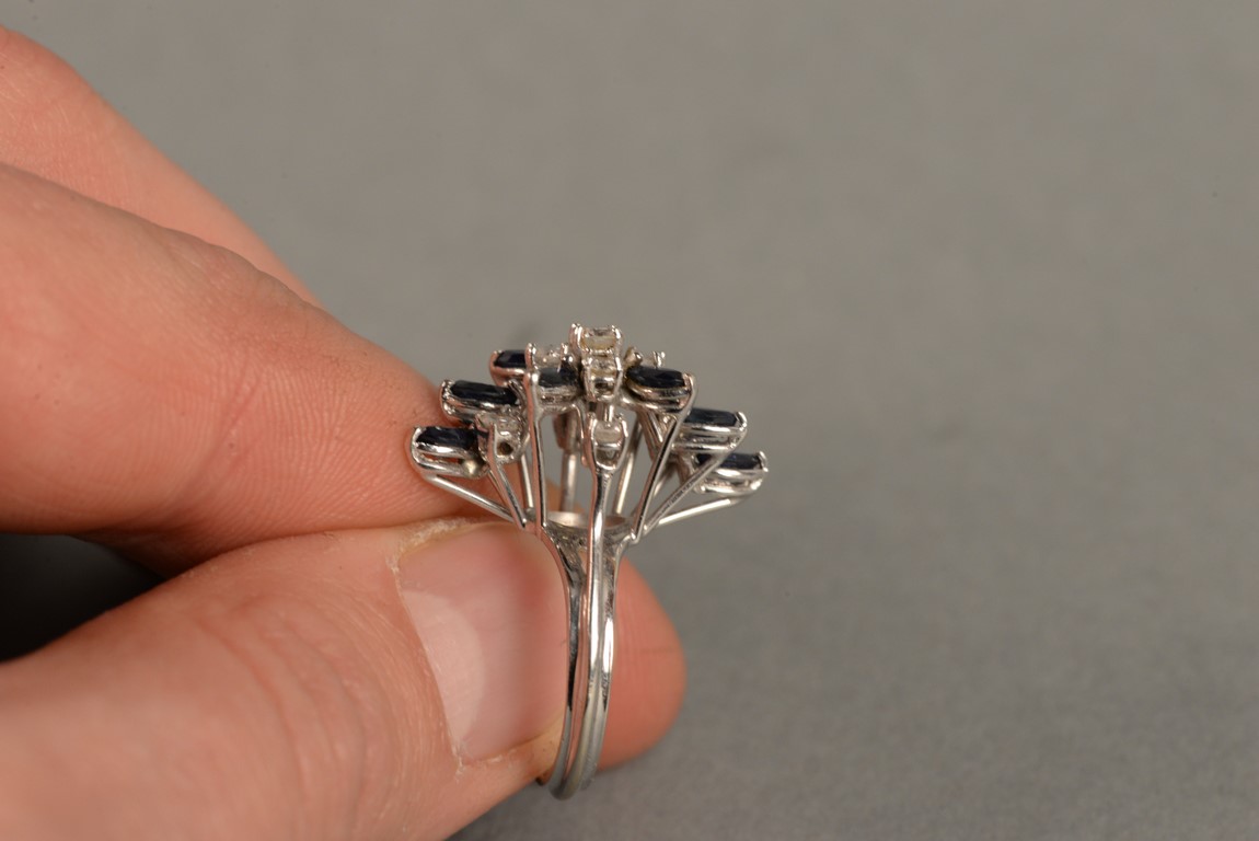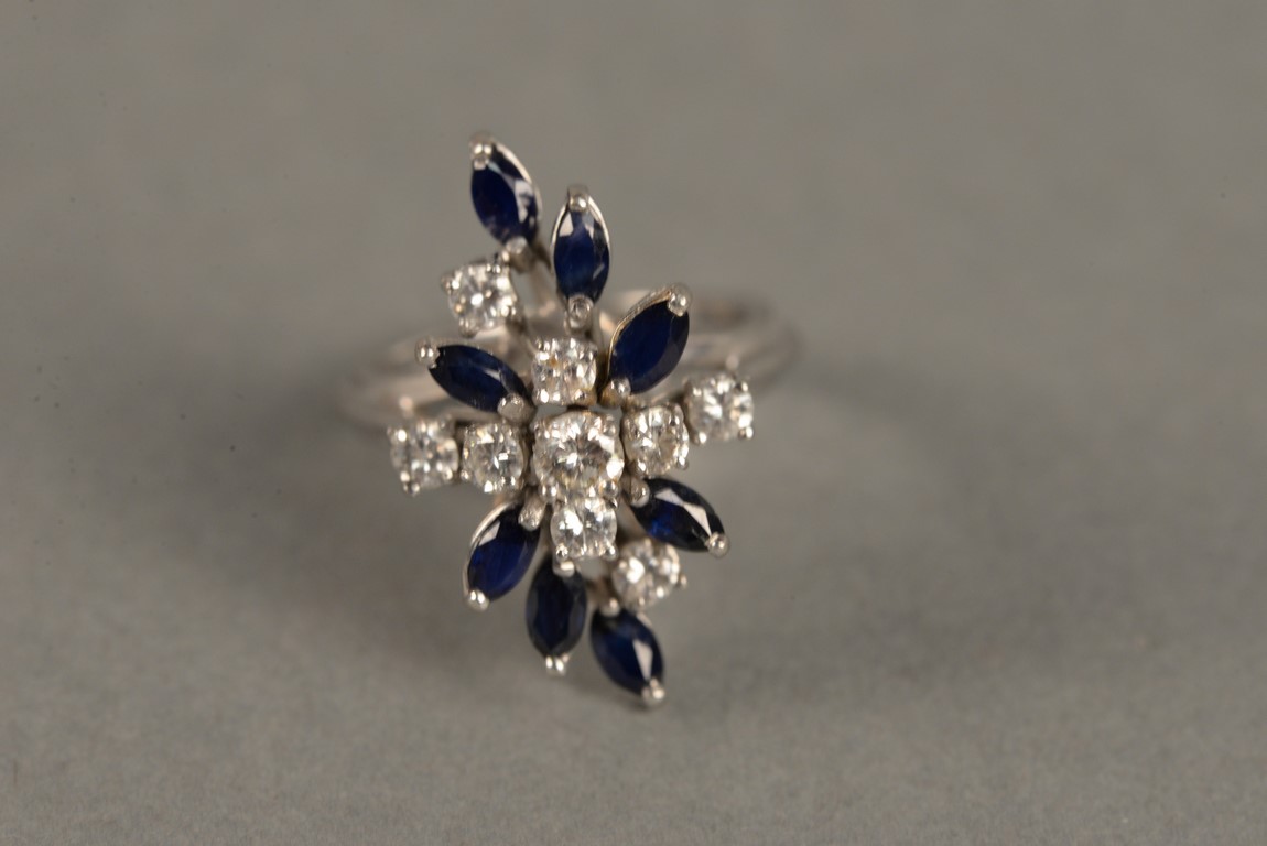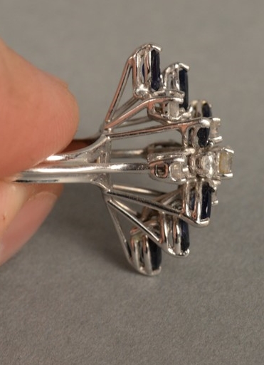 18K white gold ladies cocktail ring set with nine 9 diamonds and eight 8 sapphires.