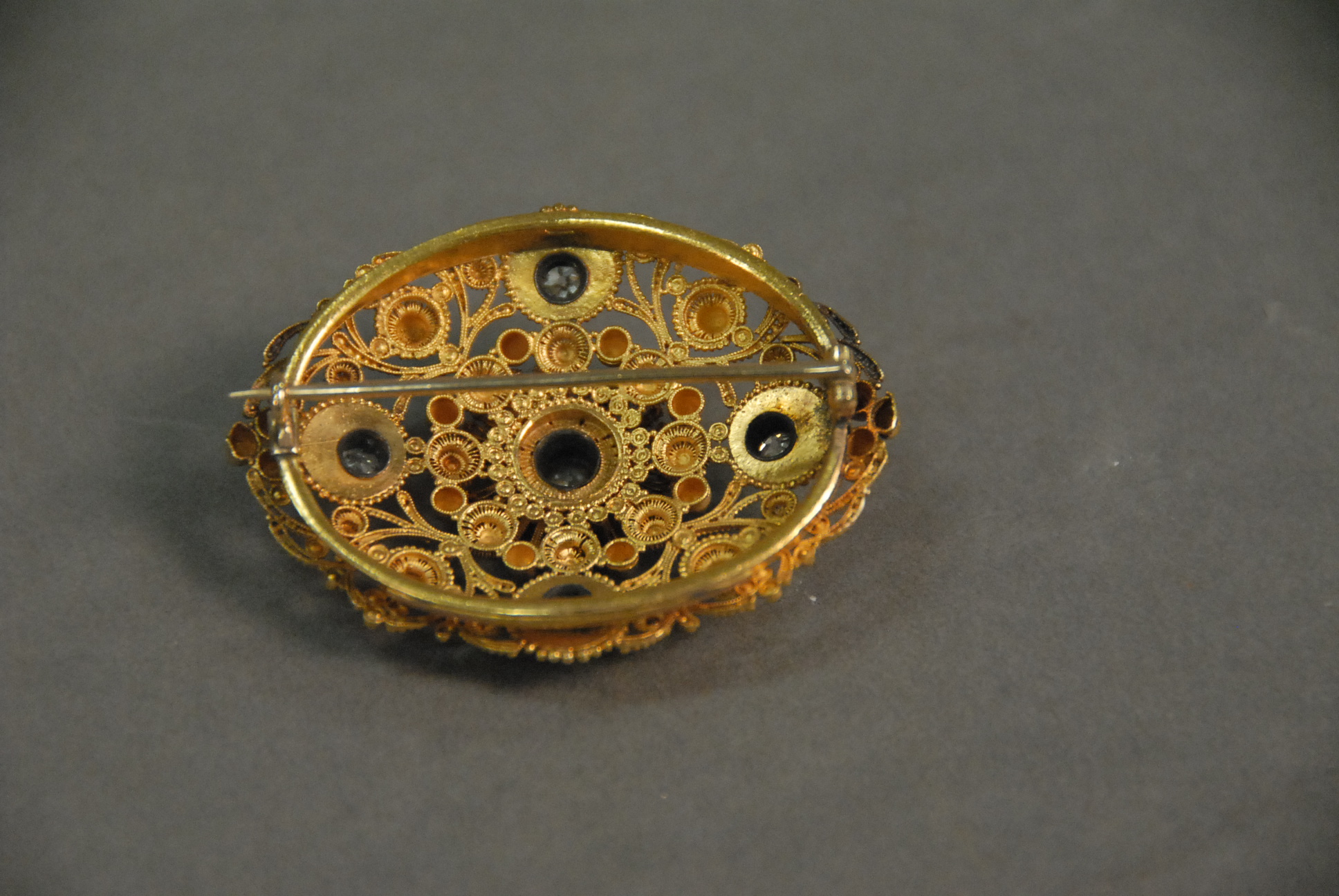 14K diamond and gold Victorian pin, oval form with reticulated body set with five diamonds surrounded by enameling, center diamond approximately .45cts, 4 surrounding diamonds approx. .15 each, approx. 1ct total diamond weight
