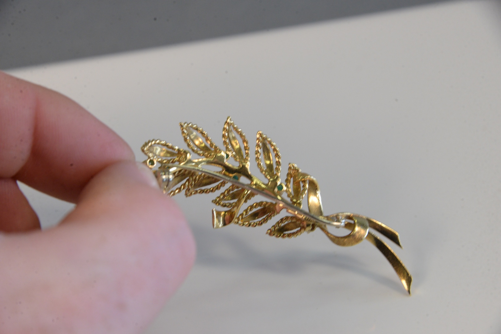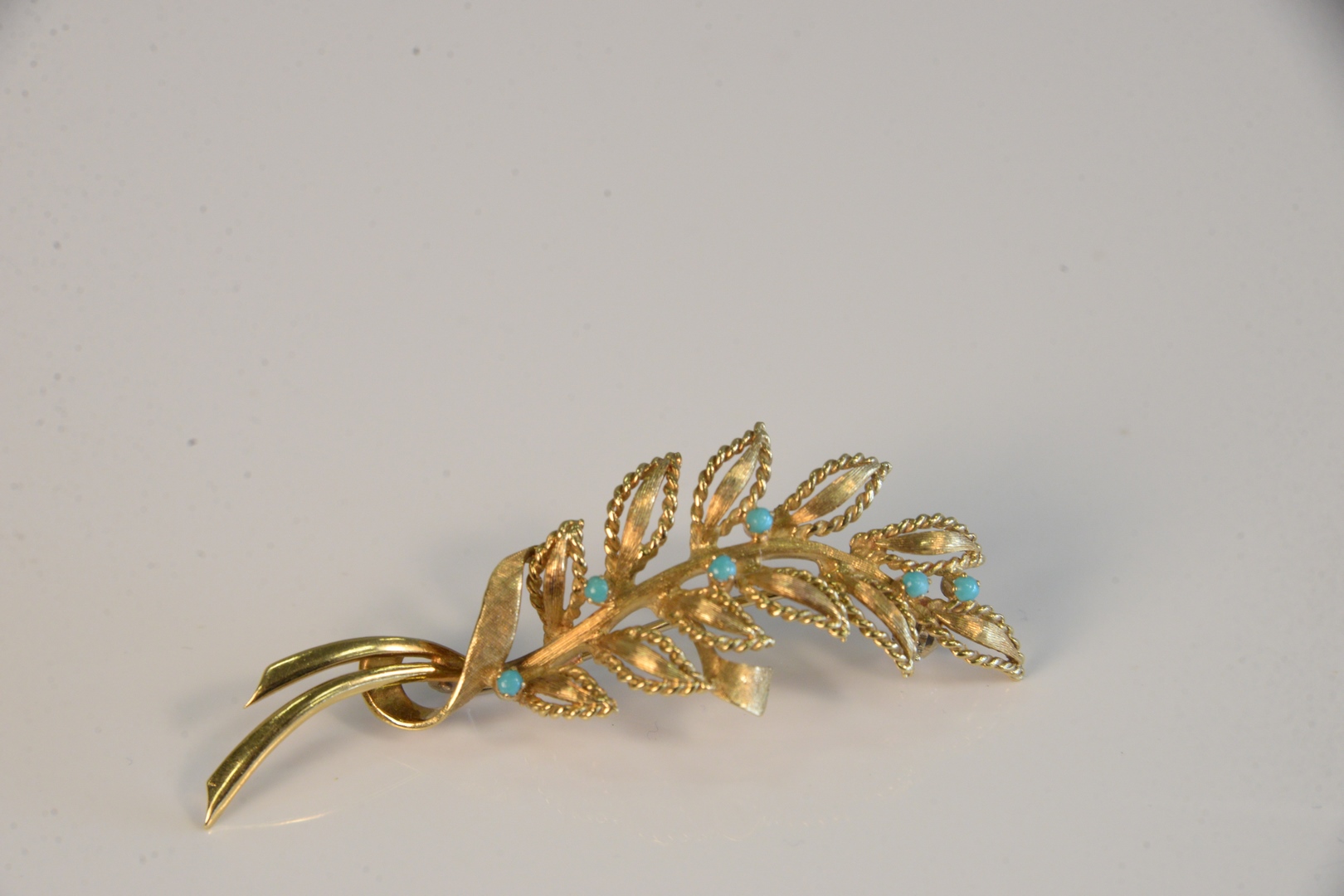 Lot 31: 18 Karat Gold Brooch with leaves and six small turquoise length 2 3/4 inches, 11.2 grams total weight Provenance: From the Lance & I…