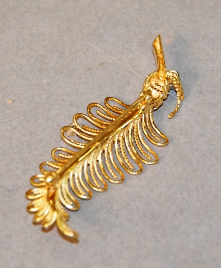 18kt gold leaf shaped pin set with two diamonds. length 2 1/2in. 8.4 grams
