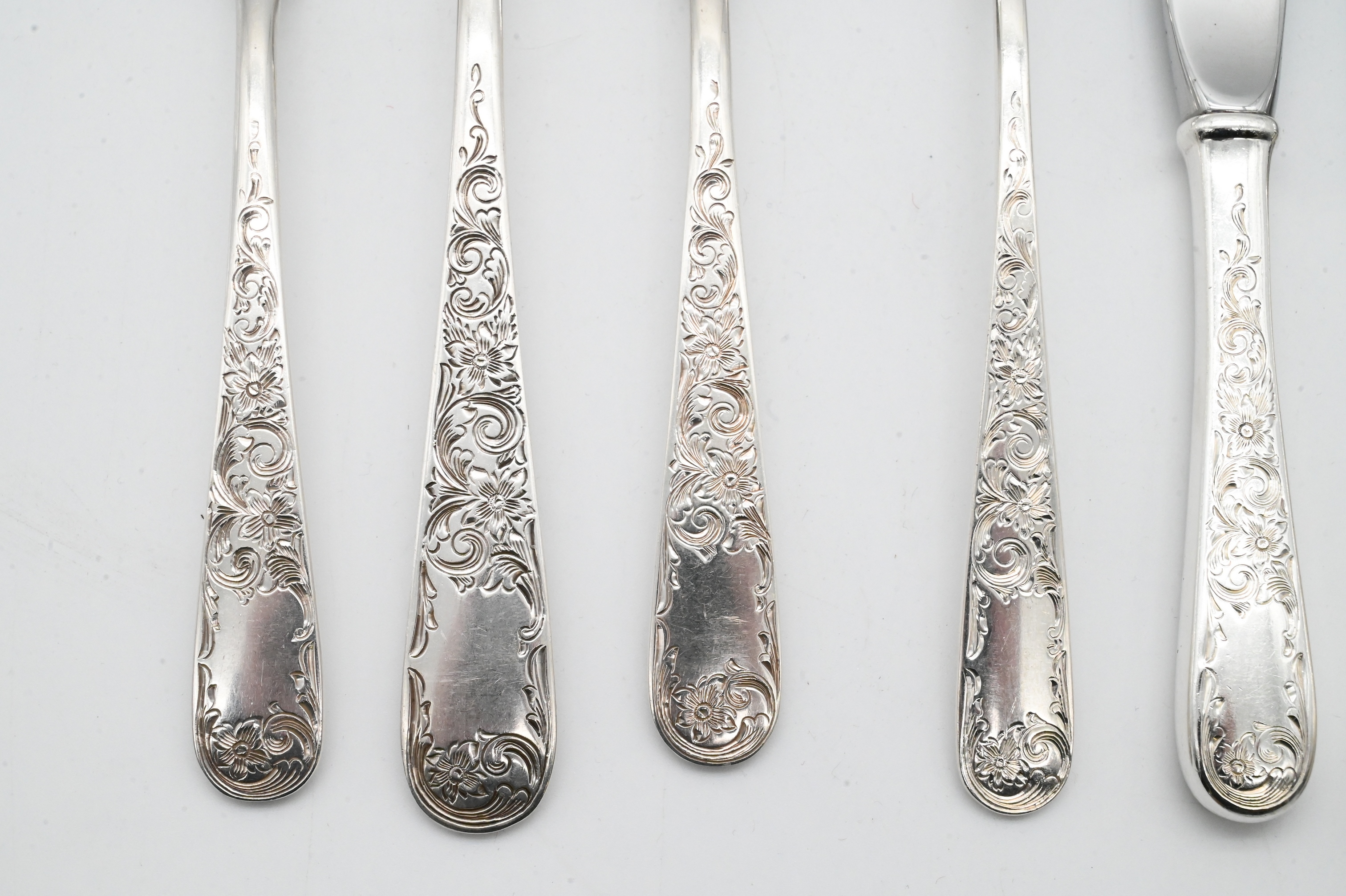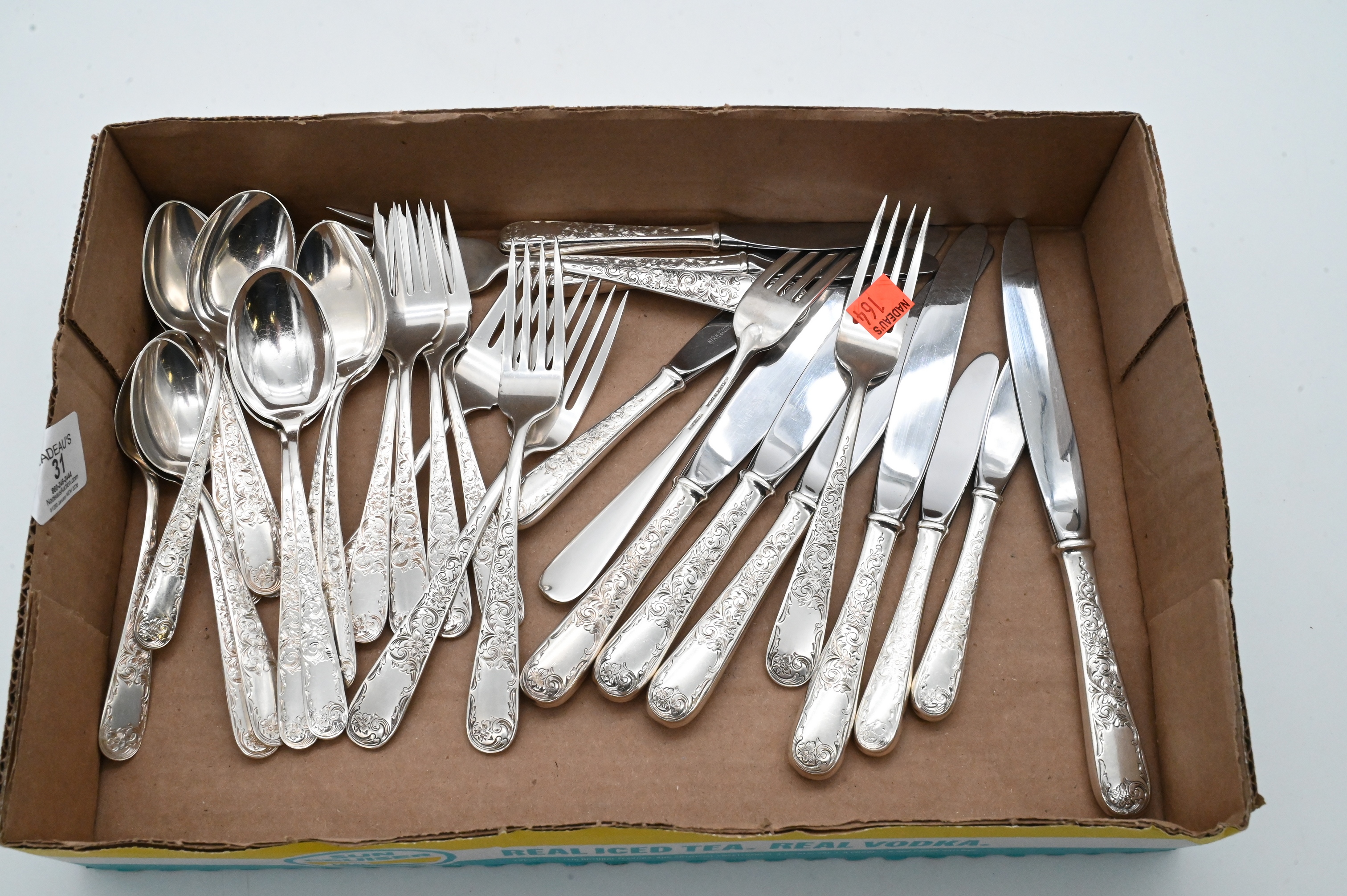 a set for 6 to include 6 luncheon forks, 6 salad / fish forks, 6 tablespoons, 6 teaspoons, 6 knives, and 6 butter knives