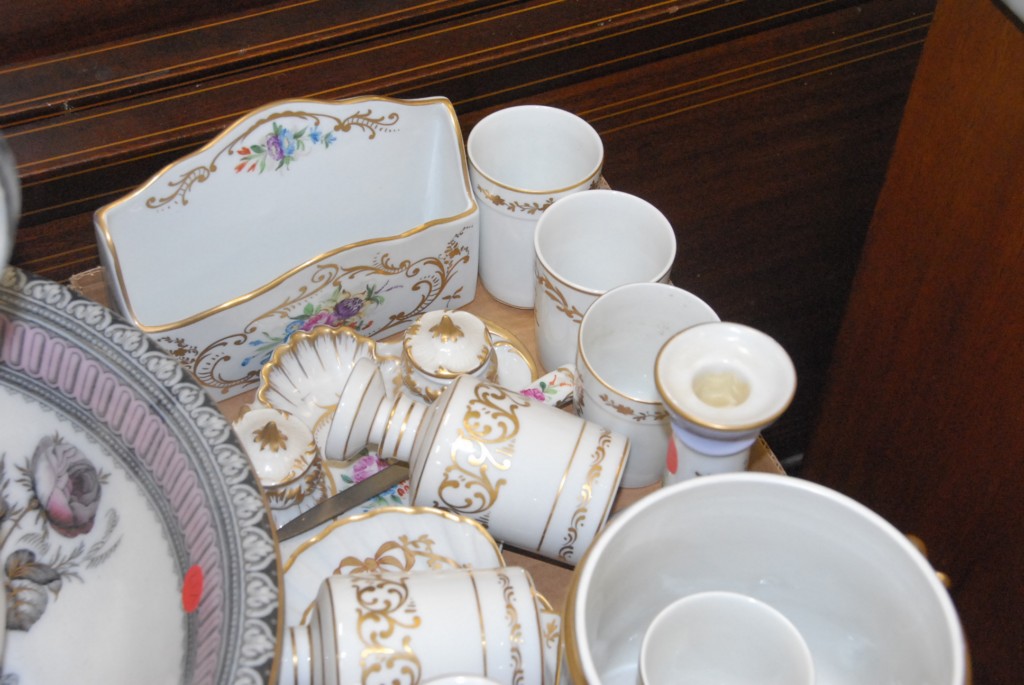 Box lot of Limoges pair of candlesticks with matching bowl, dresser set, ink well, letter holder, pitcher, bowl, etc.