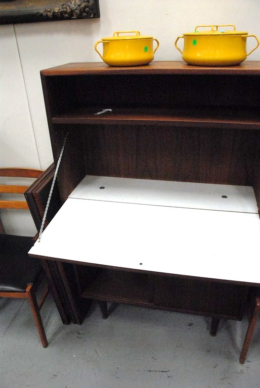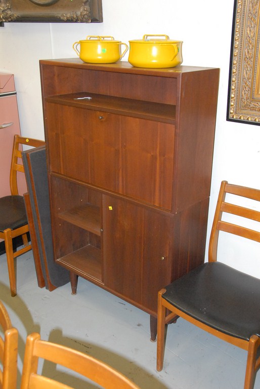 Danish Modern desk in two parts with cabinet base having sliding doors, ht. 53in. wd. 34in.