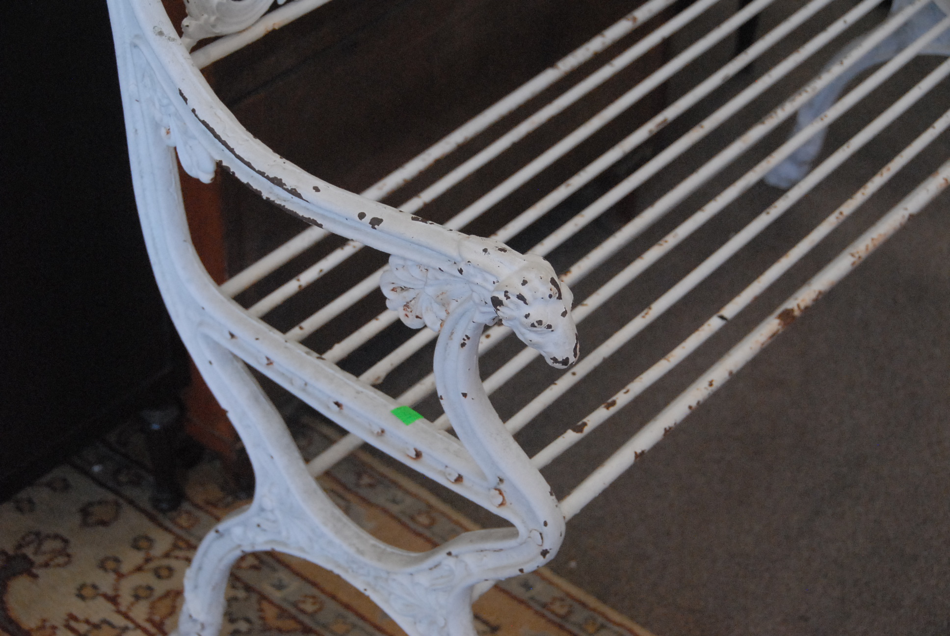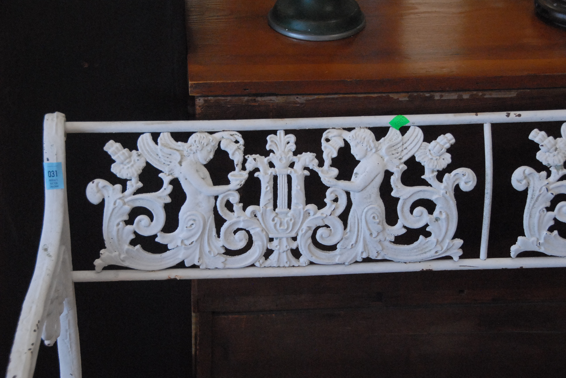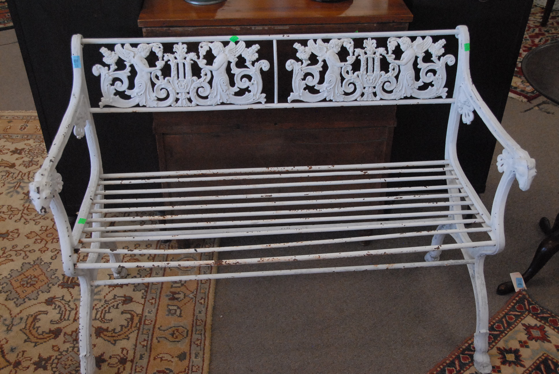Iron outdoor bench with ram’s head arms and putti back, lg. 43 1/2in.