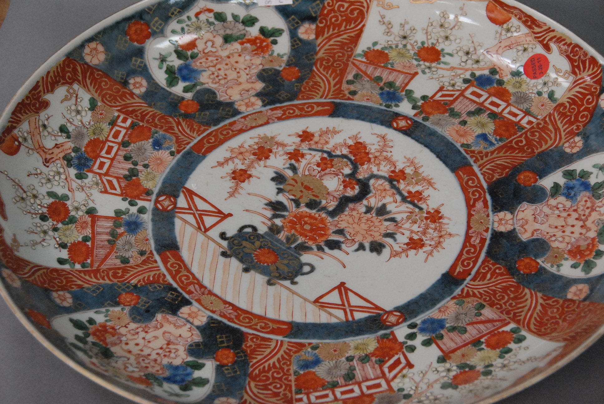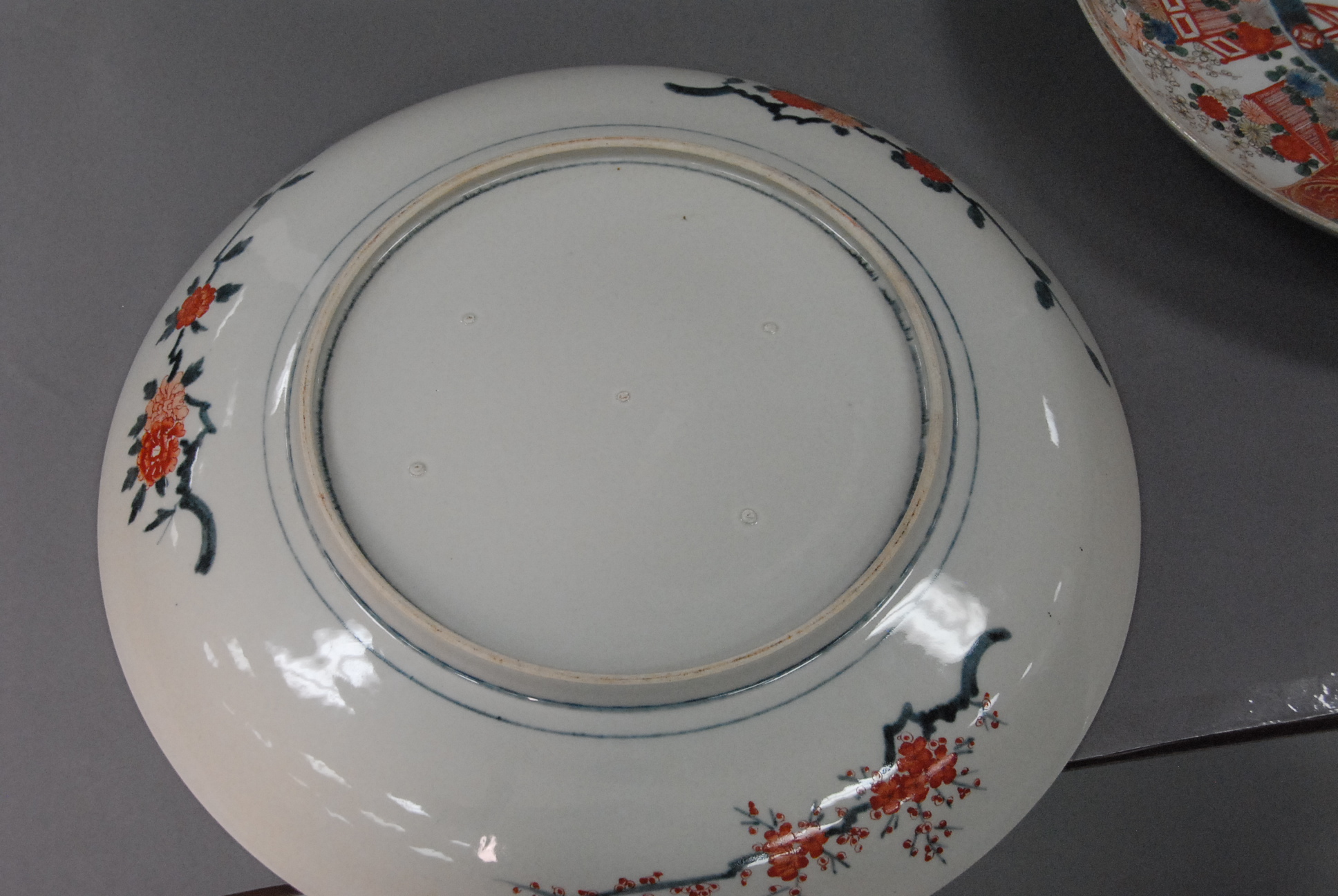 Large pair of Japanese Imari chargers with central floral basket, Mejia/Taisho period, early 20th century.