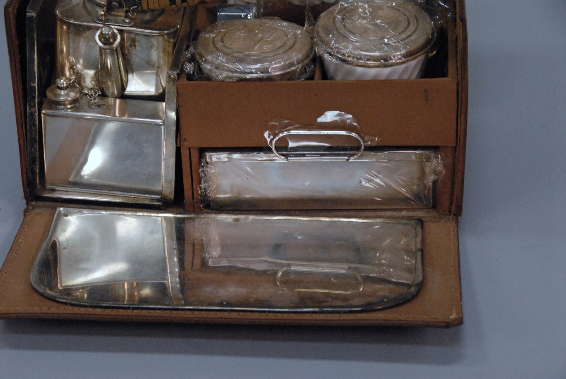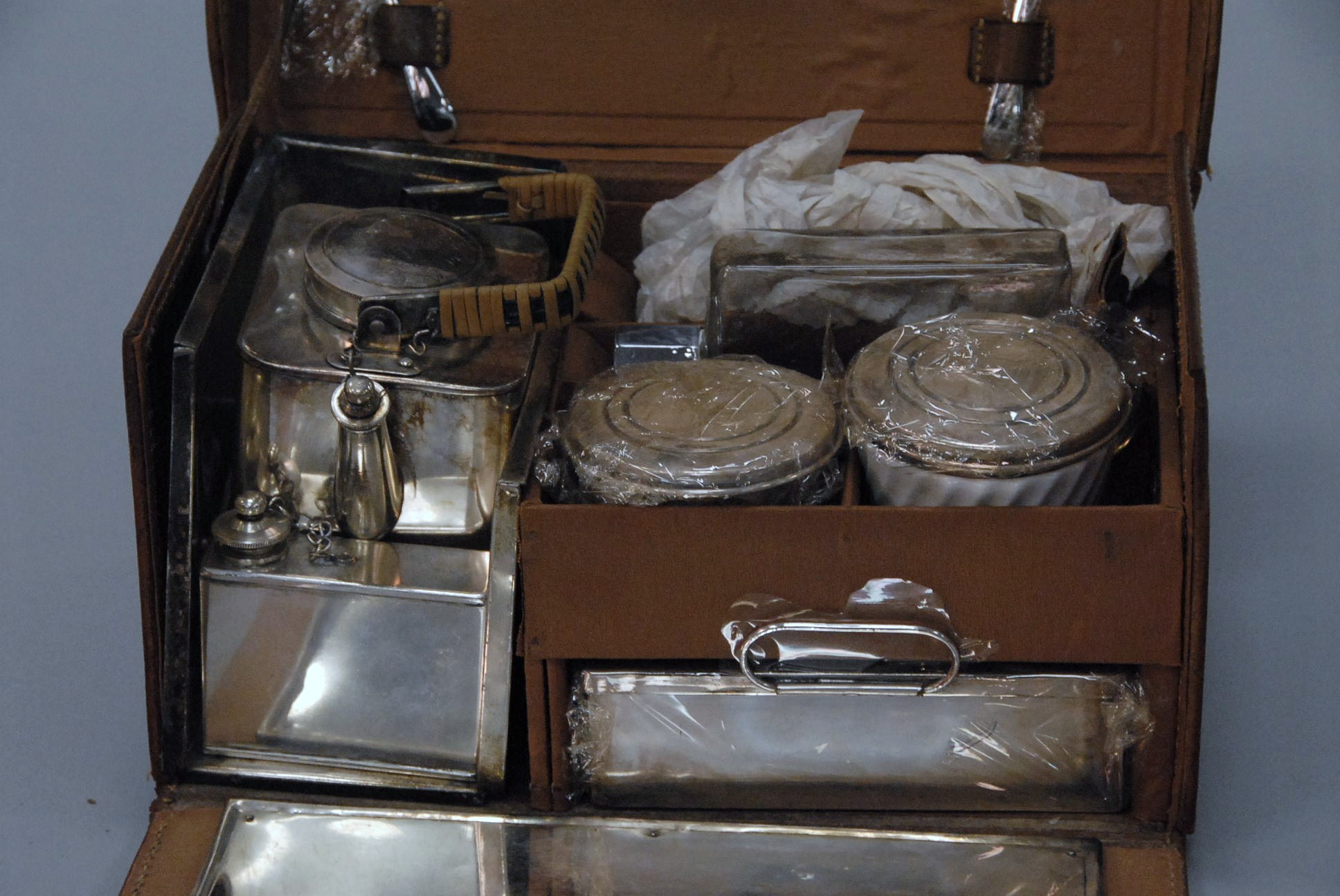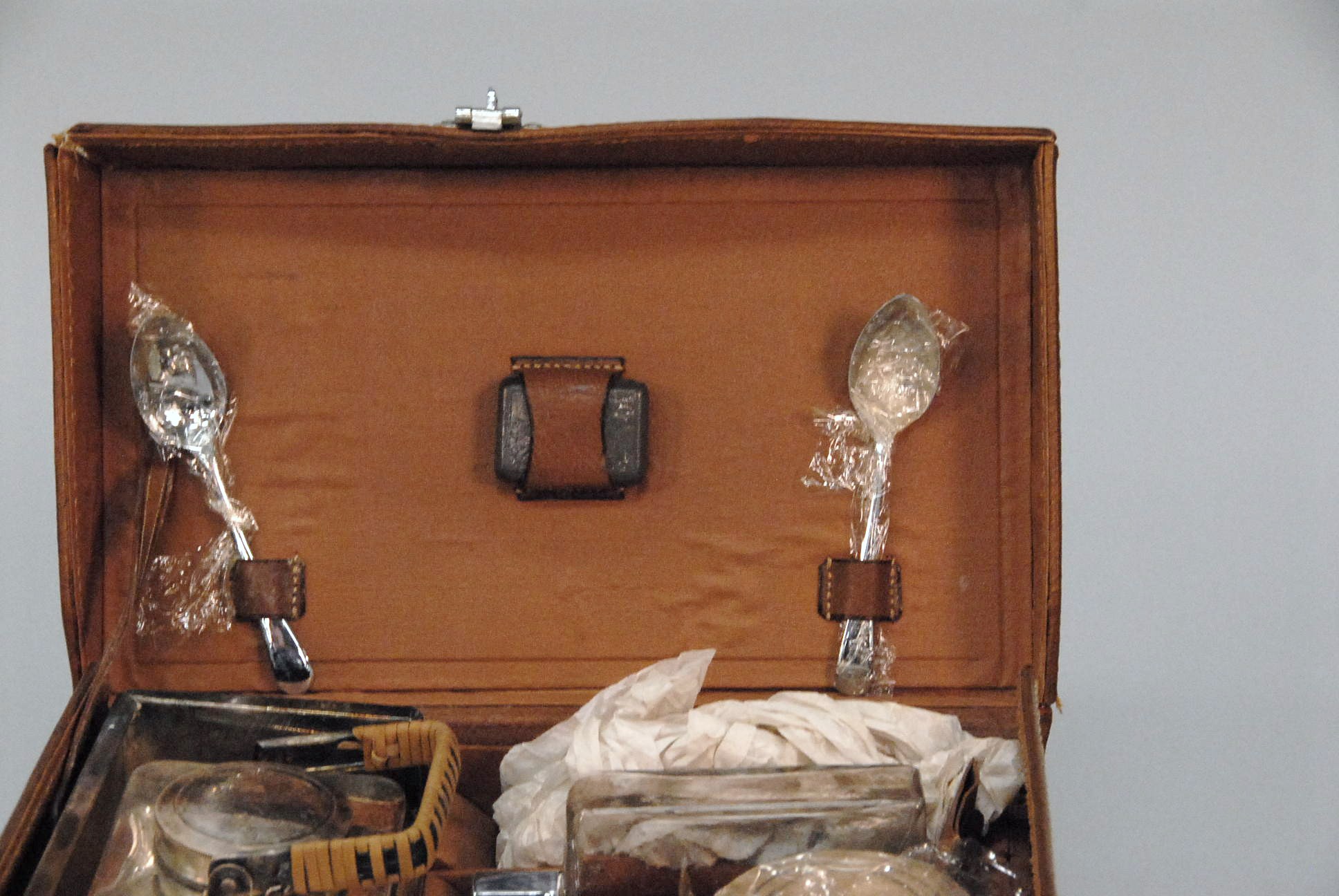 Leather case with a English picnic set including teapot, teacups, metal containers, plates, spoons, etc. marked Joseph Boyer