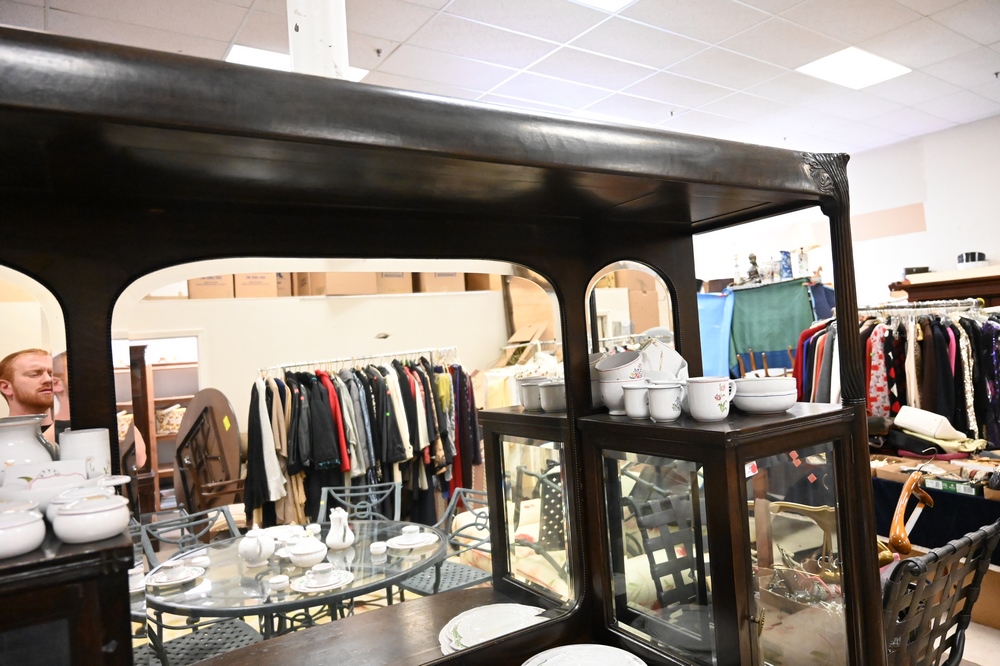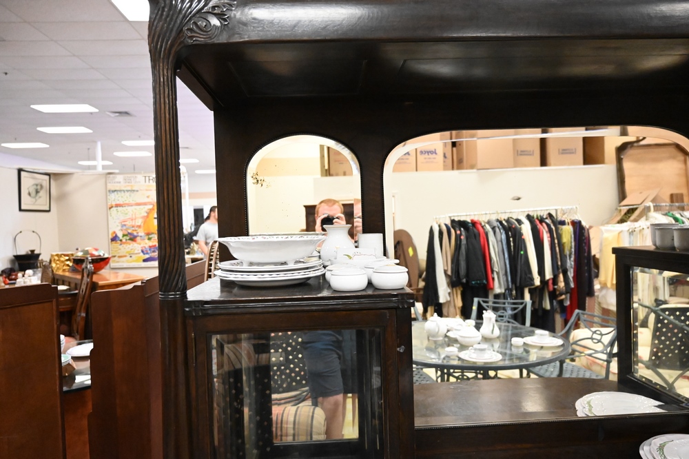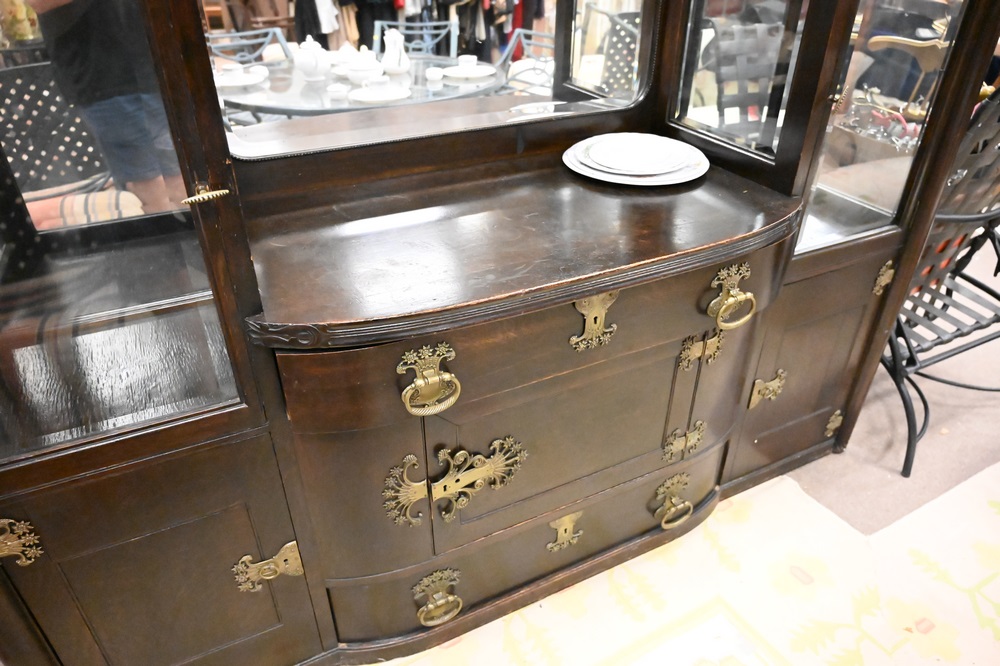 Lot 31: Oak Victorian Sideboard, having curio cabinet sides, art nouveau style, height 80 inches, width 79 inches.