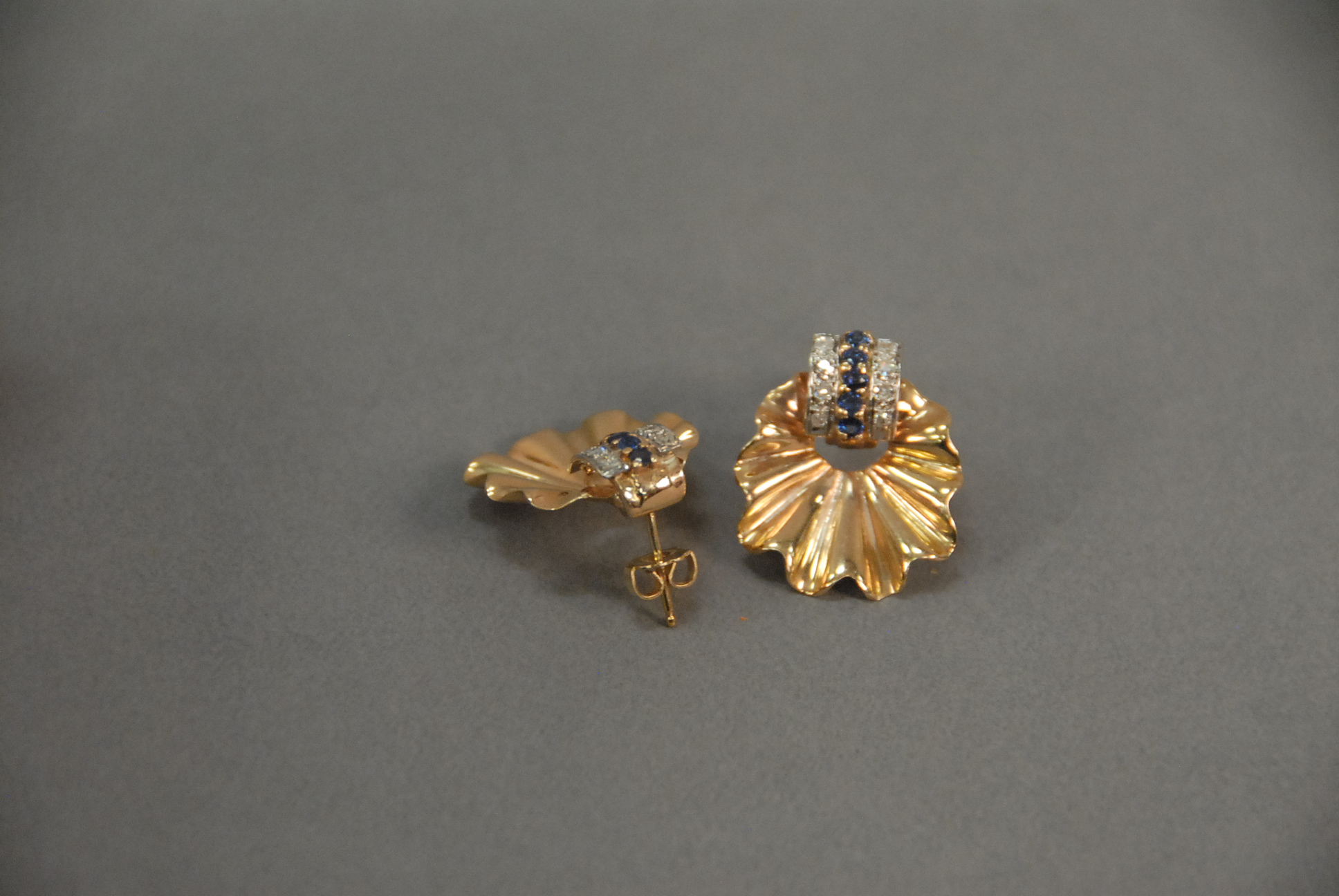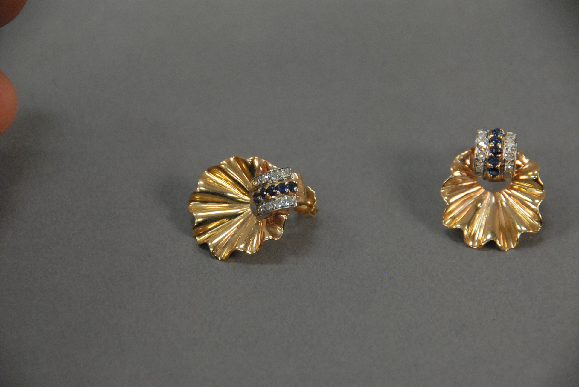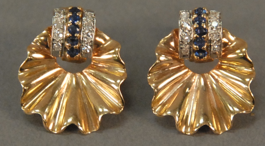Lot 31: Pair of 14K gold leaf design earrings, each set with eight diamonds and five sapphires. 9.1 grams