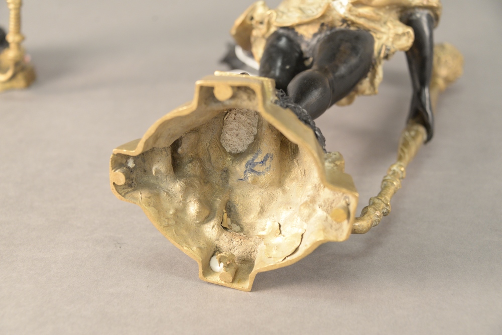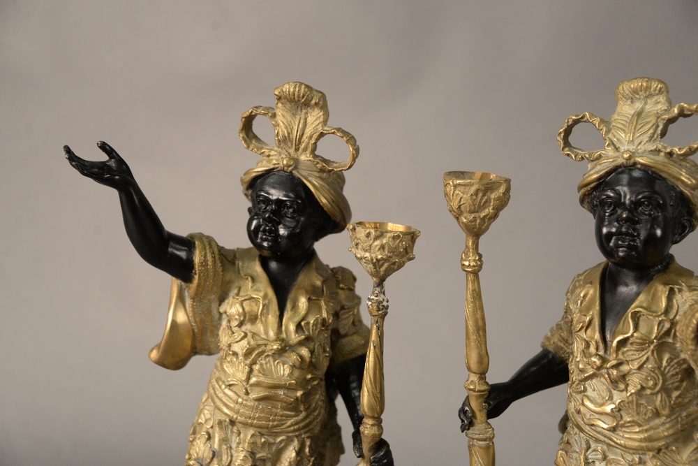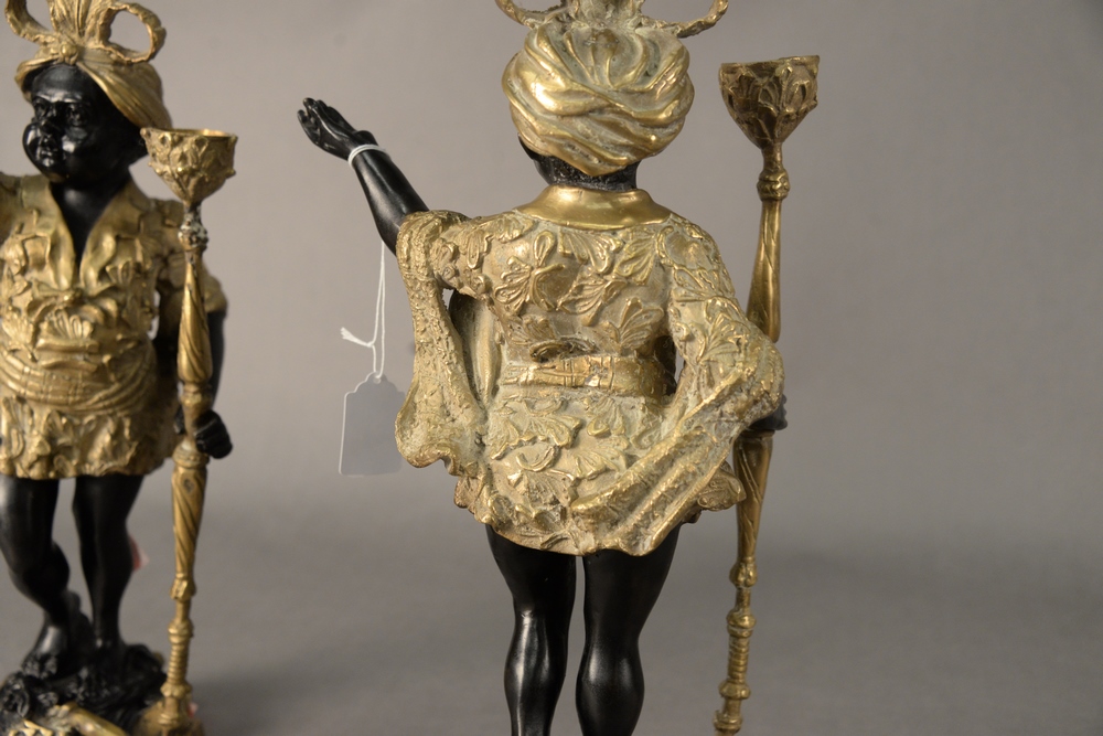 Pair of Bronze Blackamoor Figures, each holding a staff, height 16 inches.