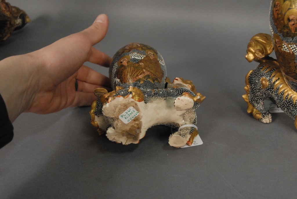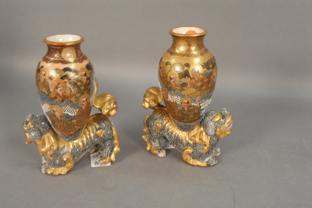 Pair of Satsuma vases on figural foo dogs, ht 7 1/2.
